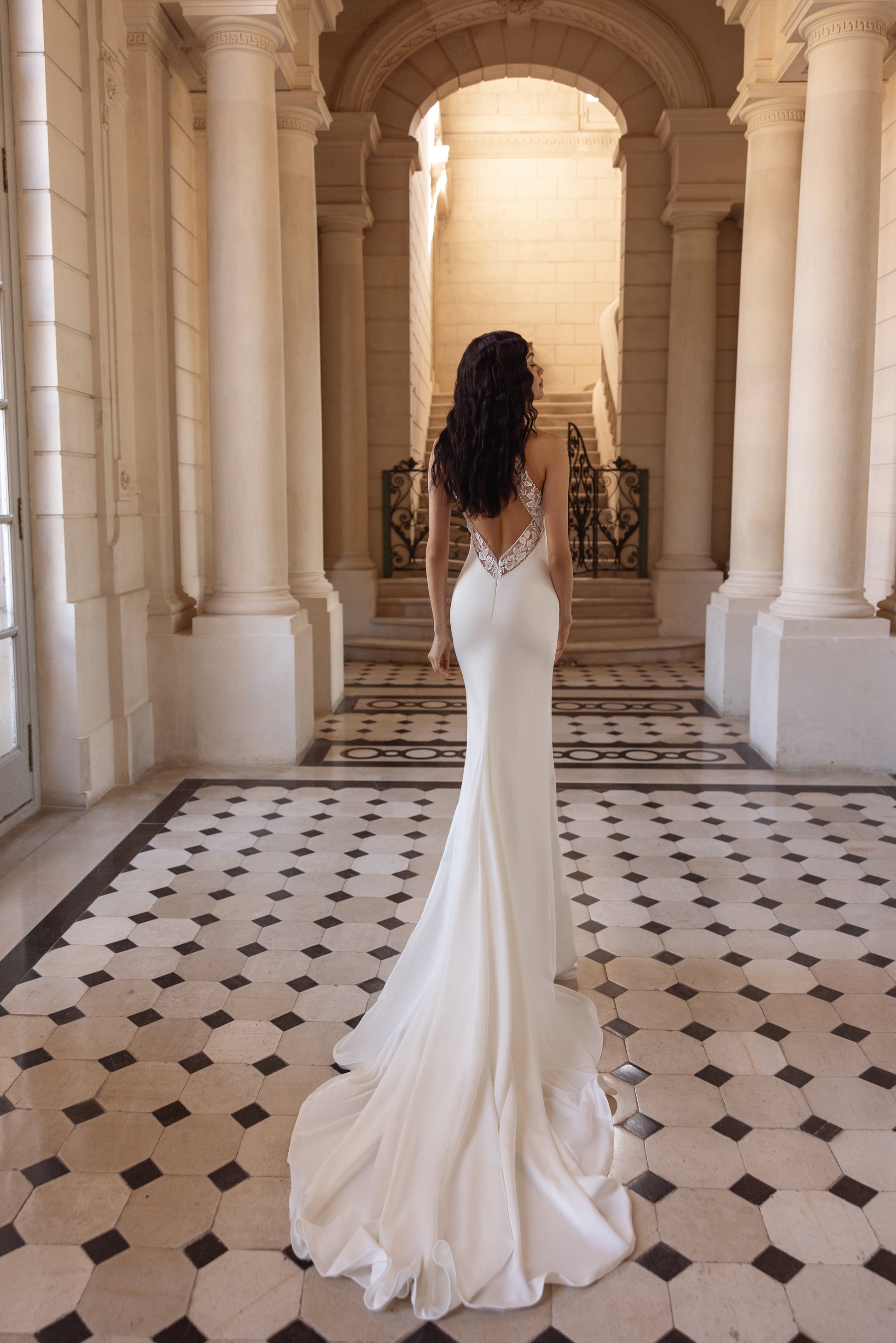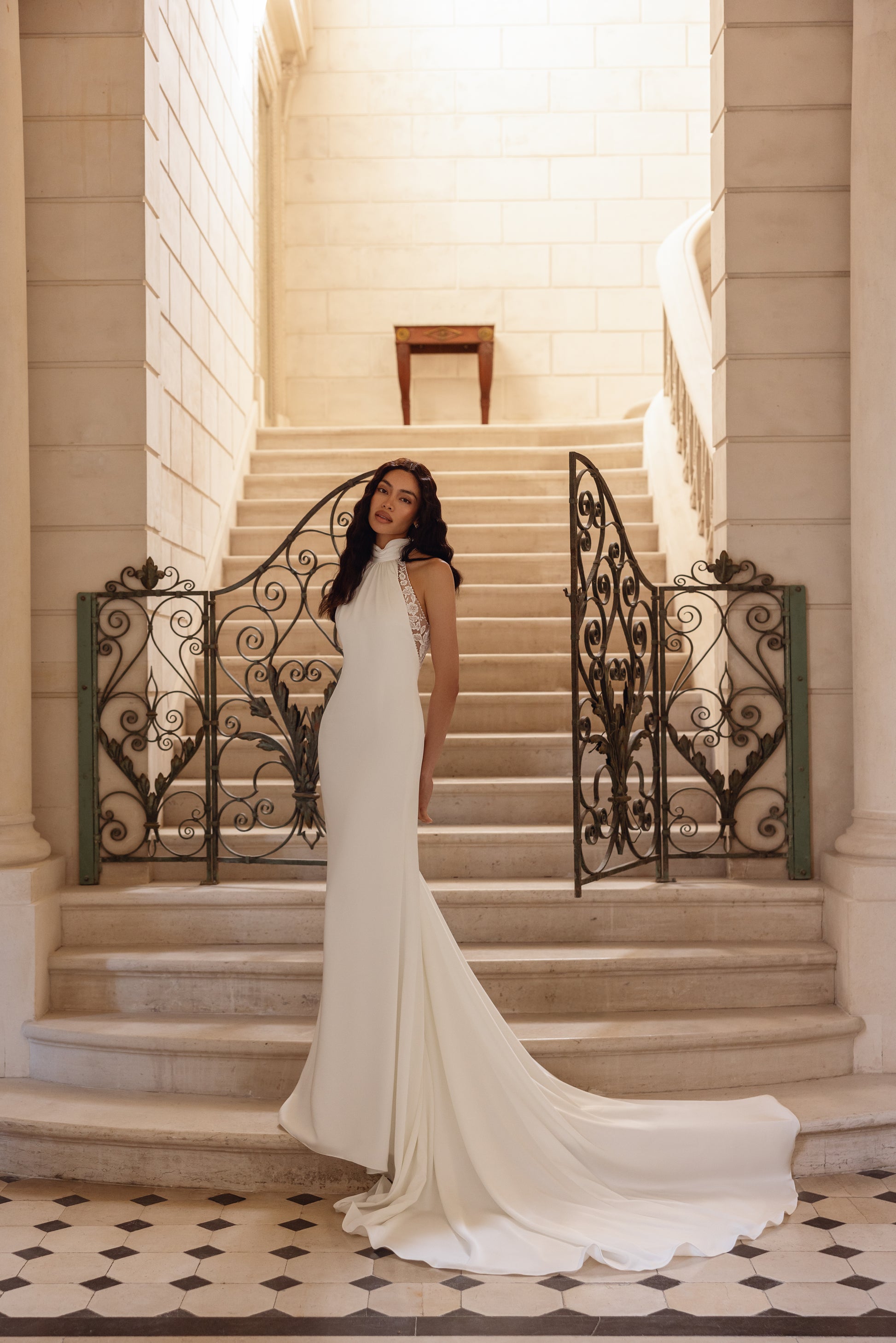 A satin gown in ivory that plays on contrasts: a high turtleneck and structured straight silhouette meet the softness of a pleated décolleté and a fluid train. The guipure lace adds a subtle romantic nuance, creating a look that feels both refined and disarming in its purity, with a quiet kind of timeless confidence.