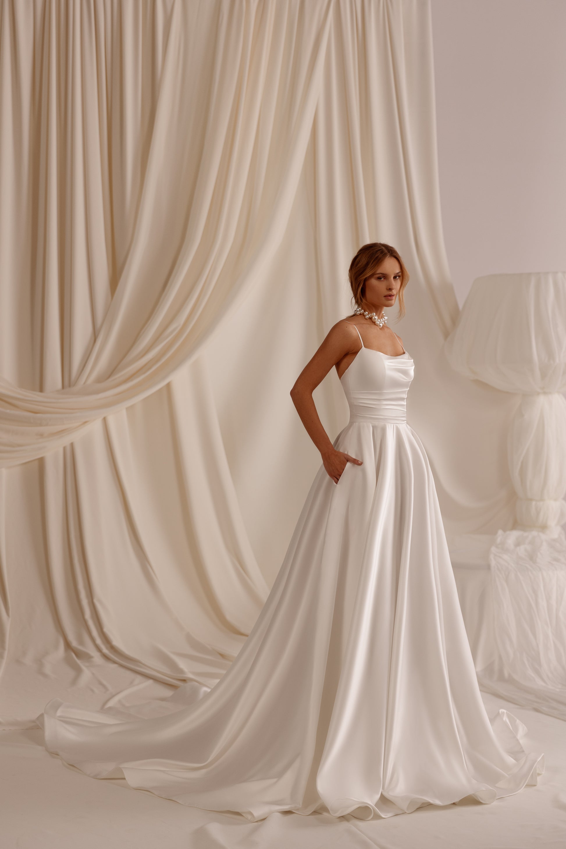 A delicate ivory satin gown defined by its understated elegance. Thin straps frame a structured bodice with glamorous flaps that flow seamlessly into a softly cascading train. The skirt features hidden pockets, adding a modern touch of practicality to this effortlessly relaxed yet refined design.