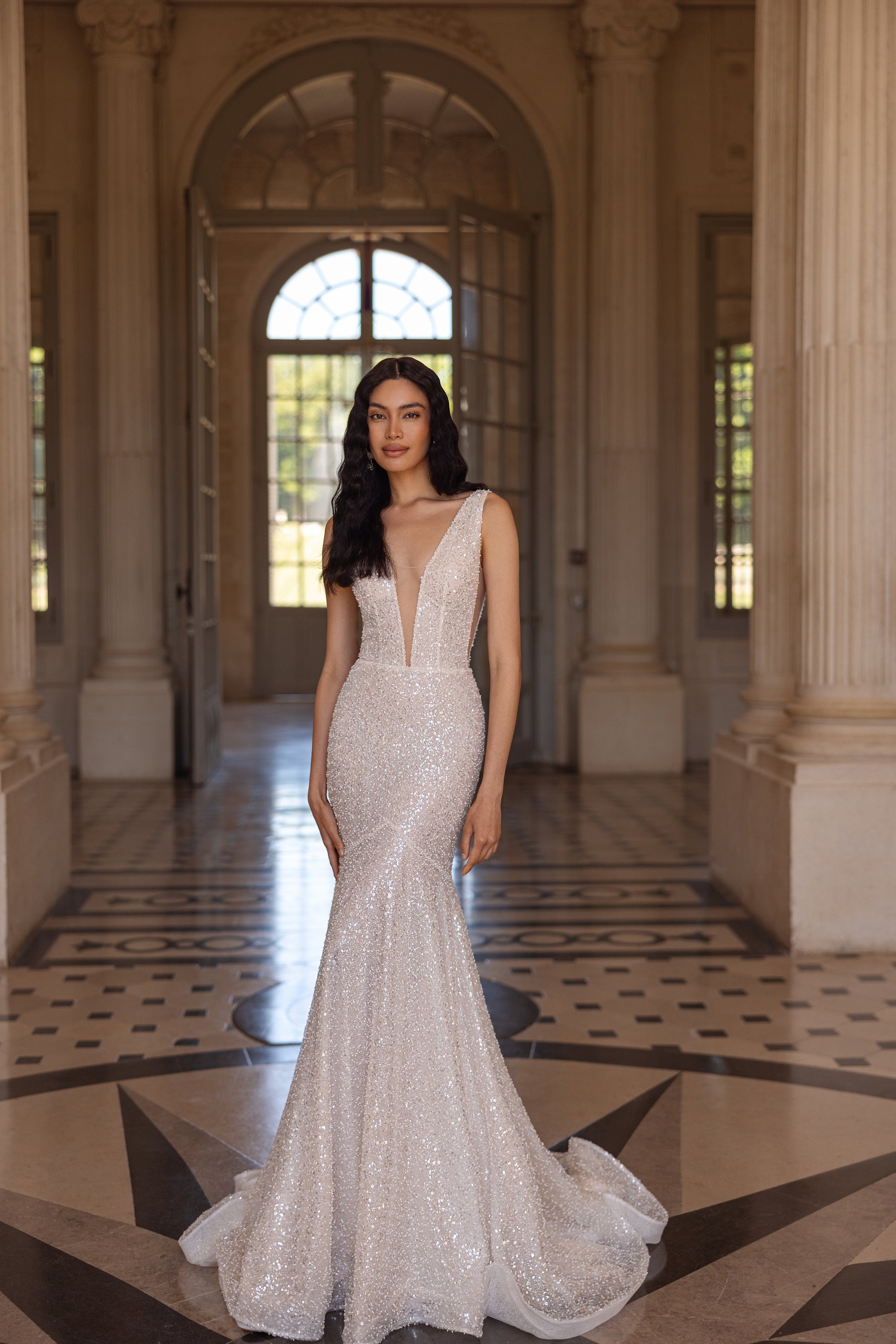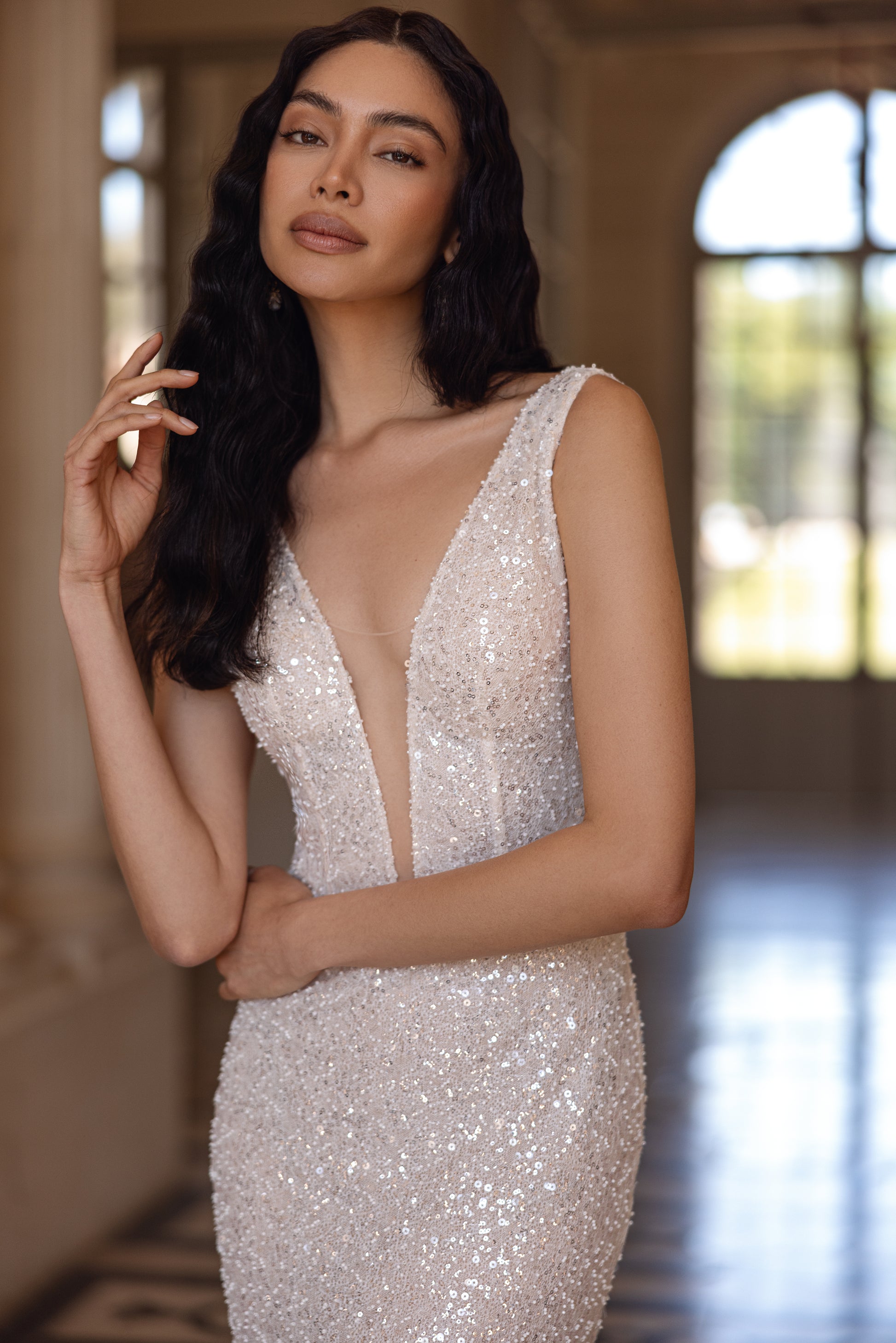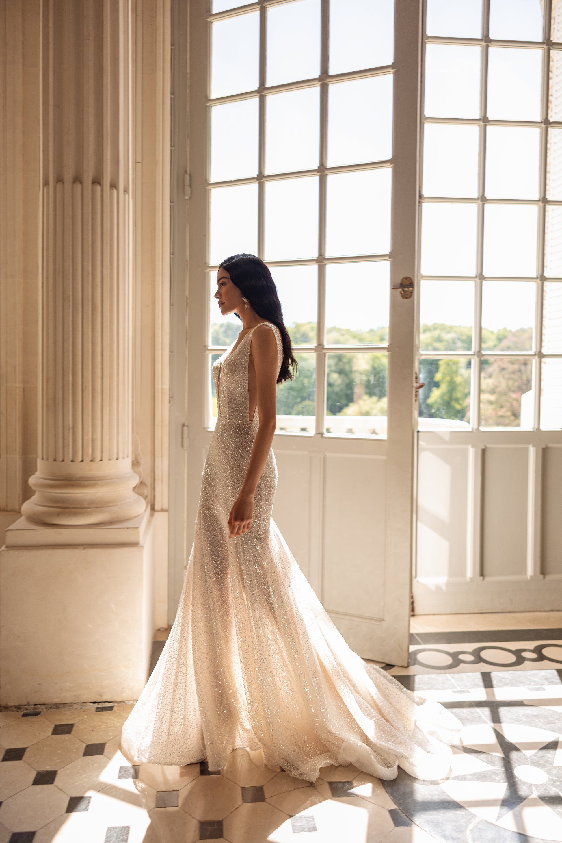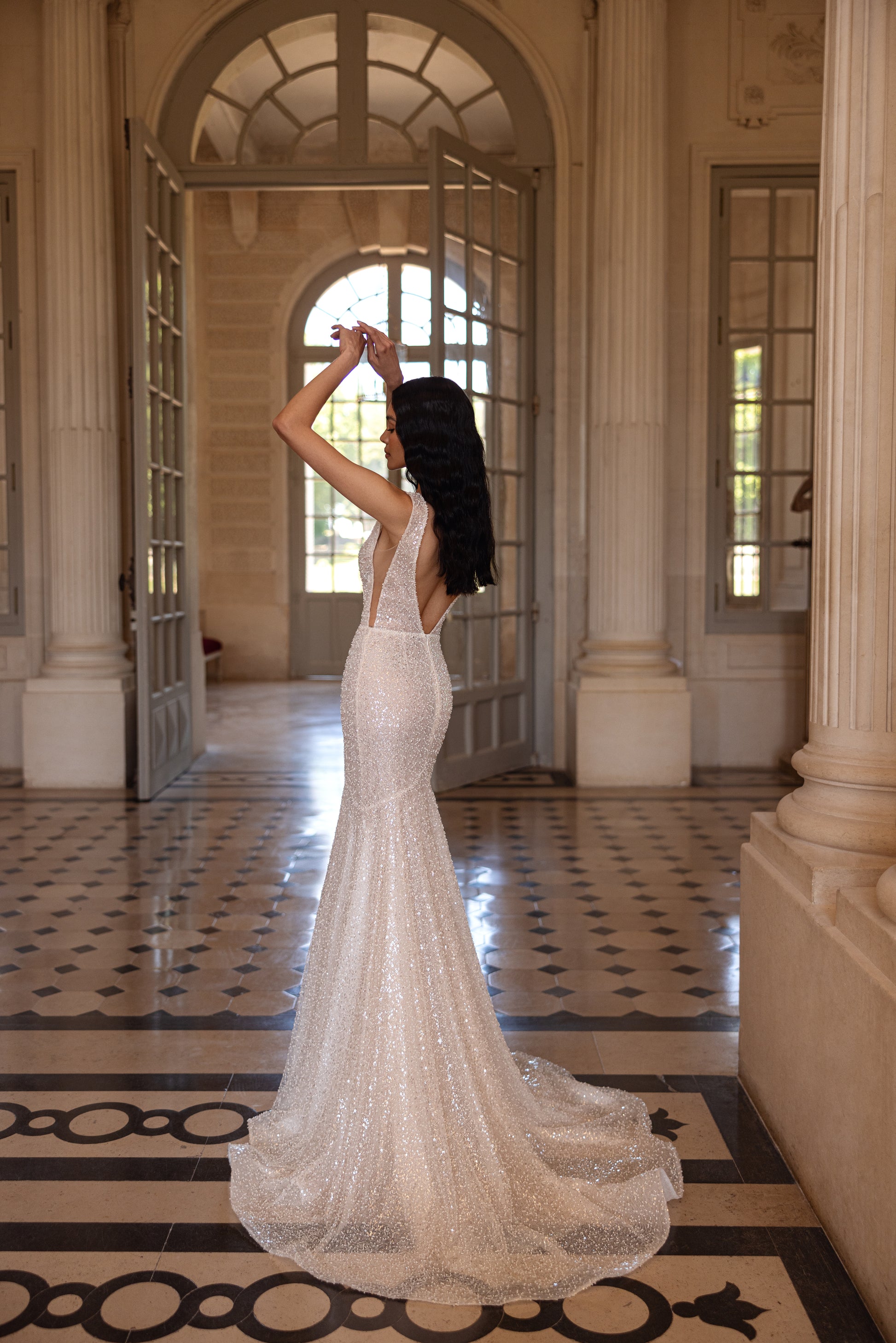 A cappuccino mermaid dress that exudes fluid, sophisticated elegance. Crafted from glittery fabric and sequin-embroidered lace, it features a deep V-neckline and transparent inserts that give the corset a light, sculpted feel. The skirt flares just below the hips, creating a graceful silhouette that flatters and elongates without trying too hard.