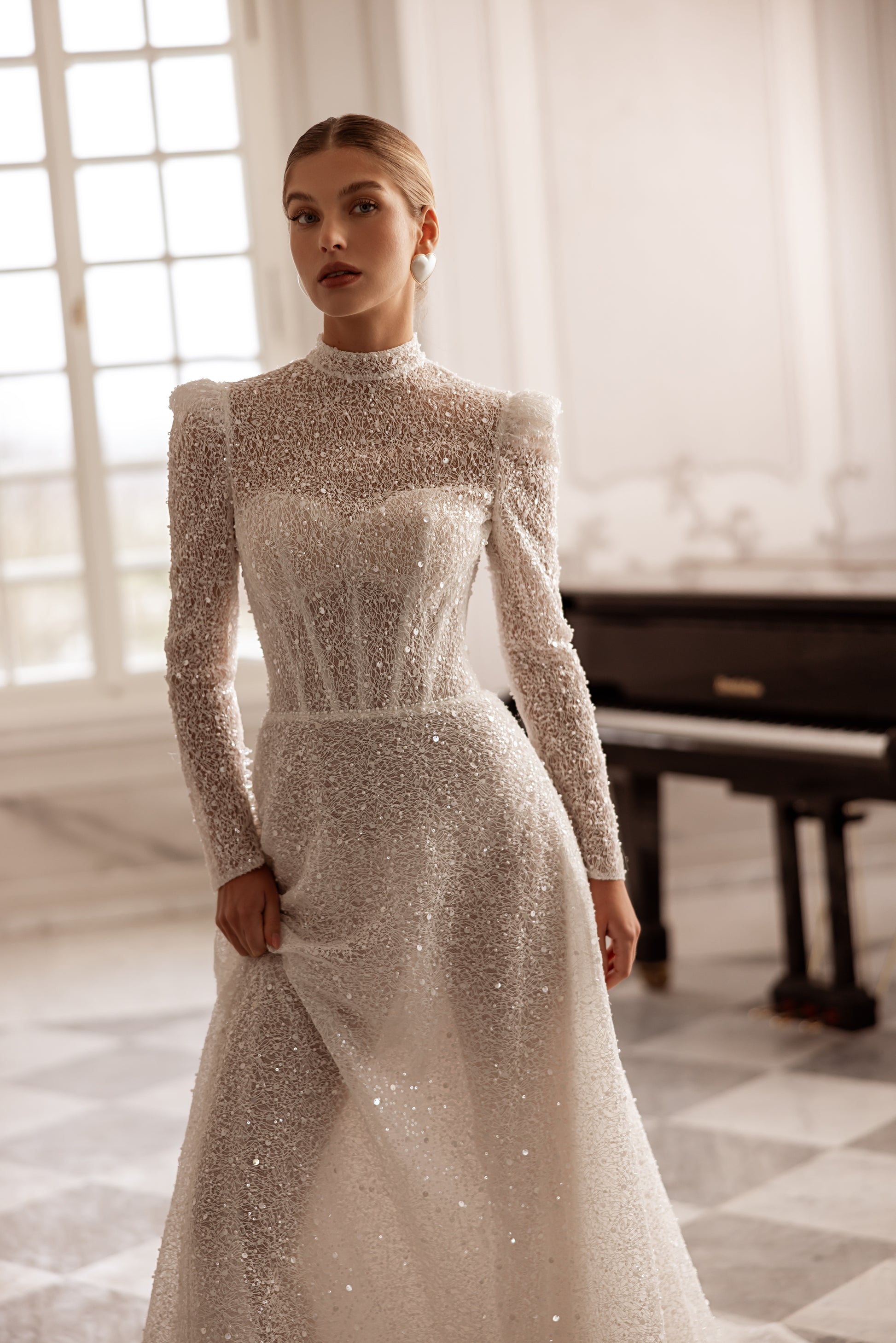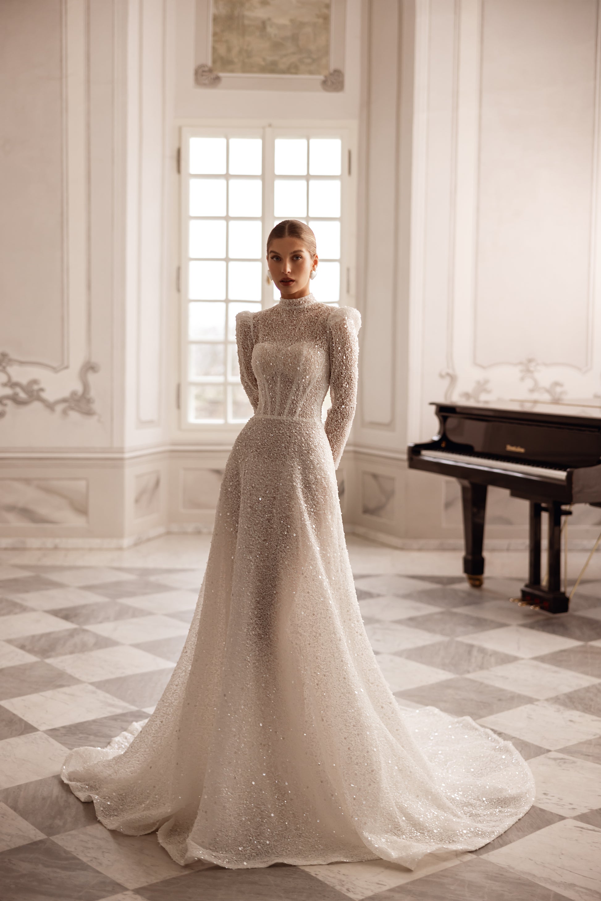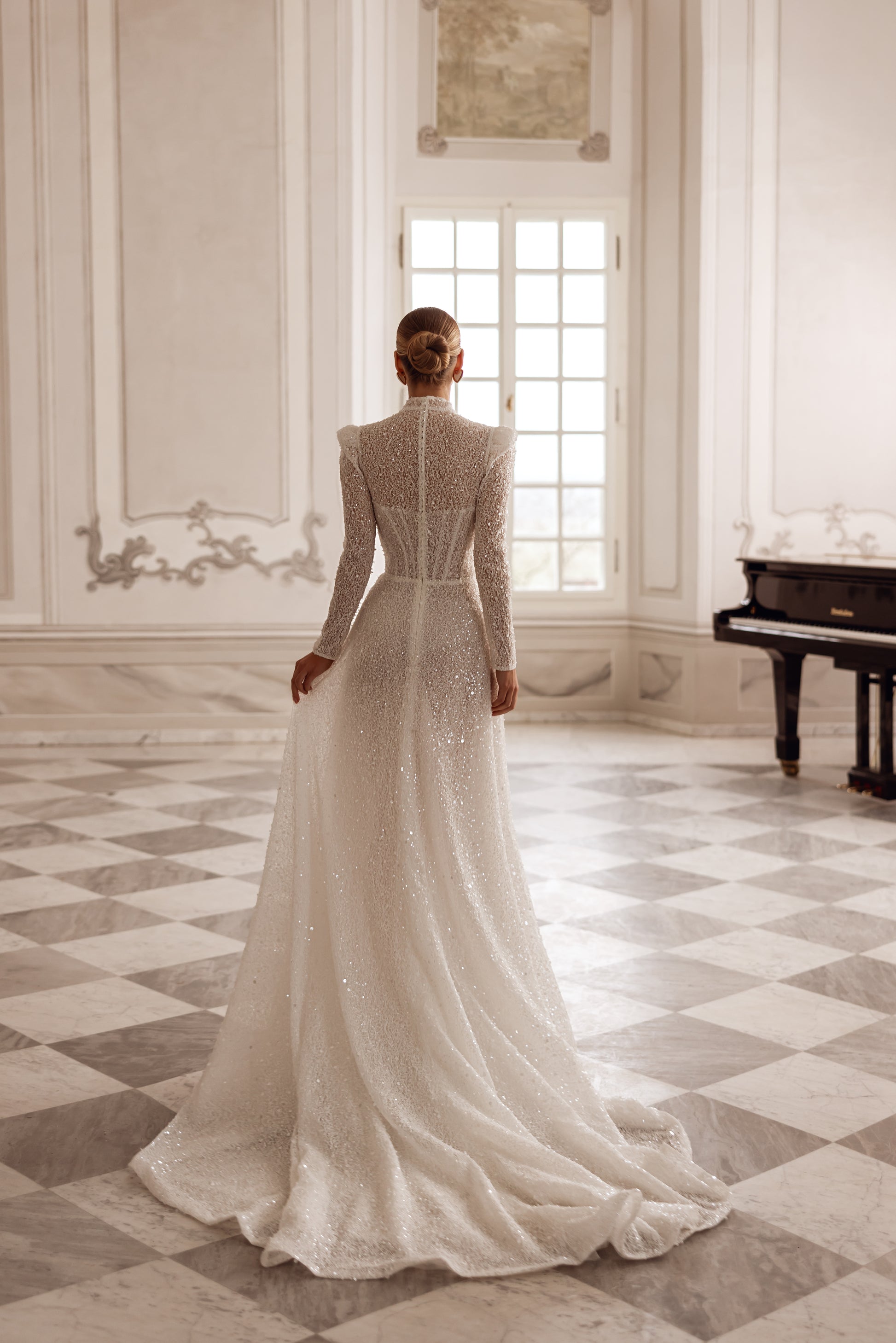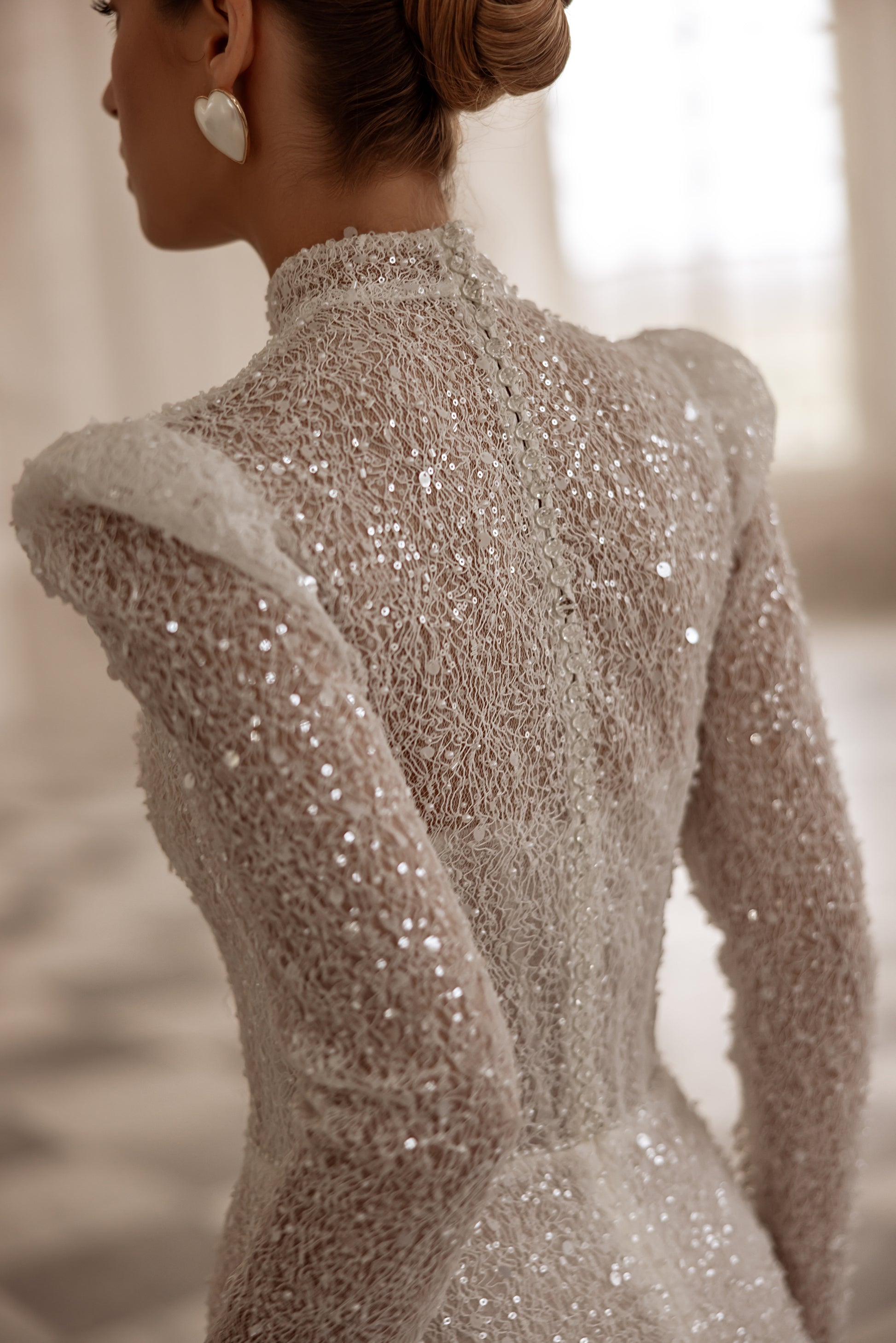 A delicate shimmer envelops this A-line gown, crafted from ivory or cappuccino beaded fabric adorned with sequins. The high turtleneck and handmade beaded belt create a refined, composed look, while the glistening details add a soft, mysterious allure. A flowing train completes the ensemble, capturing the balance between understated grace and captivating radiance.