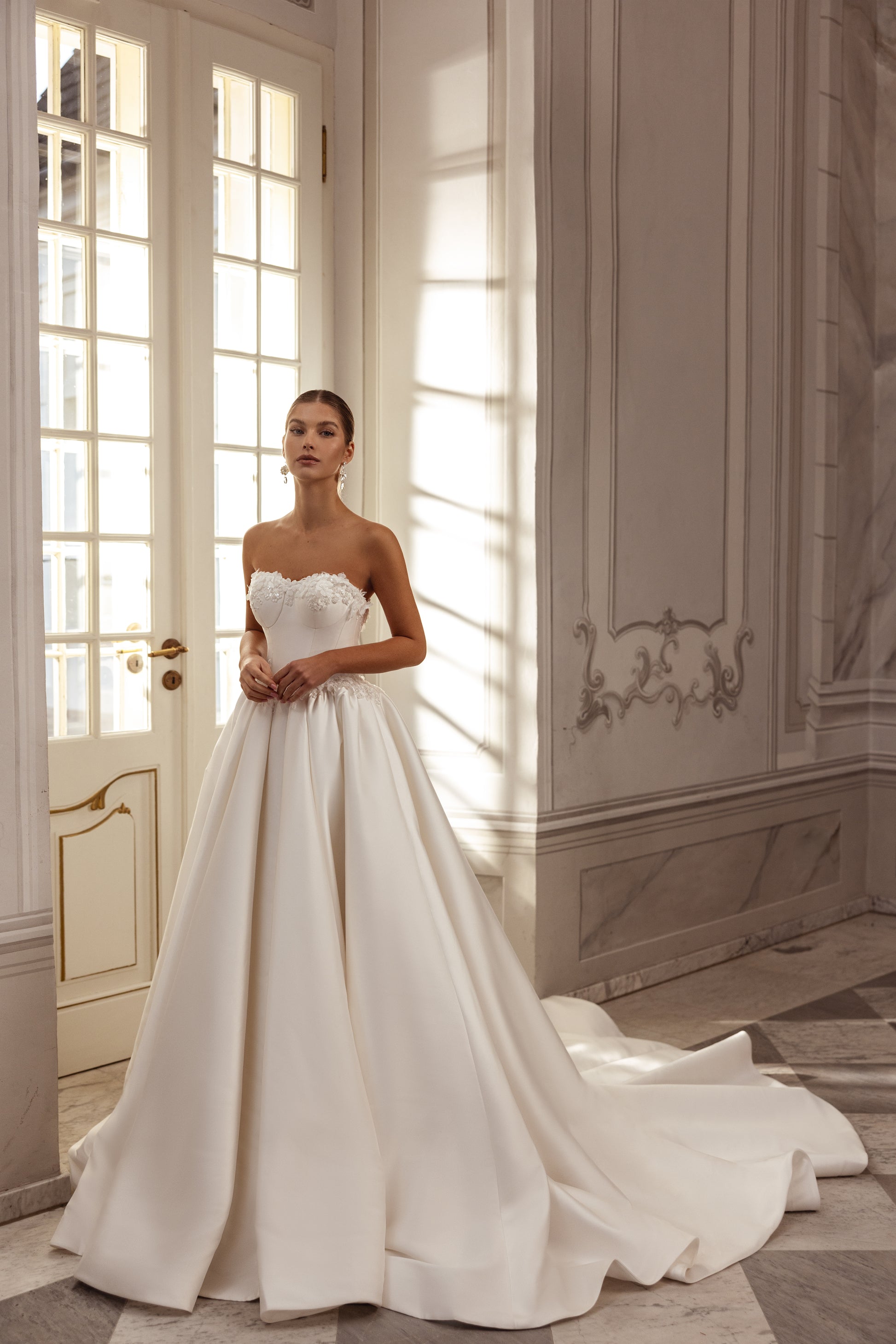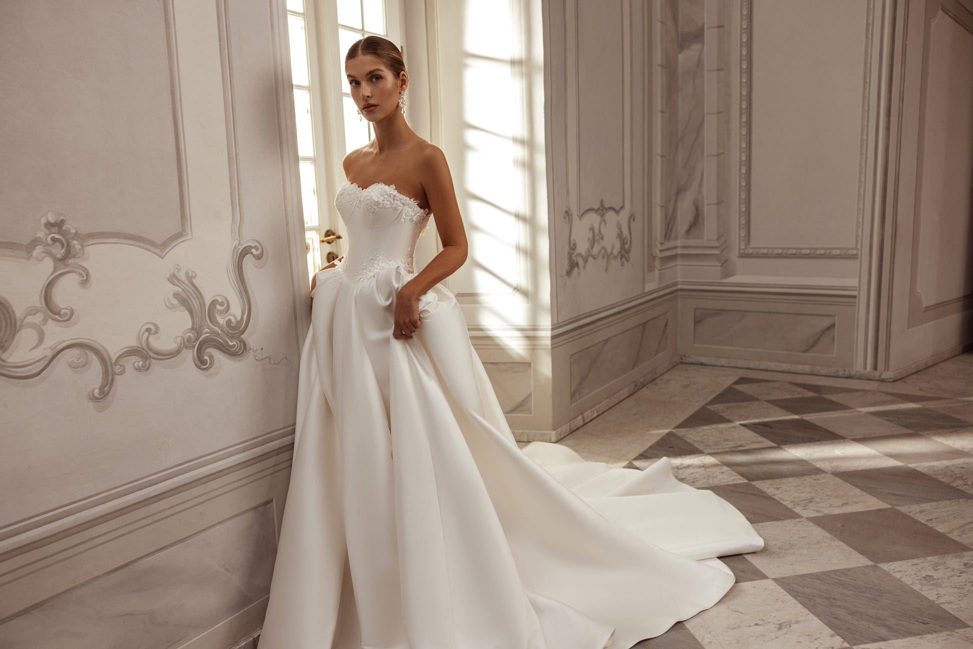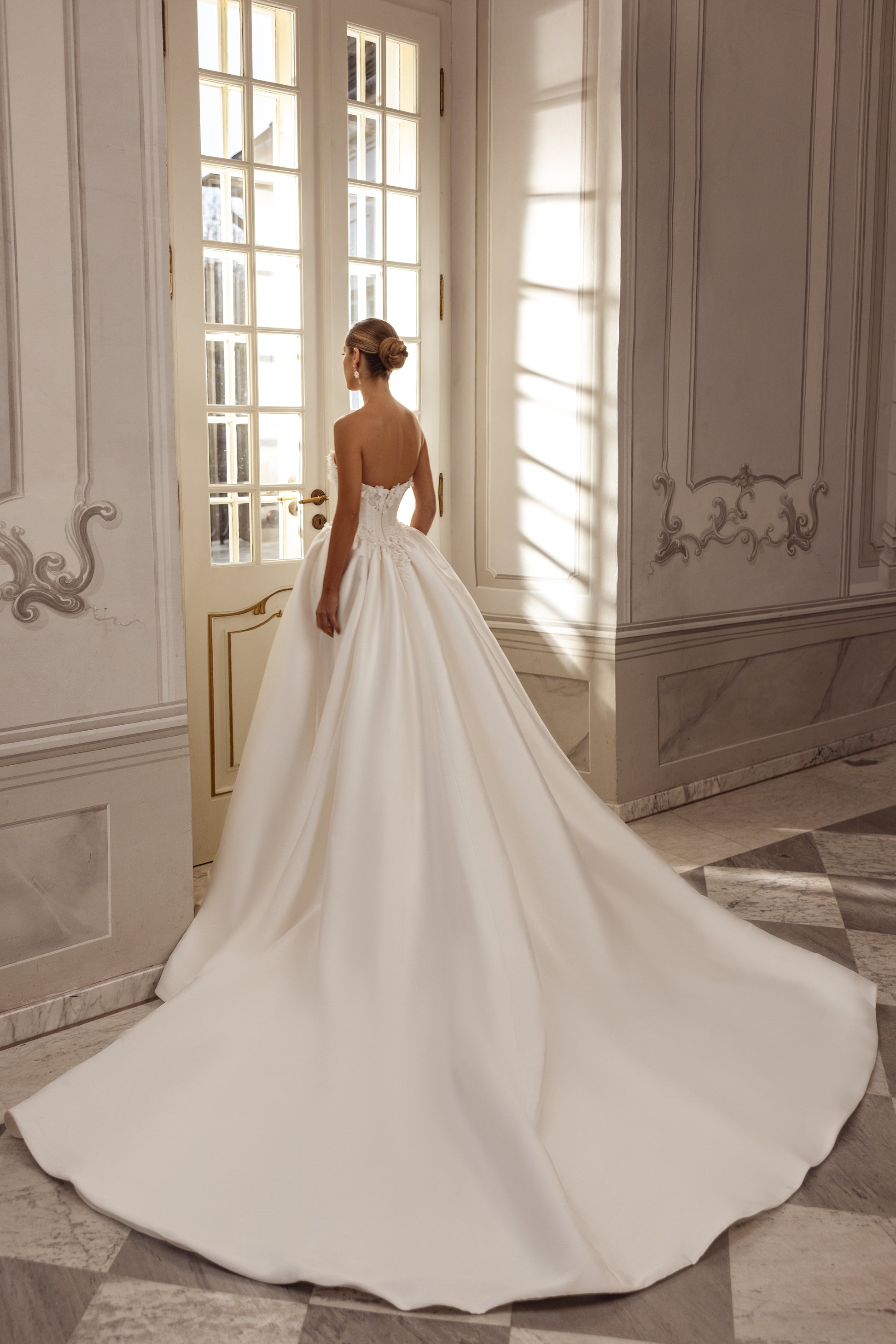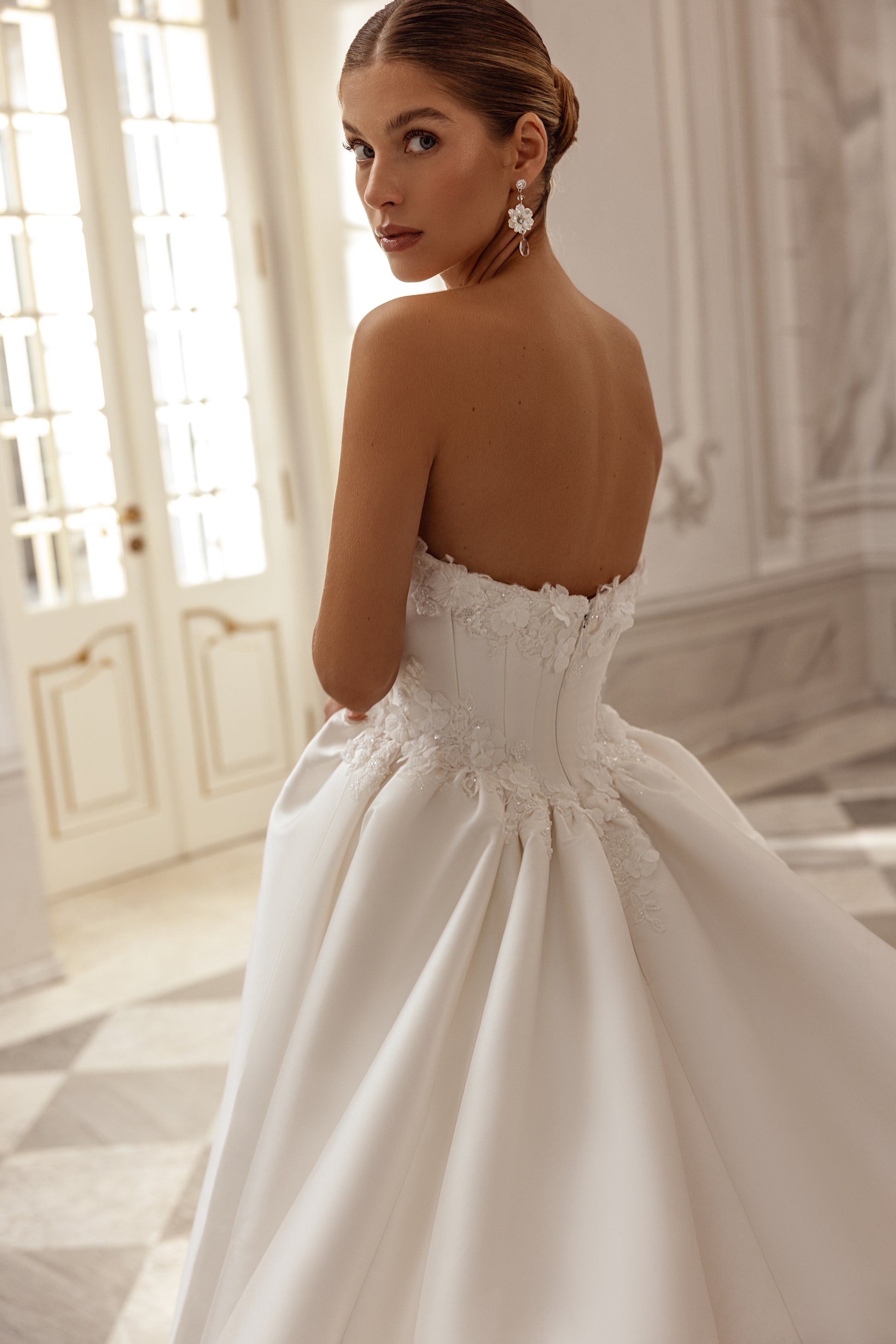 This ivory mikado princess gown is a masterpiece of structure and romance. The folded skirt sweeps into a majestic train, while delicate 3D flowers—handcrafted with precision—bloom along the sweetheart neckline and waistline, front and back. Elegant yet dreamy, it’s a vision of timeless beauty with a touch of fairytale magic.