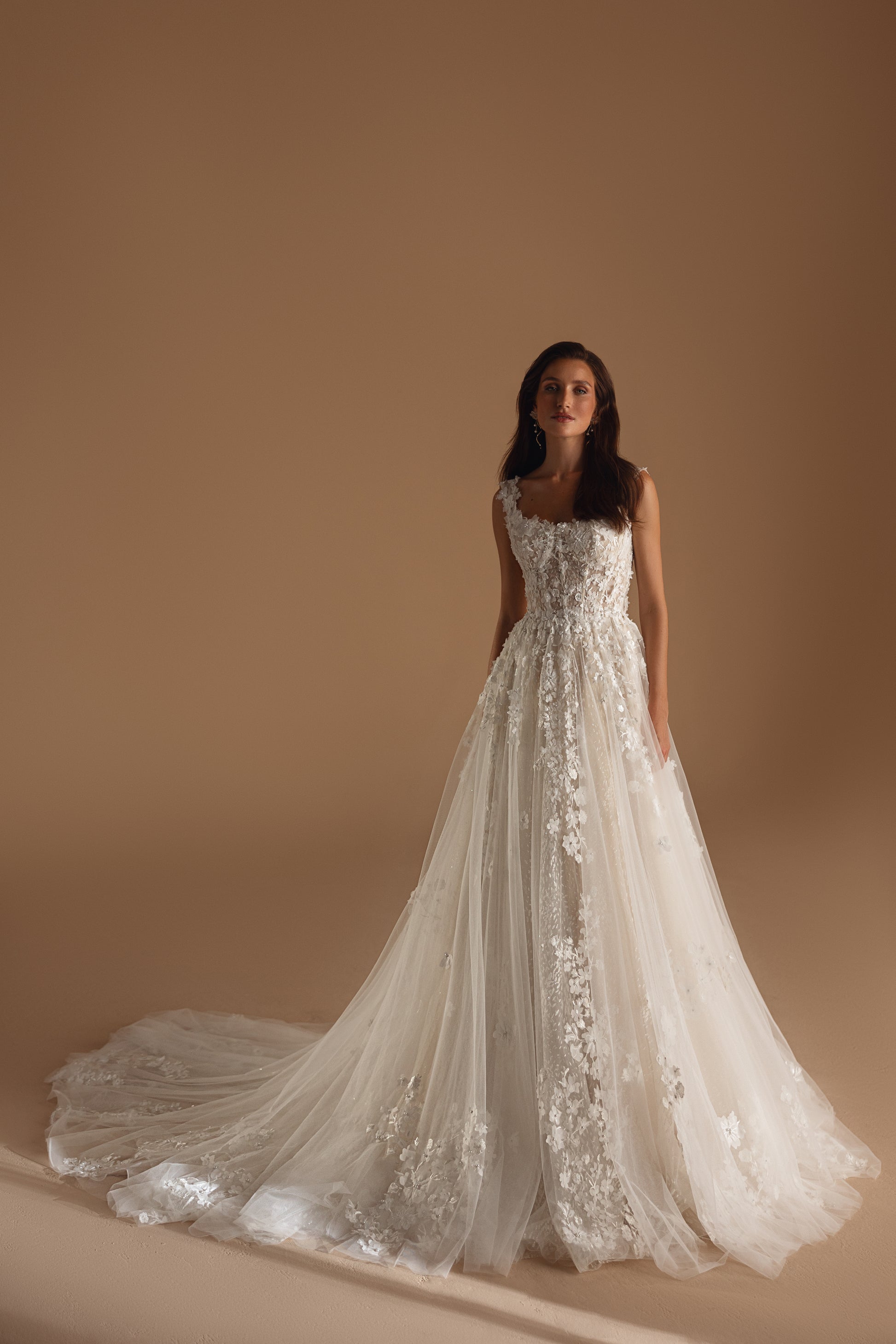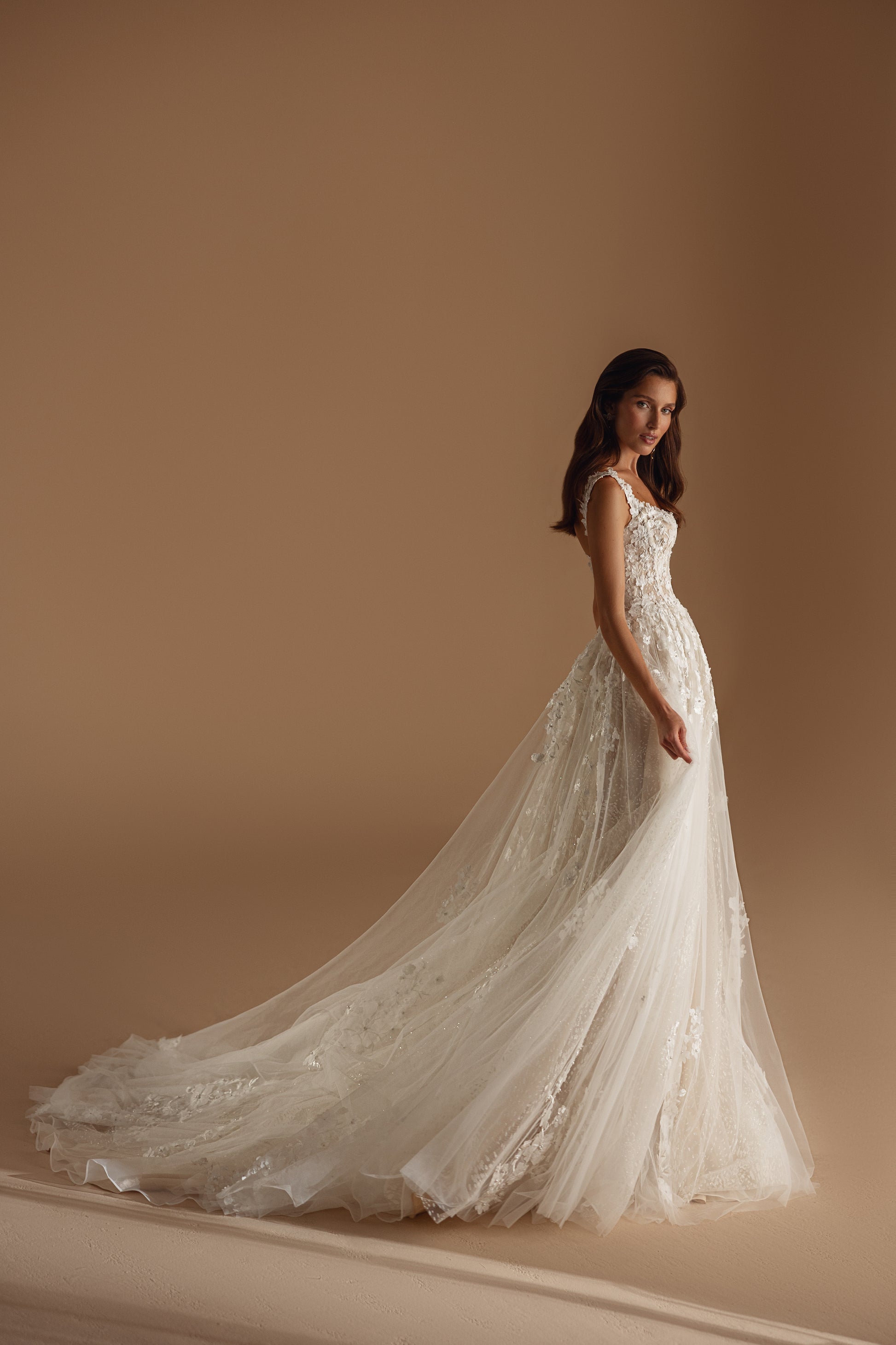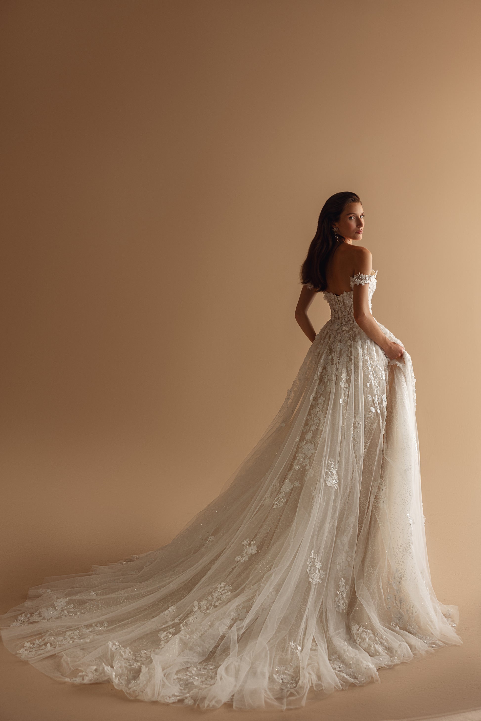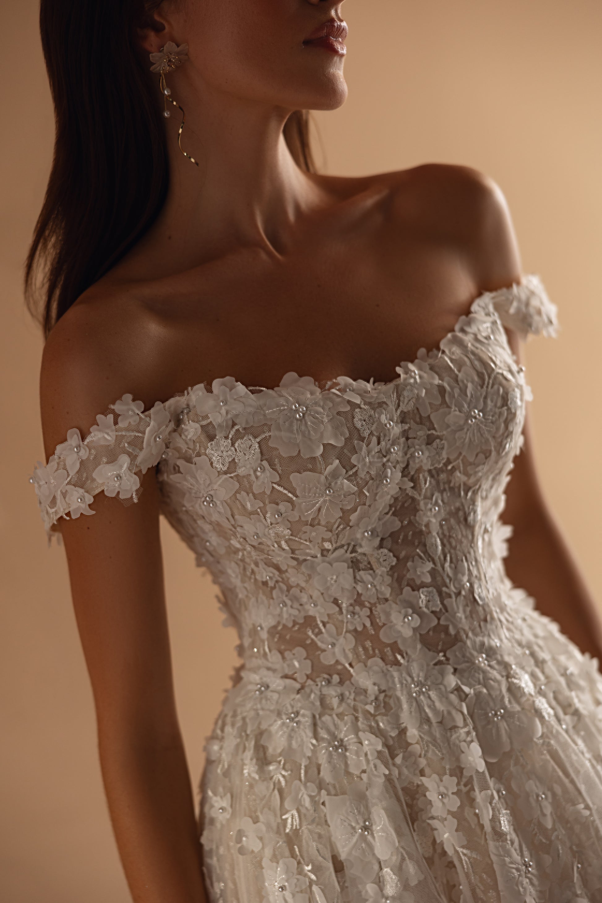 A tulle gown adorned with delicate floral straps that transform into an off-shoulder design. Its airy skirt and gentle neckline bloom with romantic florals, perfectly balancing a dreamy nature with the poise of a future full of promise.