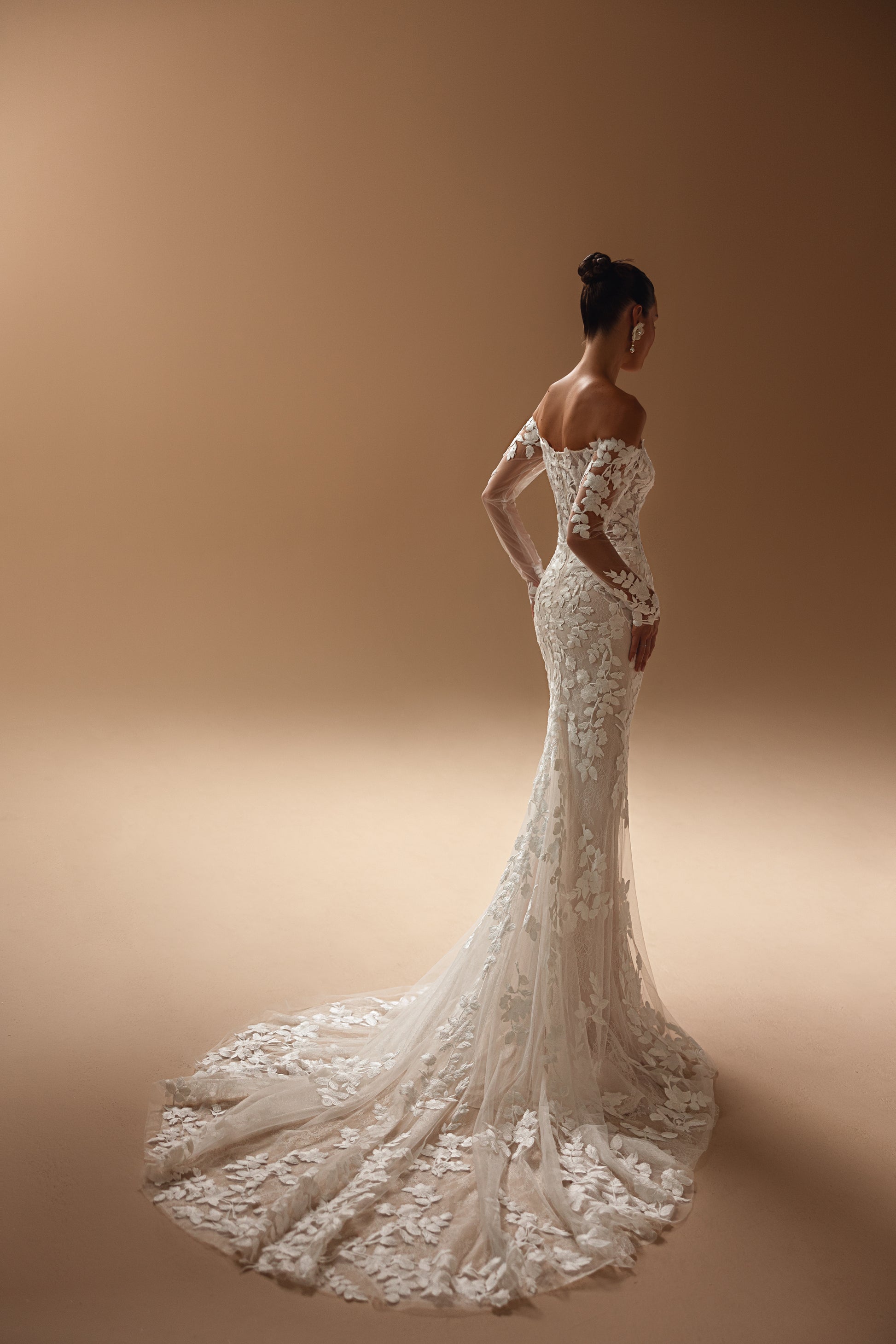 This ivory guipure gown flatters with a bold mermaid silhouette and an alluring train. Confident yet sensitive, its sensual design captivates with a modern elegance that speaks of self-awareness, grace, and a quietly commanding presence.