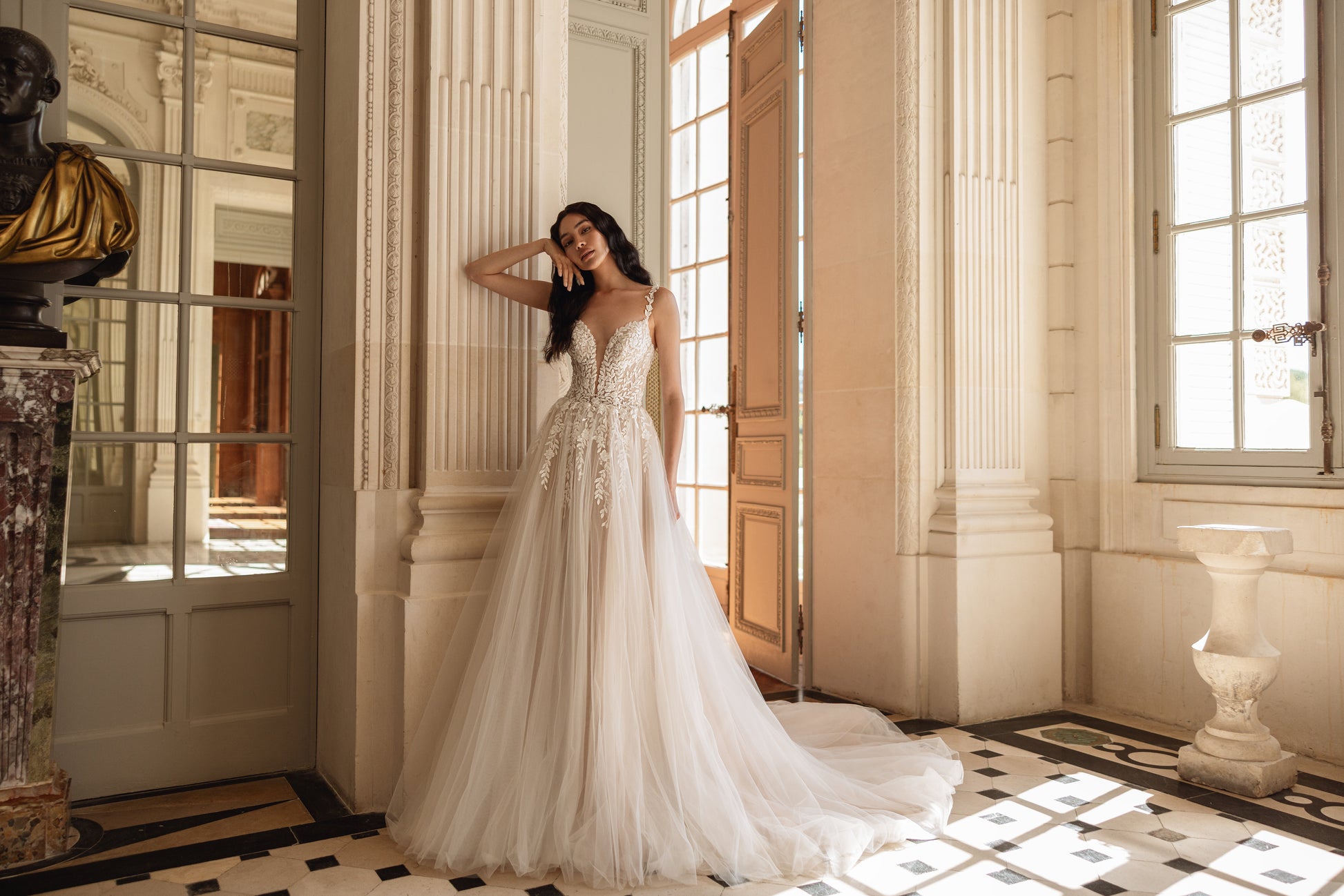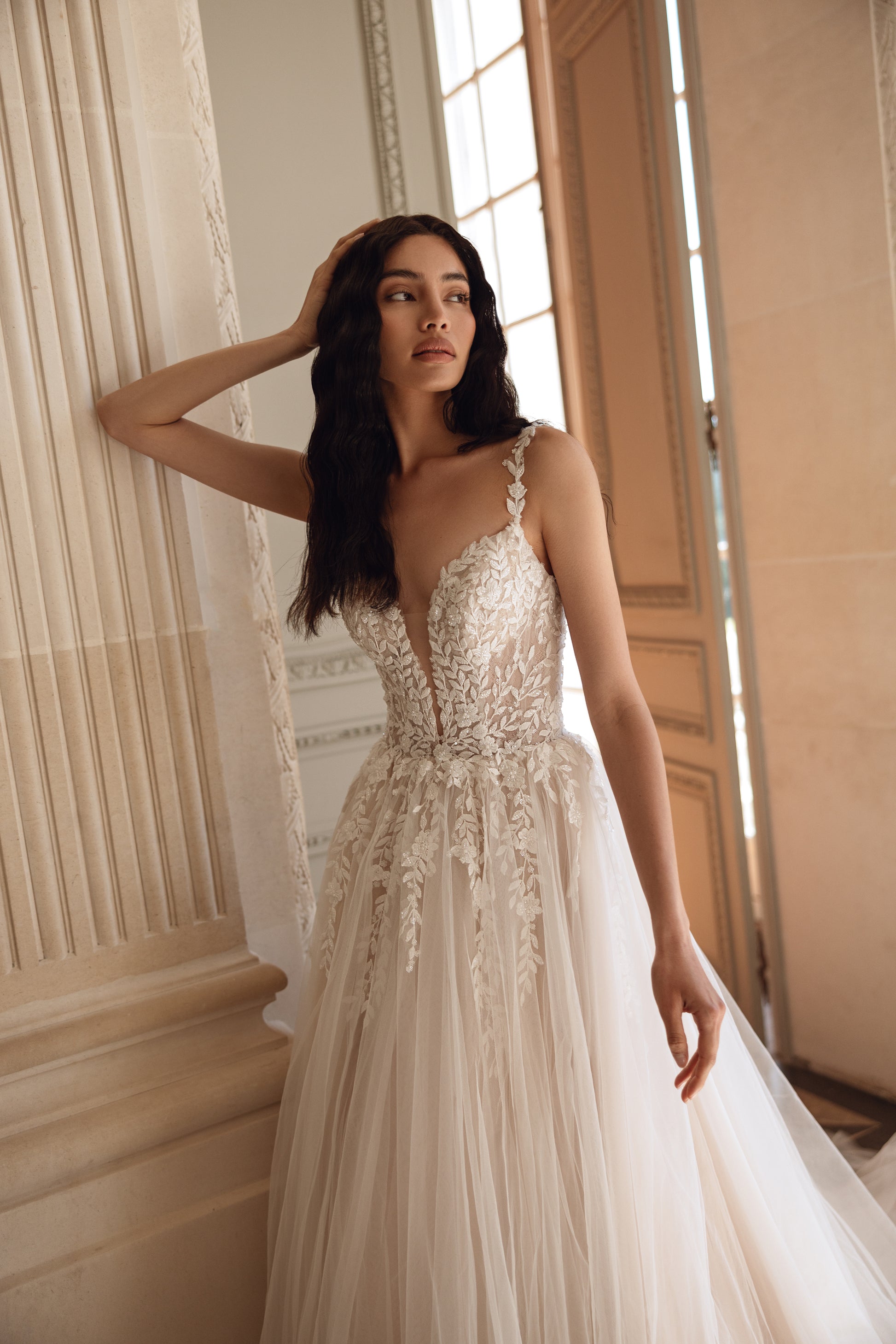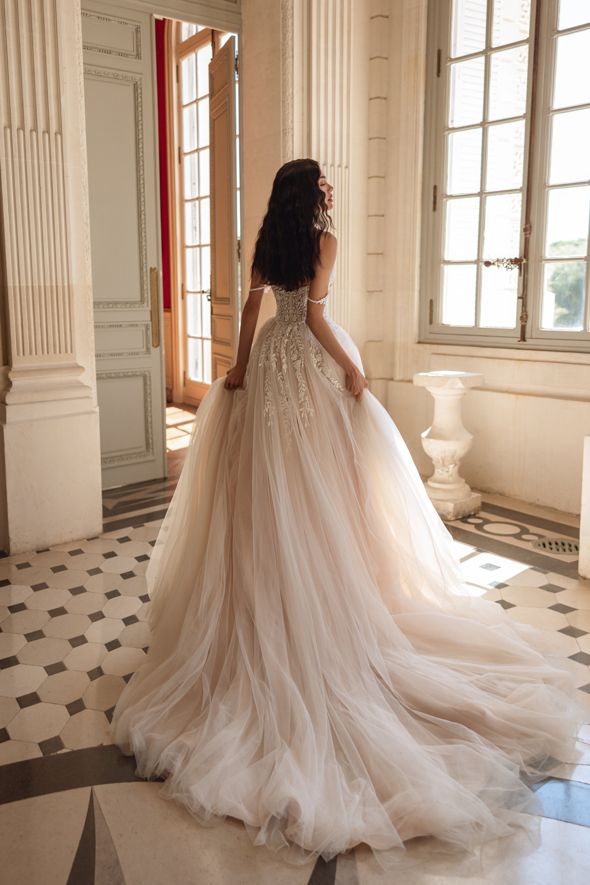 This cappuccino A-line dress is all about airiness and movement. Made from beaded lace with sequins and layered tulle, its softly pleated fabric flows from the waist and blooms with floral detail. The V-neckline draws the gaze upward, while the light structure keeps the silhouette effortlessly romantic and ethereal.
