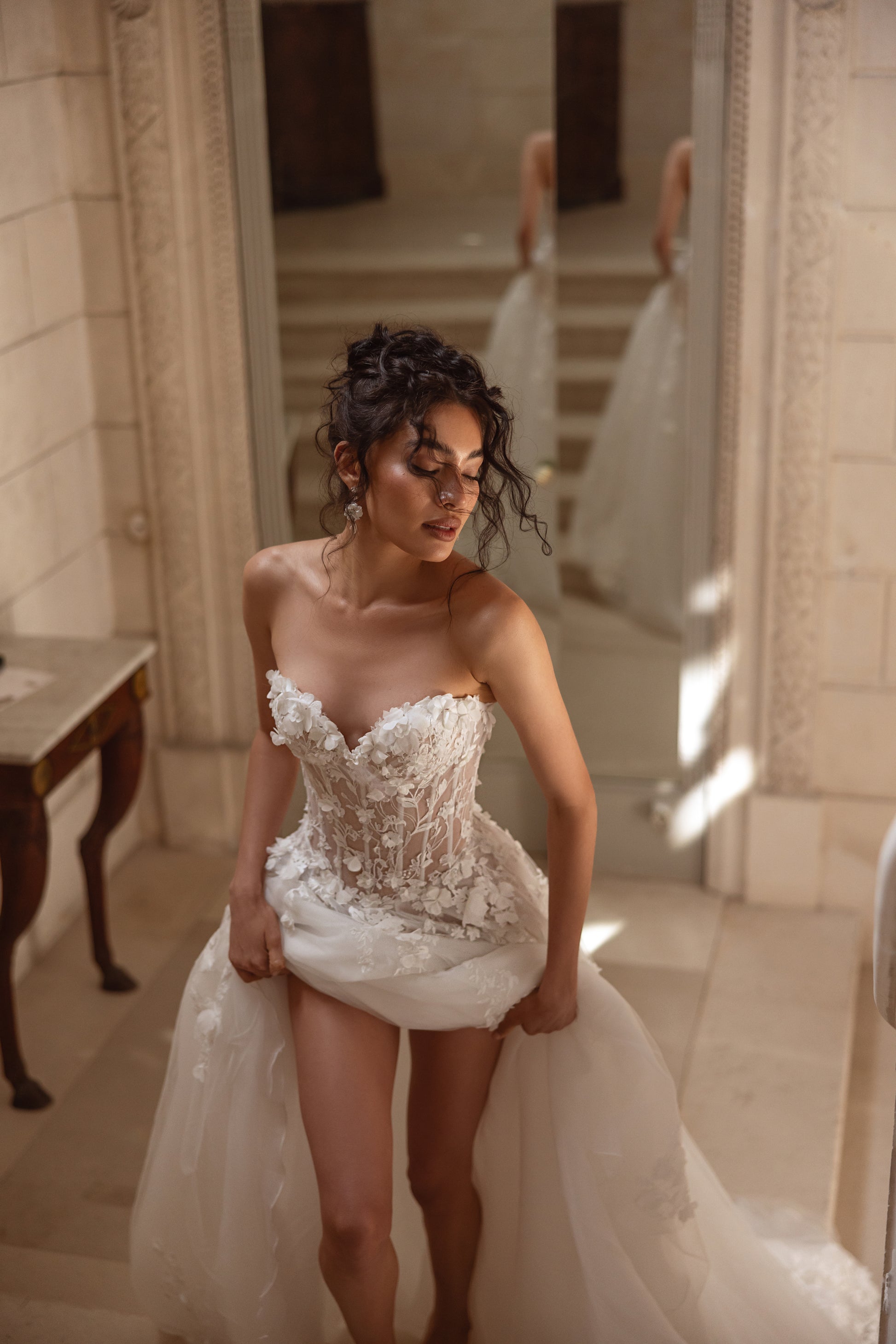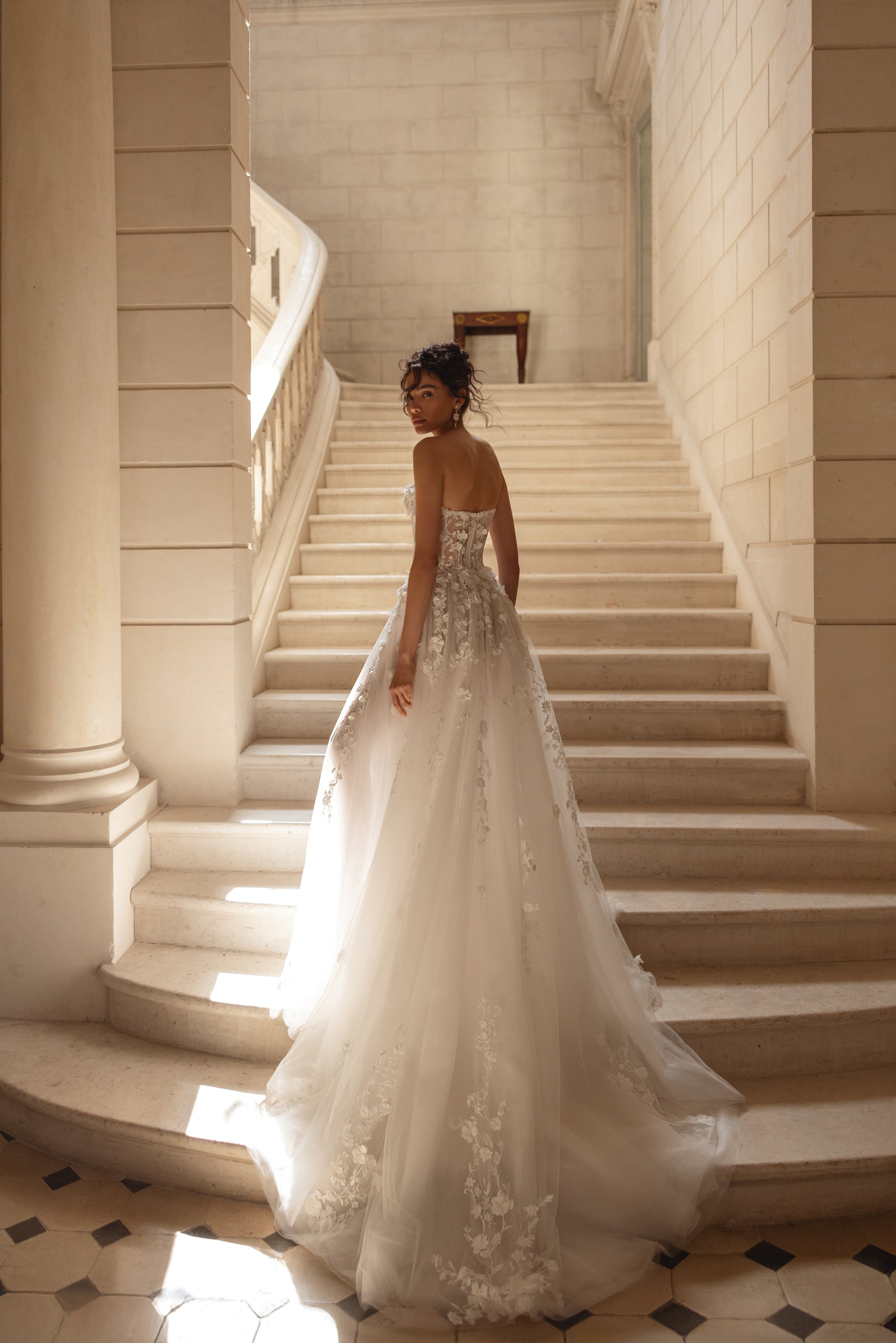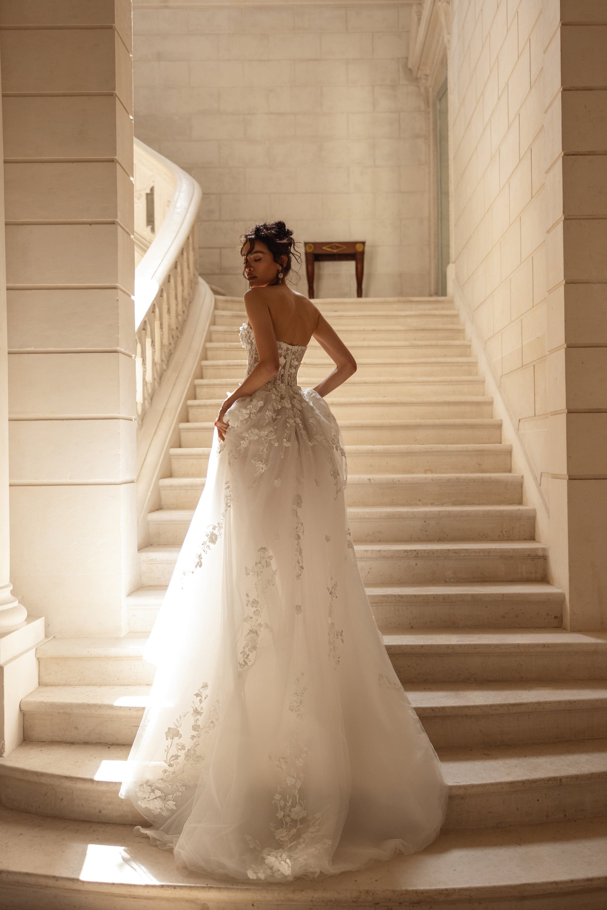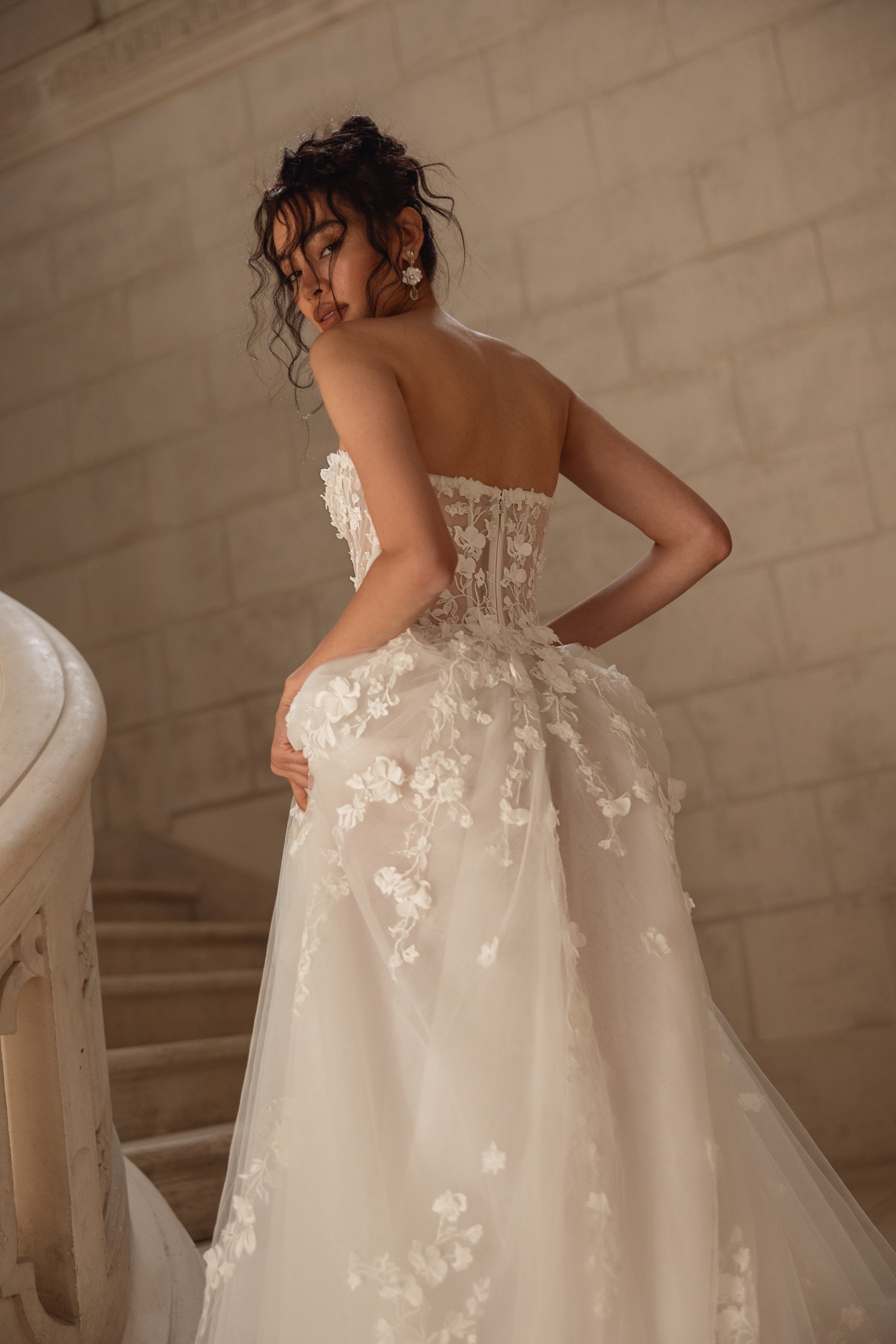 An ivory A-line gown with a sweetheart neckline and barely-there feel. Its mesh corset is softly structured and adorned with 3D lace, while the layered tulle and organza skirt floats with every step. The entire look feels innocent yet vibrant—a blend of freshness and understated elegance that captures attention quietly.