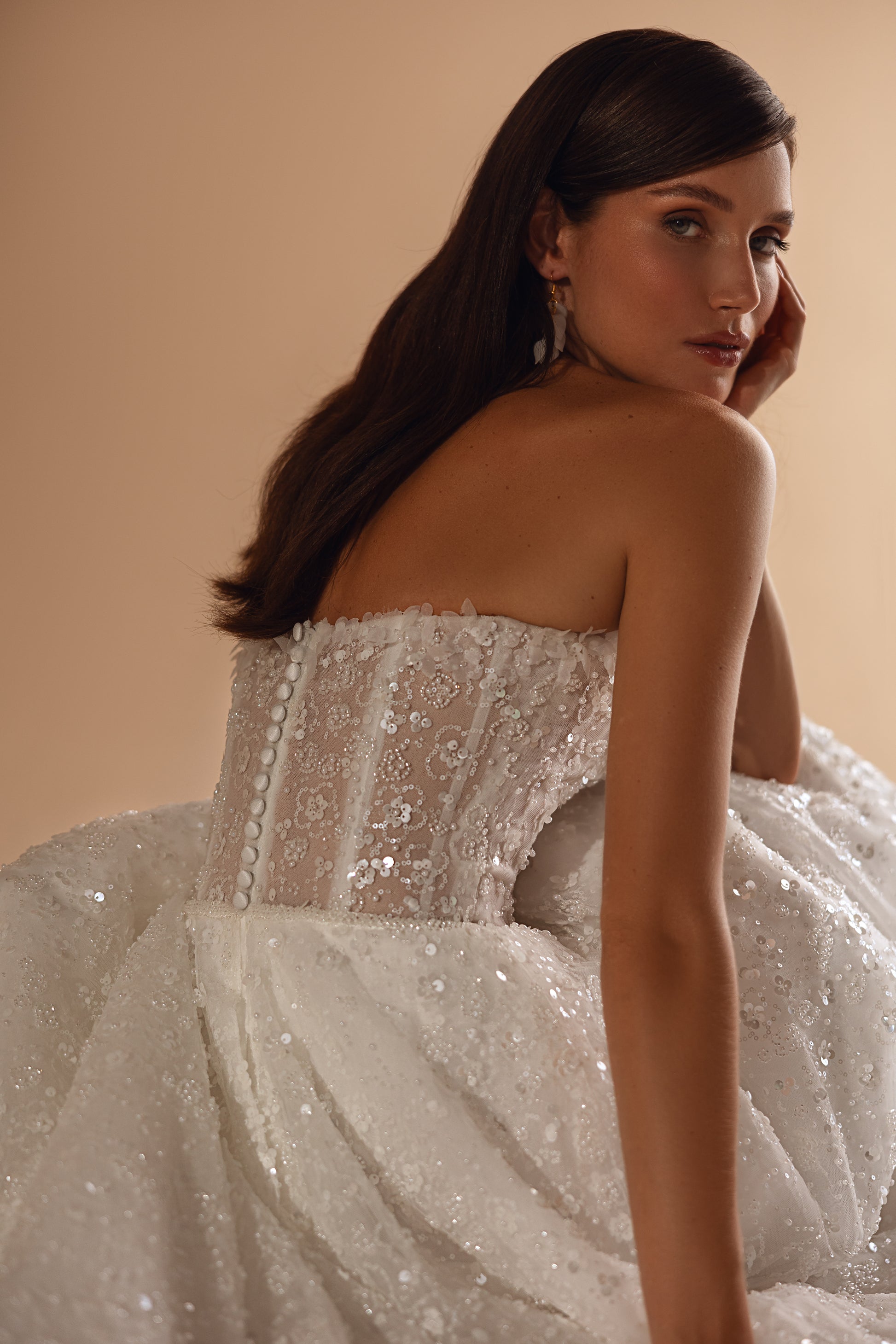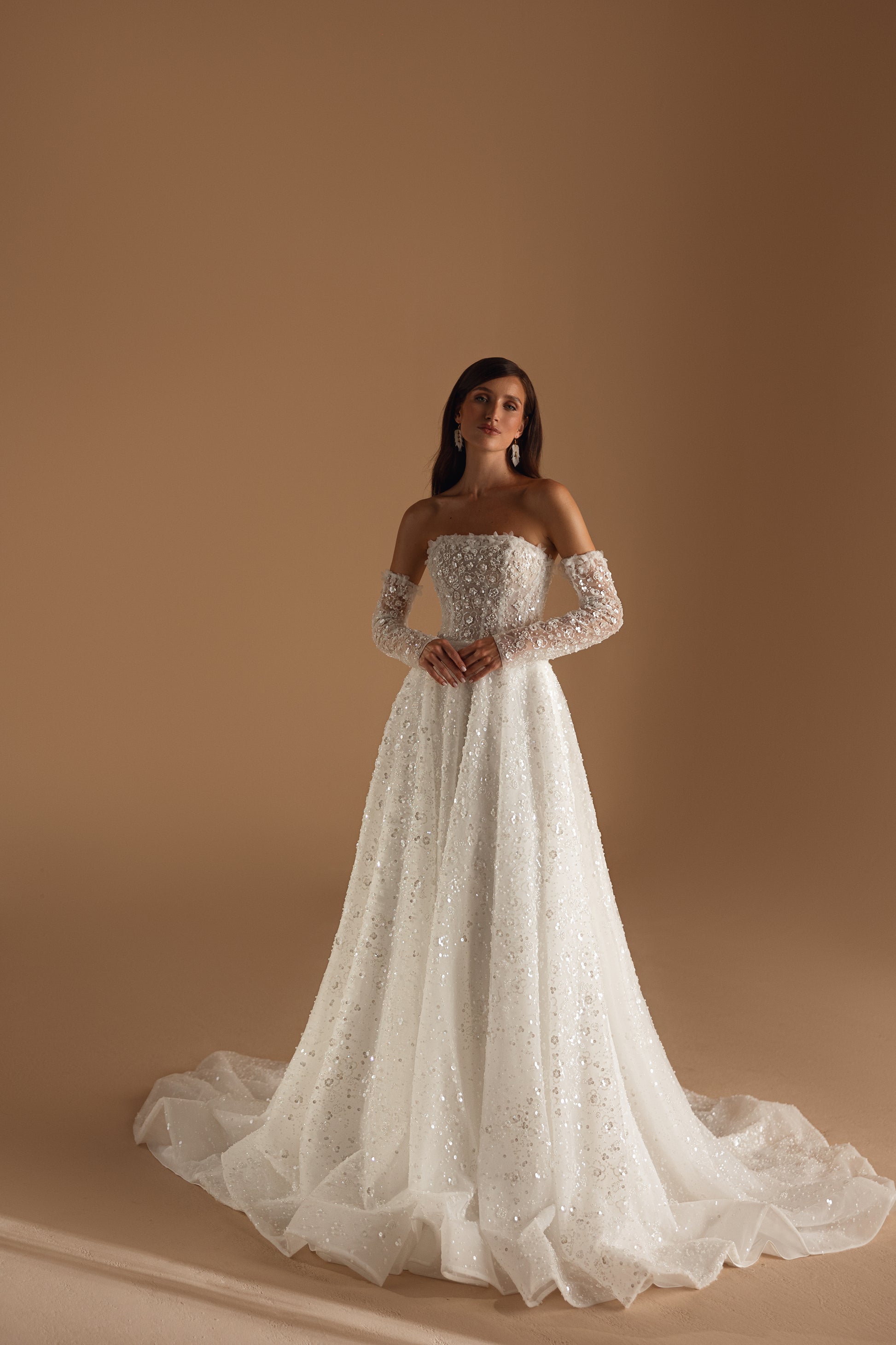 An ivory guipure gown adorned with pearls, sequins, and beads, shimmering like morning dew. Removable sleeves add versatility to the delicate, flowing skirt and train, offering a balance of ethereal charm and unspoken ambition.