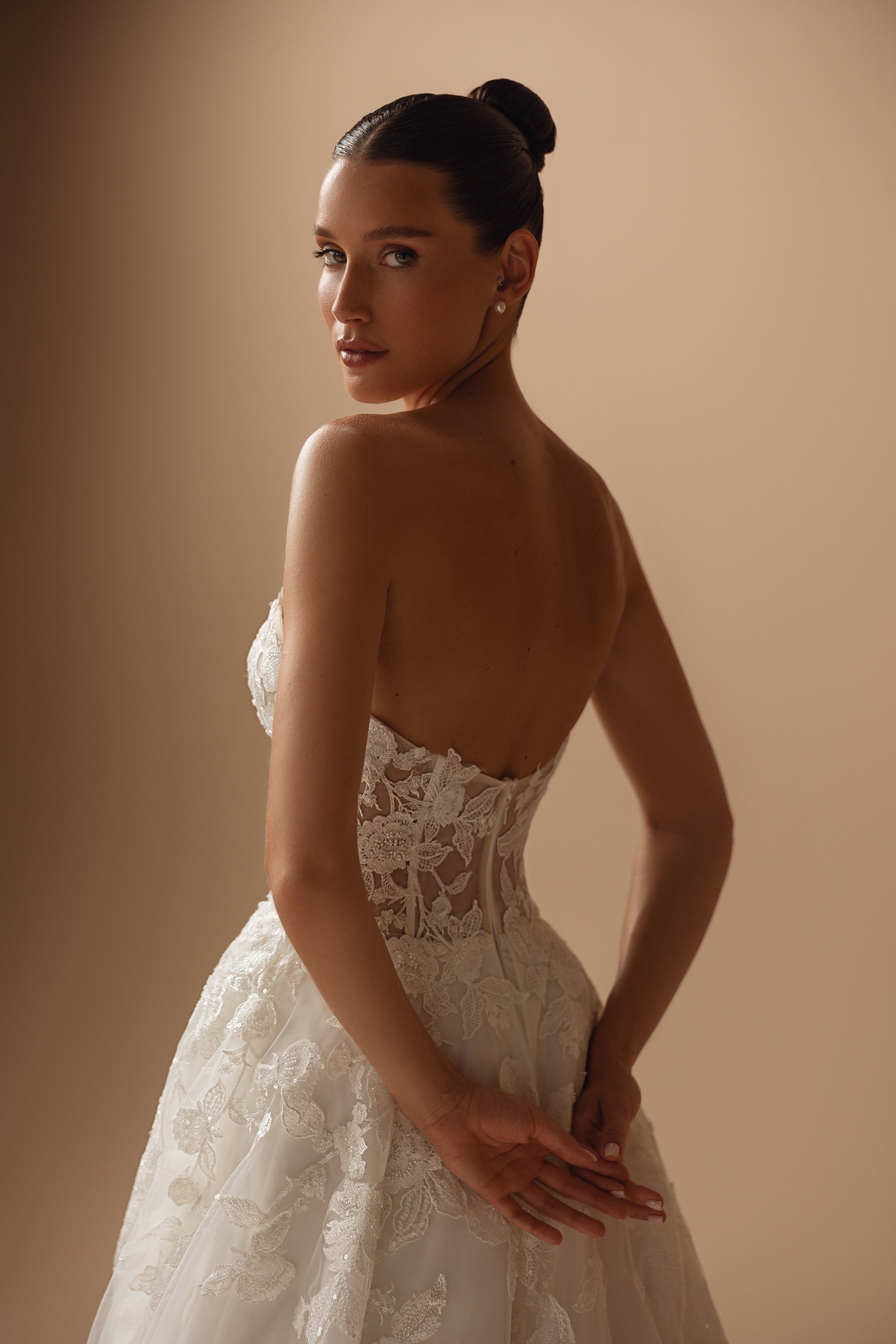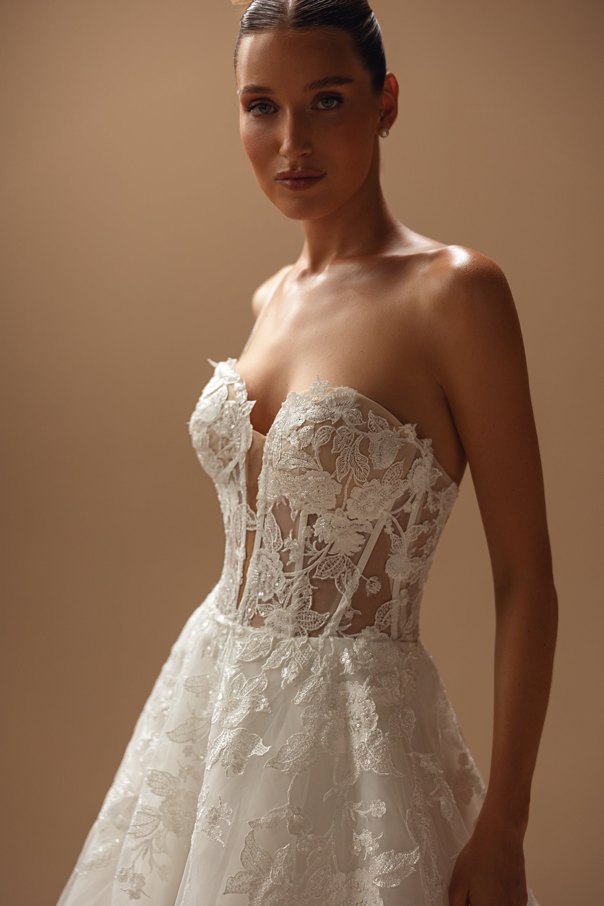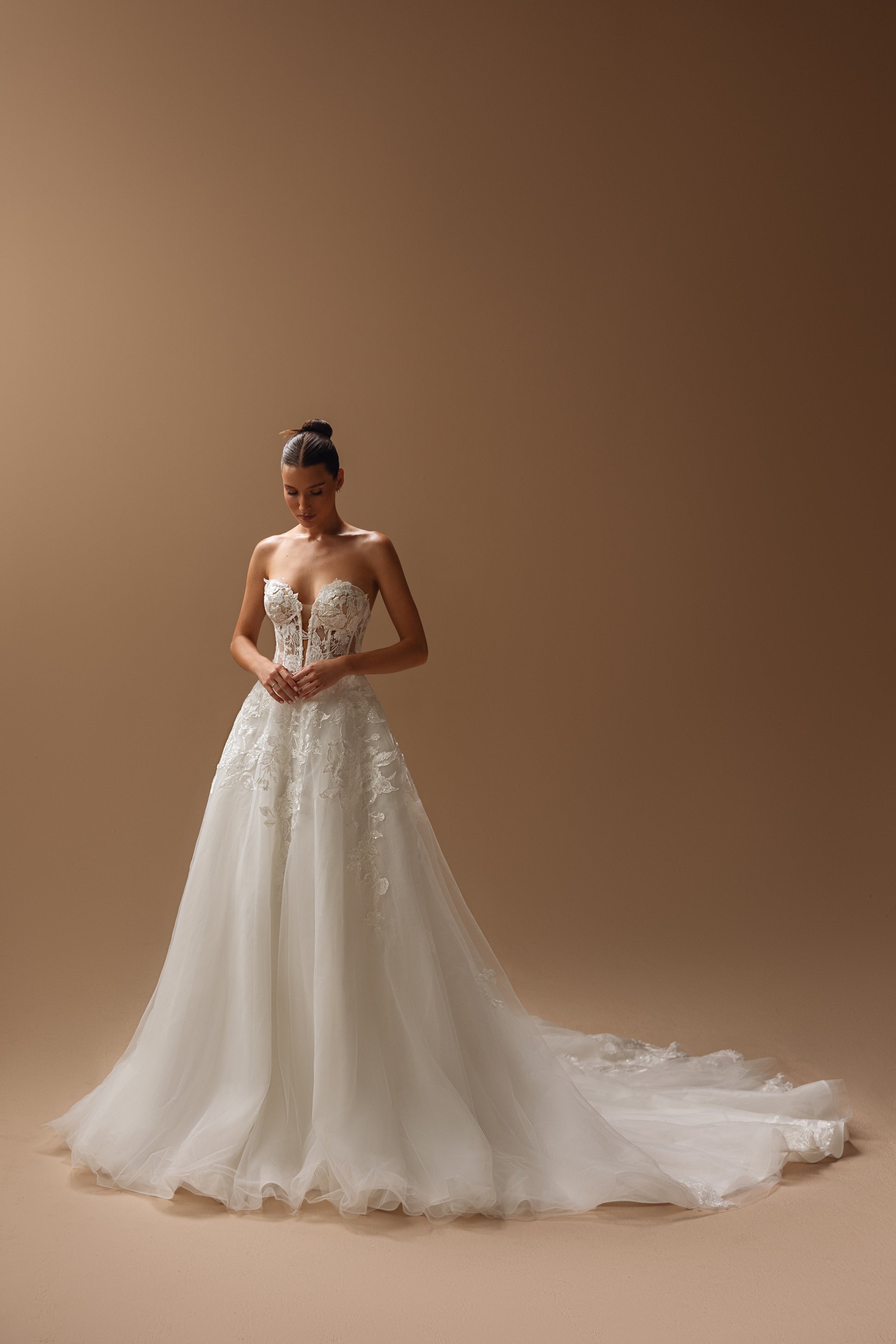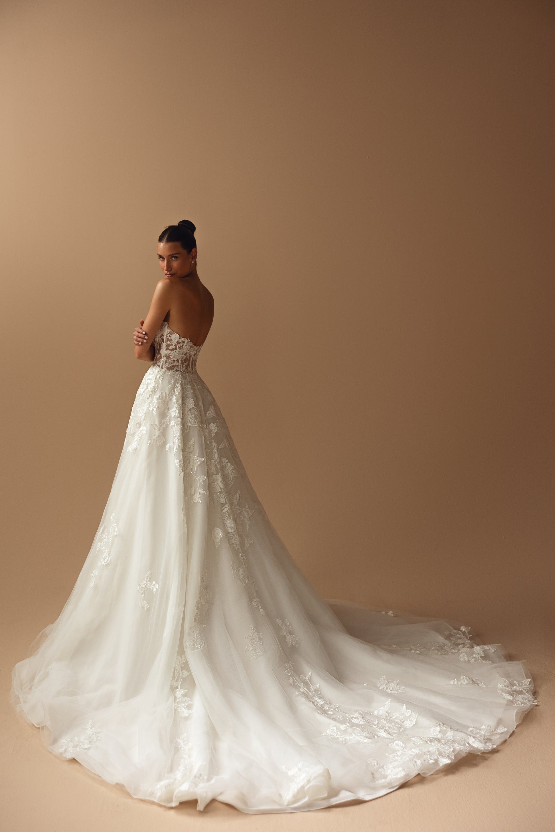 This ivory tulle gown features a sweetheart neckline and lush floral embellishments. The train, resembling seafoam, pairs with a majestic backline to create a design that’s as gentle and enchanting as it is strikingly romantic.