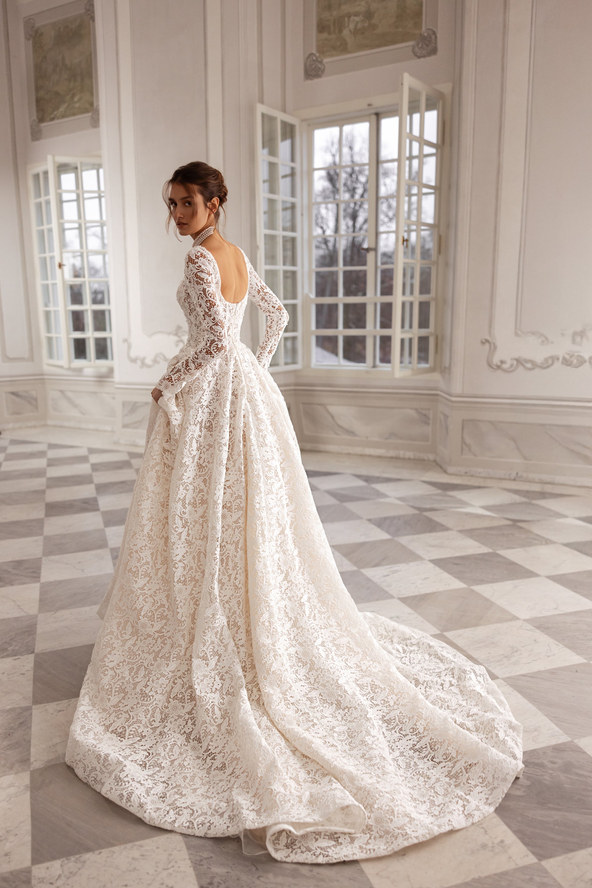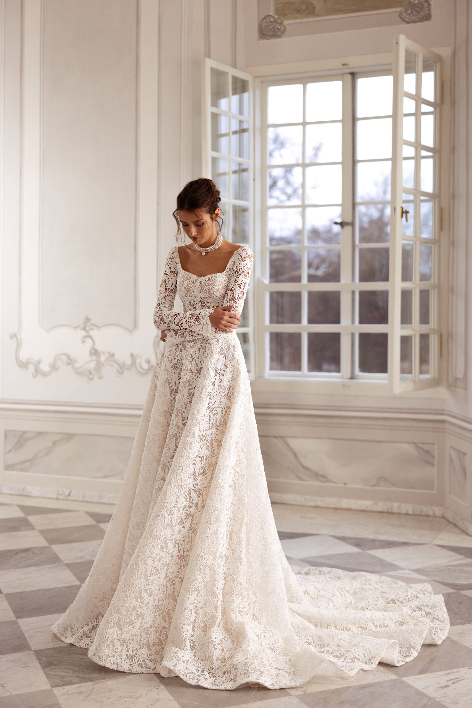 Refined and effortlessly romantic, this A-line gown in cappuccino or ivory is crafted from delicate French knitted lace. A handmade beaded belt cinches the waist, while hand-placed pearls adorn the corset. The open square neckline invites breath and movement, complemented by an oval back that adds a sensual yet poised allure.