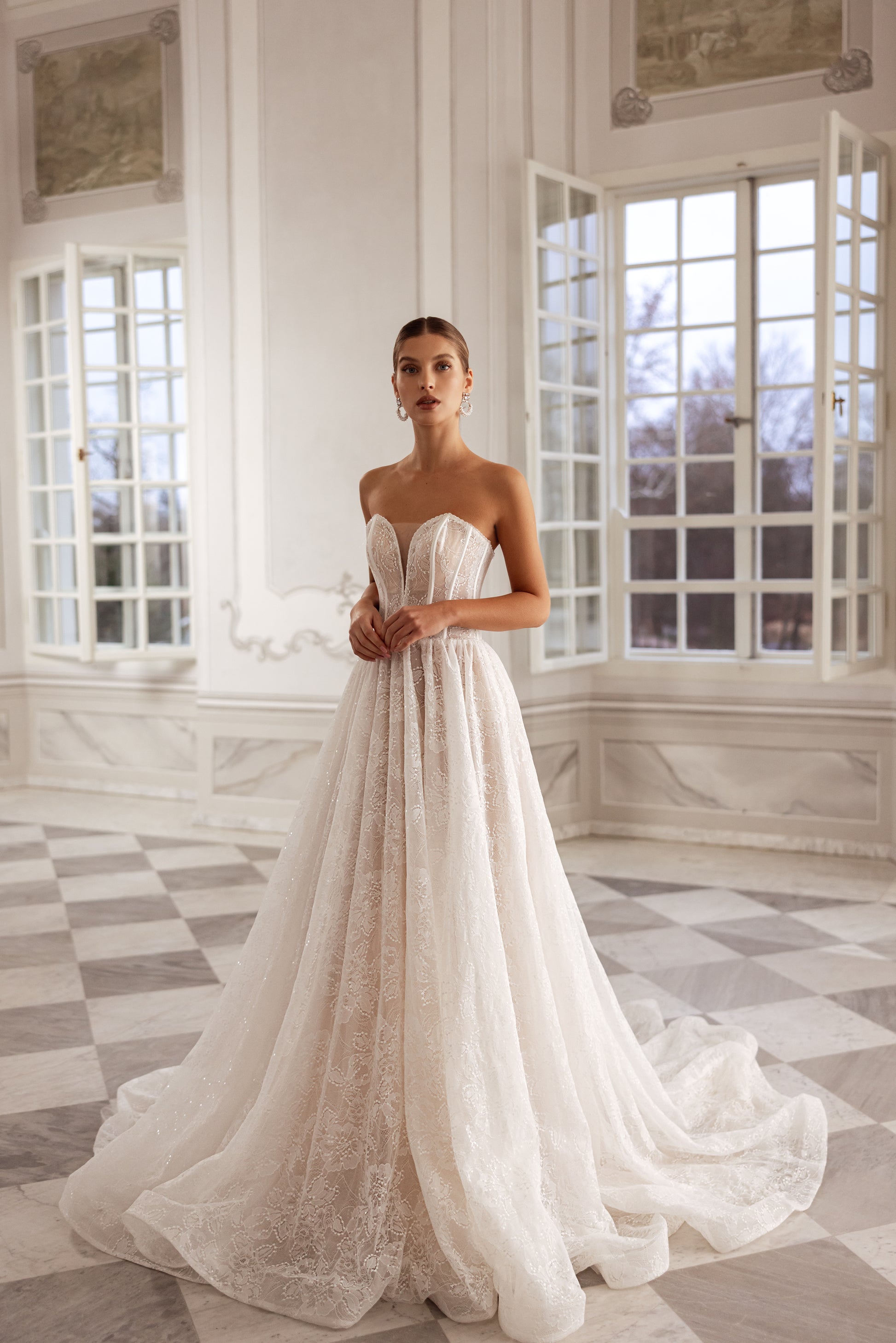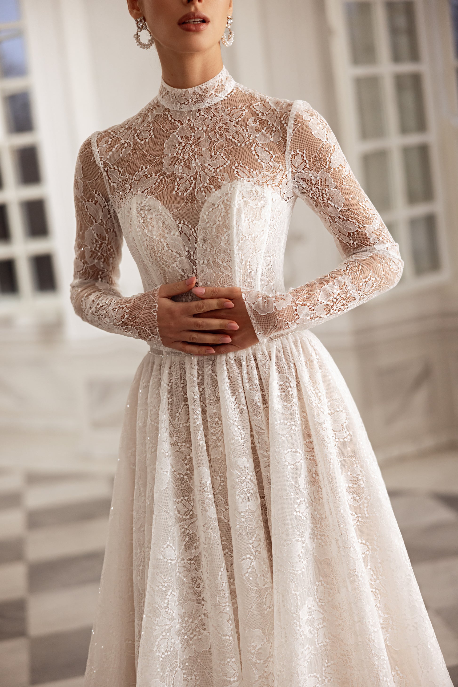 In cappuccino or ivory beaded Chantilly lace, this A-line gown is the definition of romance with an edge. The deep-slit bodice is hand-decorated with shimmering beadwork, while a detachable long-sleeve bolero with a turtleneck adds a regal touch. The flowing train feels light as air, embodying both delicacy and self-aware beauty.