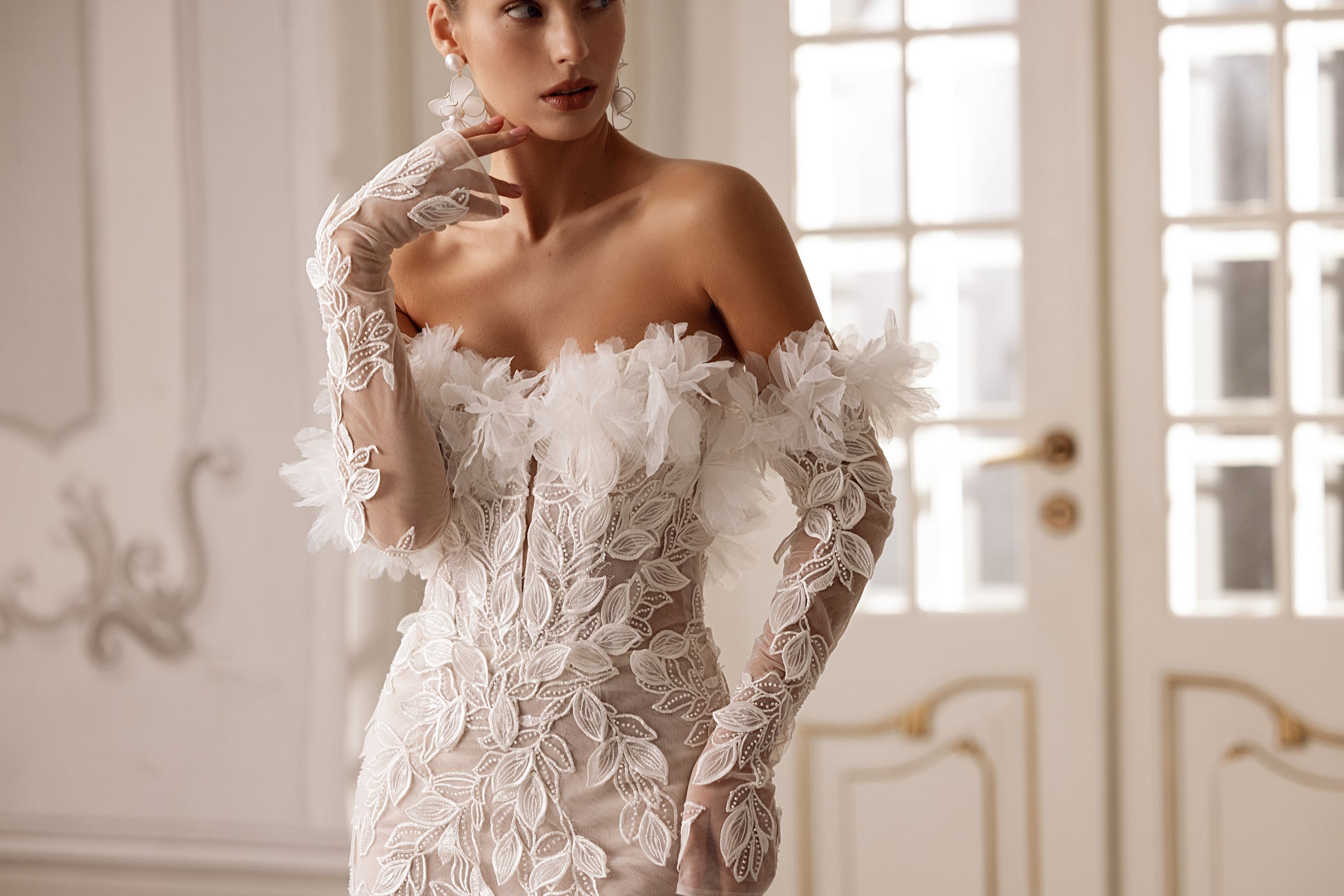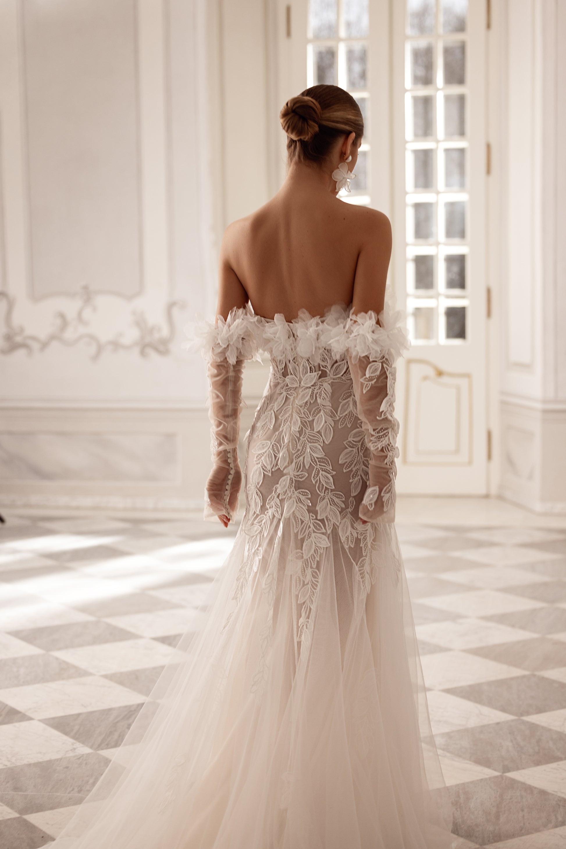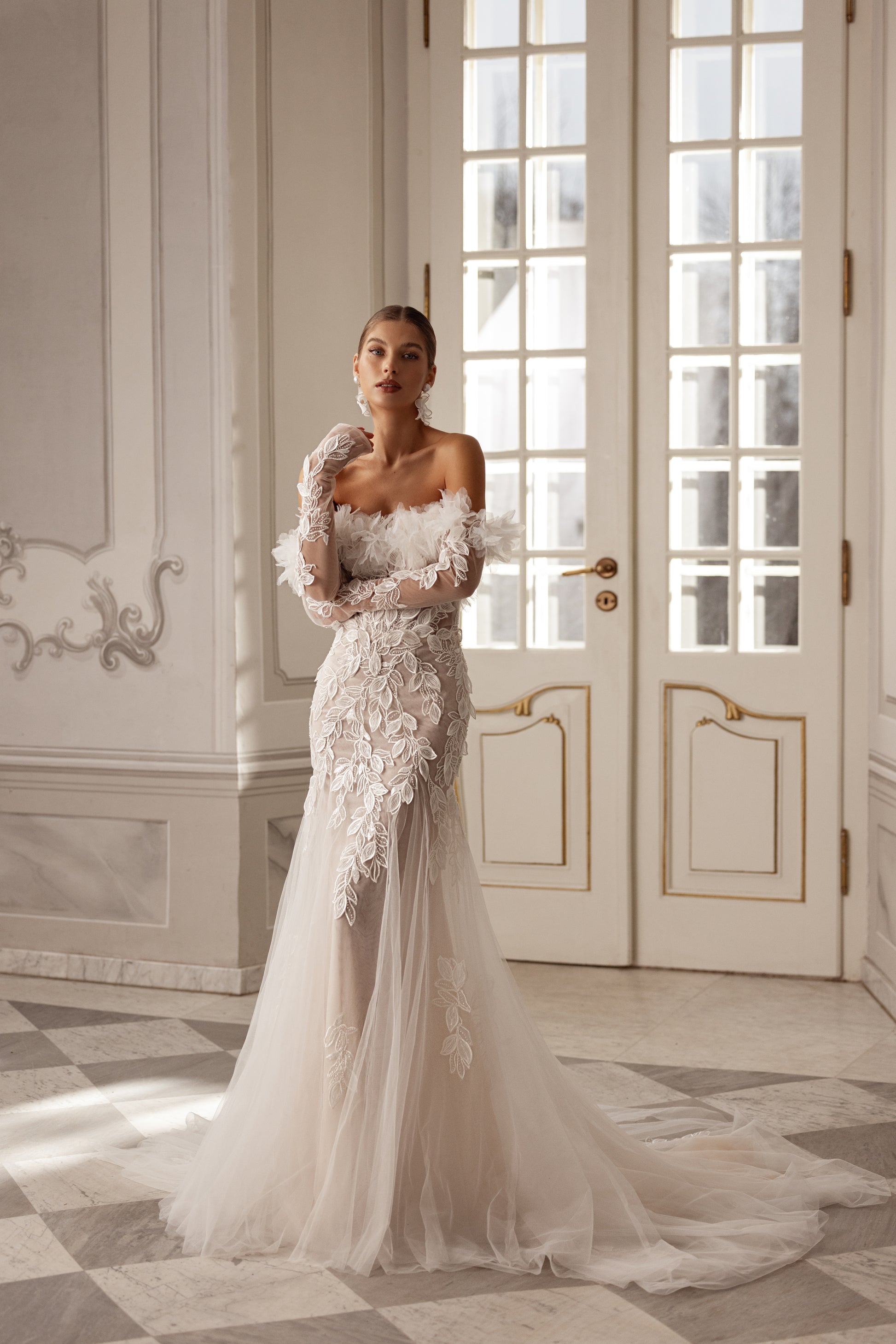 A vision of movement and grace, this mermaid-style gown in cappuccino or ivory beaded lace features a straight neckline, hand-adorned with delicate flowers. The airy tulle wedges in the skirt add a flowing flair, while detachable floral sleeves bring a whimsical touch. Dreamy yet bold, it’s elegance with an edge.