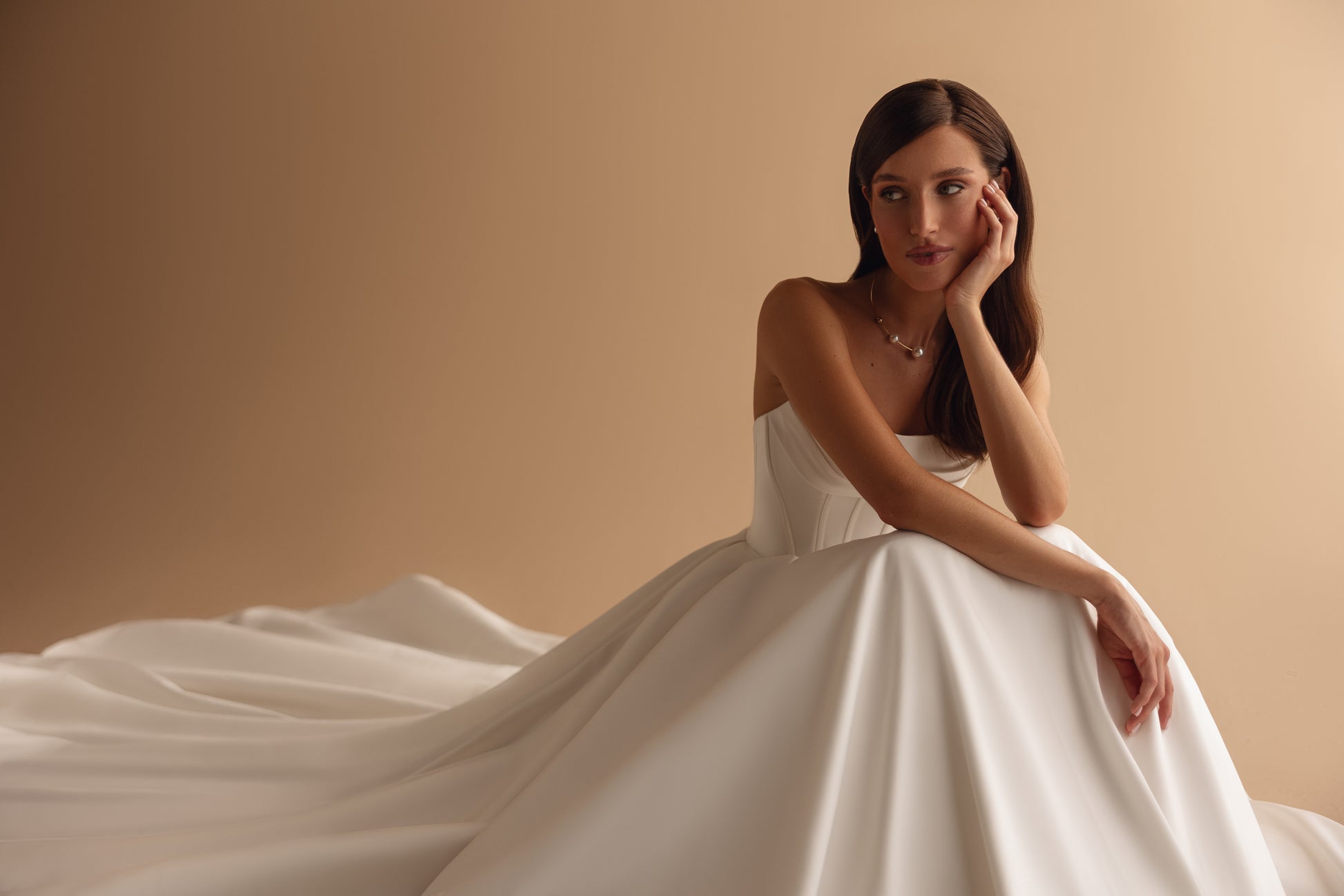An ivory Mikado gown embodying goddess-like allure. With a boned bodice and an intricate neckline inspired by a new moon, its fluid skirt drapes with elegance, revealing an open back that echoes the quiet beauty of a bella luna.