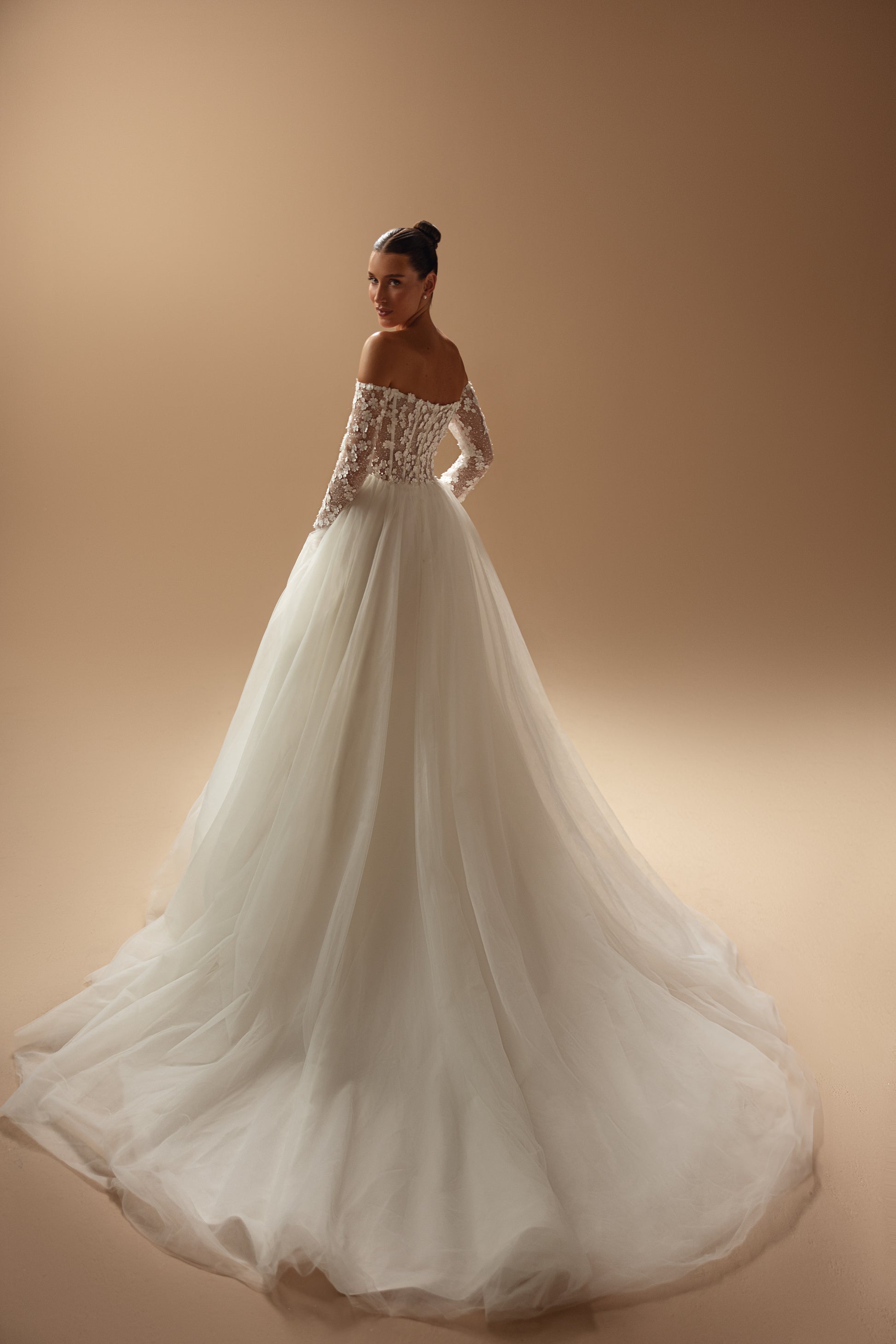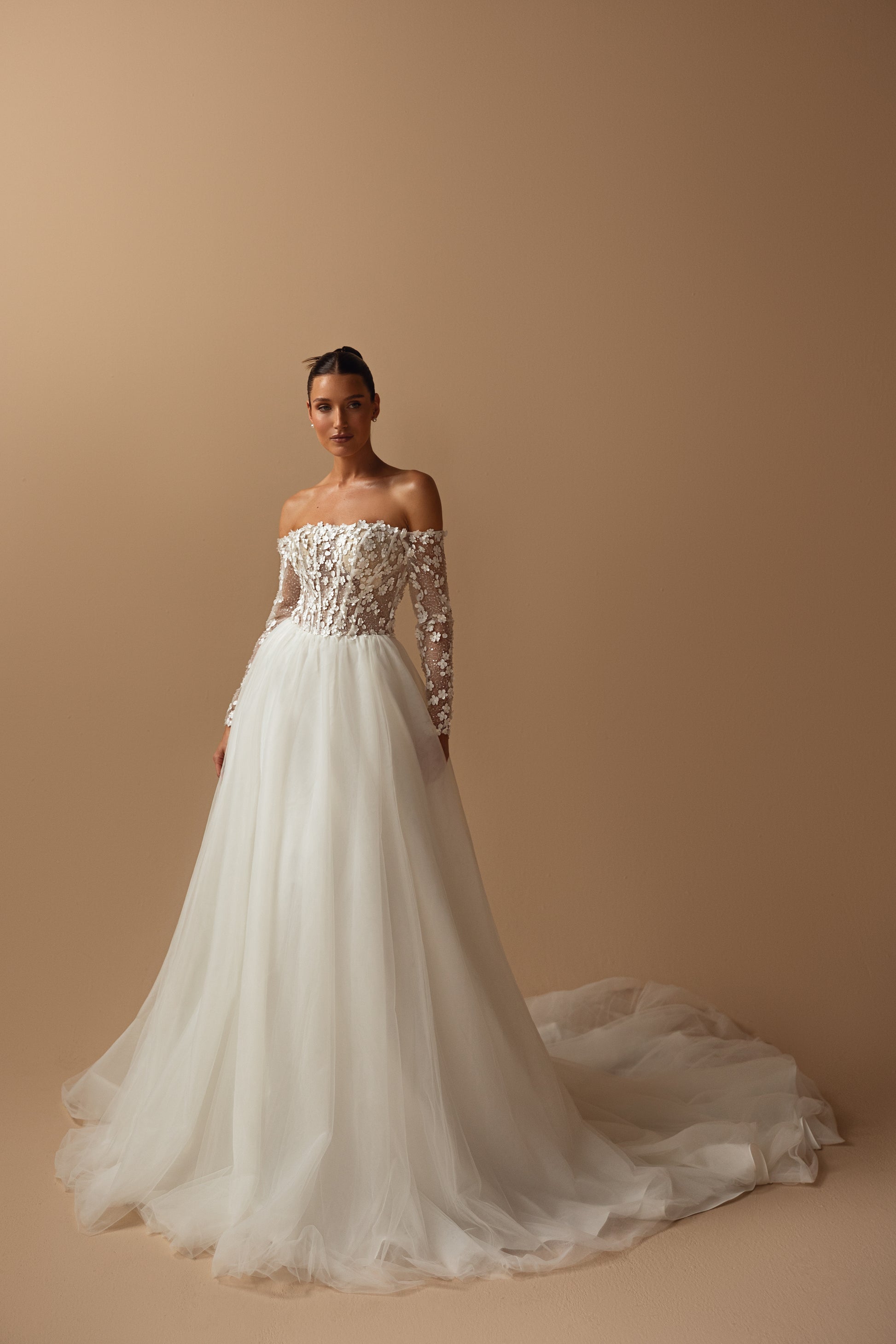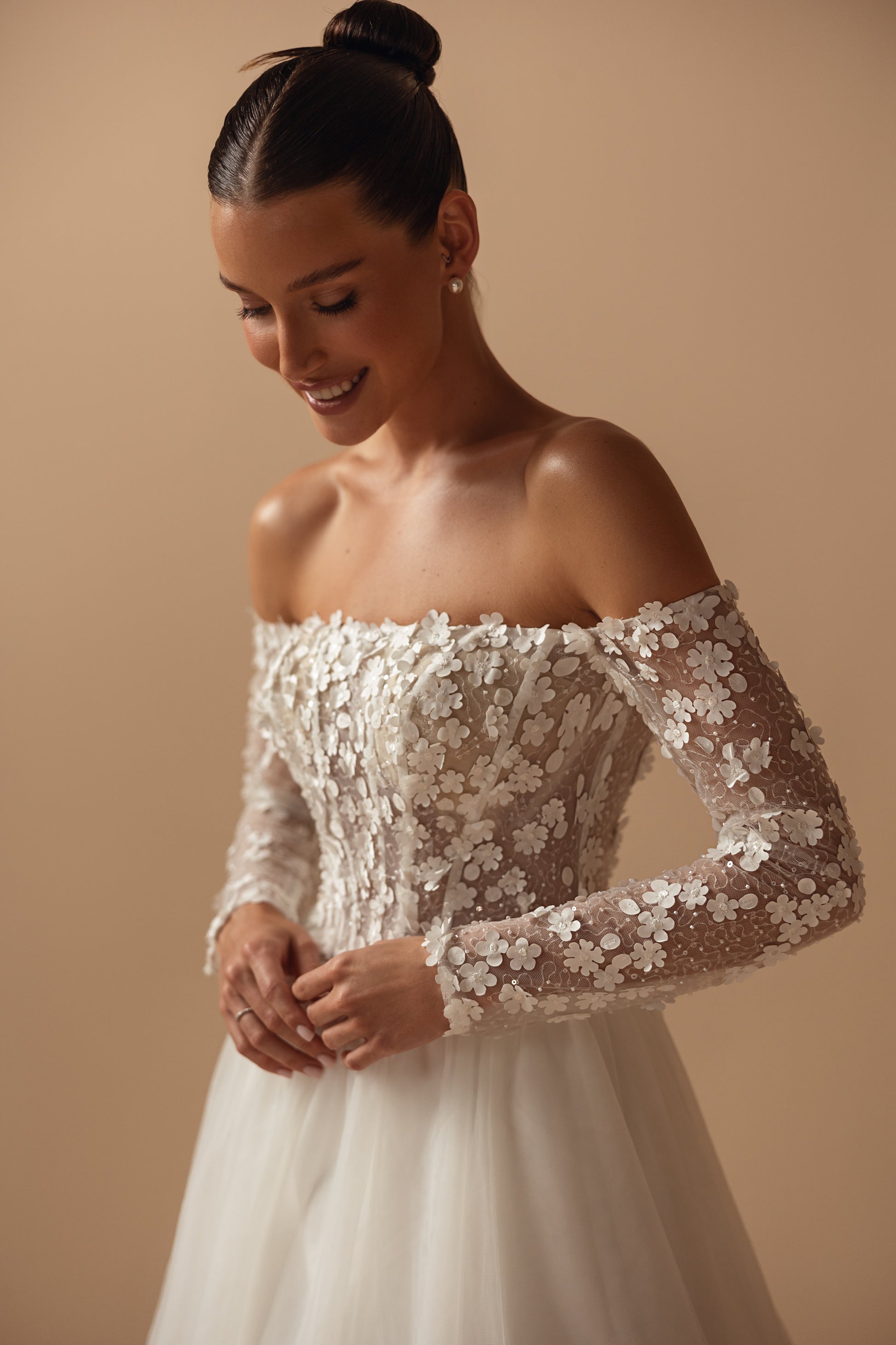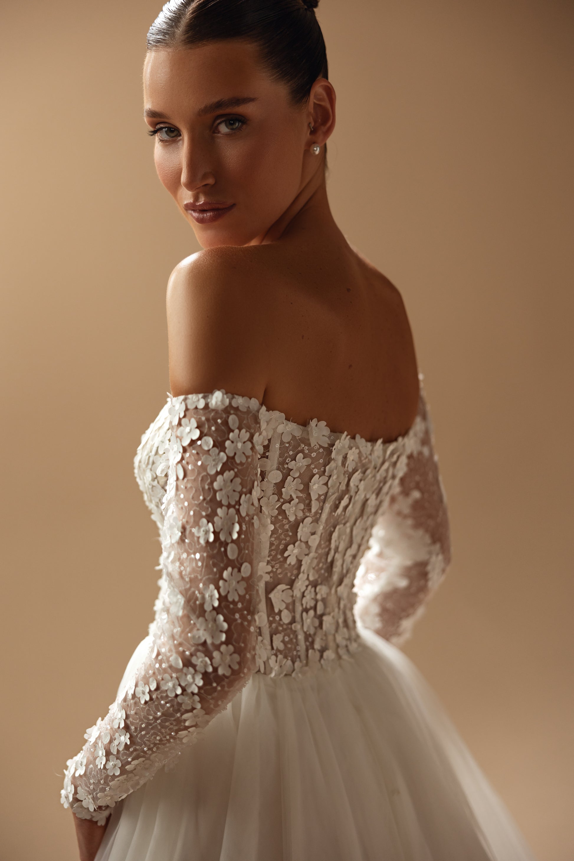 An ivory tulle gown with a guipure corset adorned in sequins, beads, and 3D florals. Its off-shoulder straight neckline exudes restrained confidence, while long floral sleeves and a lush train add warmth and a dreamy, romantic charm.