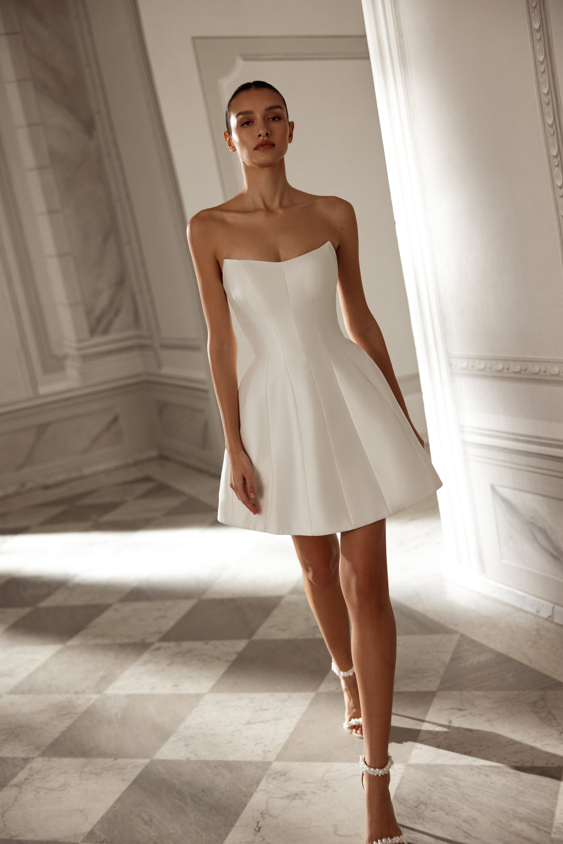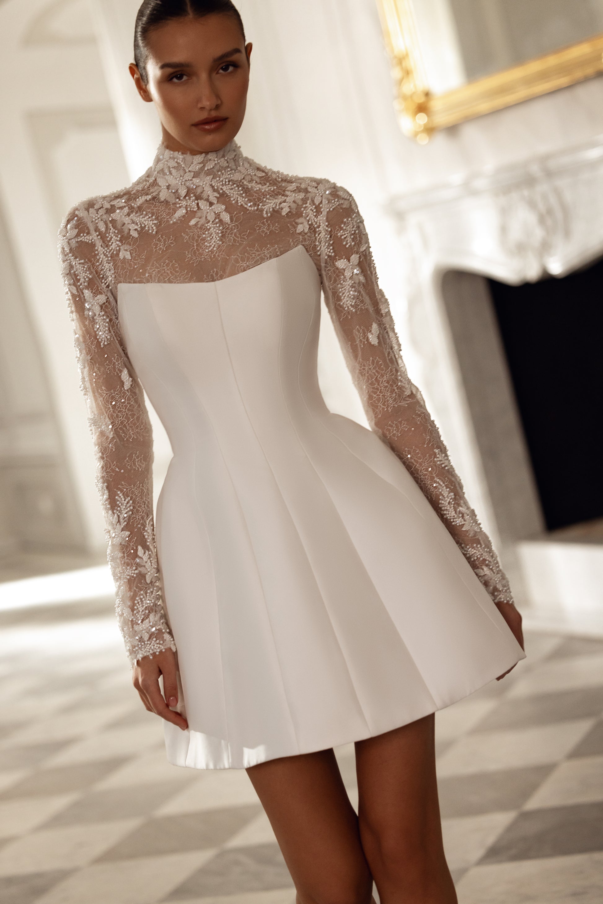 A playful yet poised ivory mini dress in mikado, beaded lace, and Chantilly lace, this design is full of thoughtful details. A detachable bolero, fully hand-embellished with beaded lace, adds a touch of drama. Rows of buttons line the sleeves and back, completing this fresh, graceful, and undeniably charming look.
