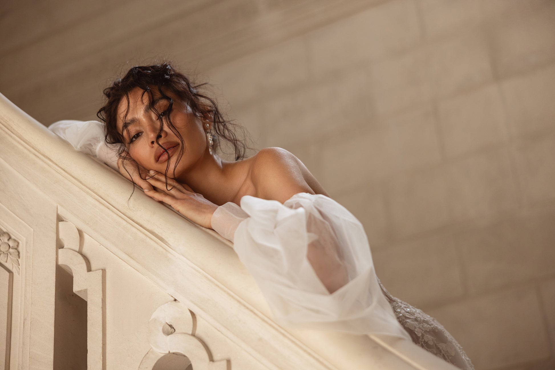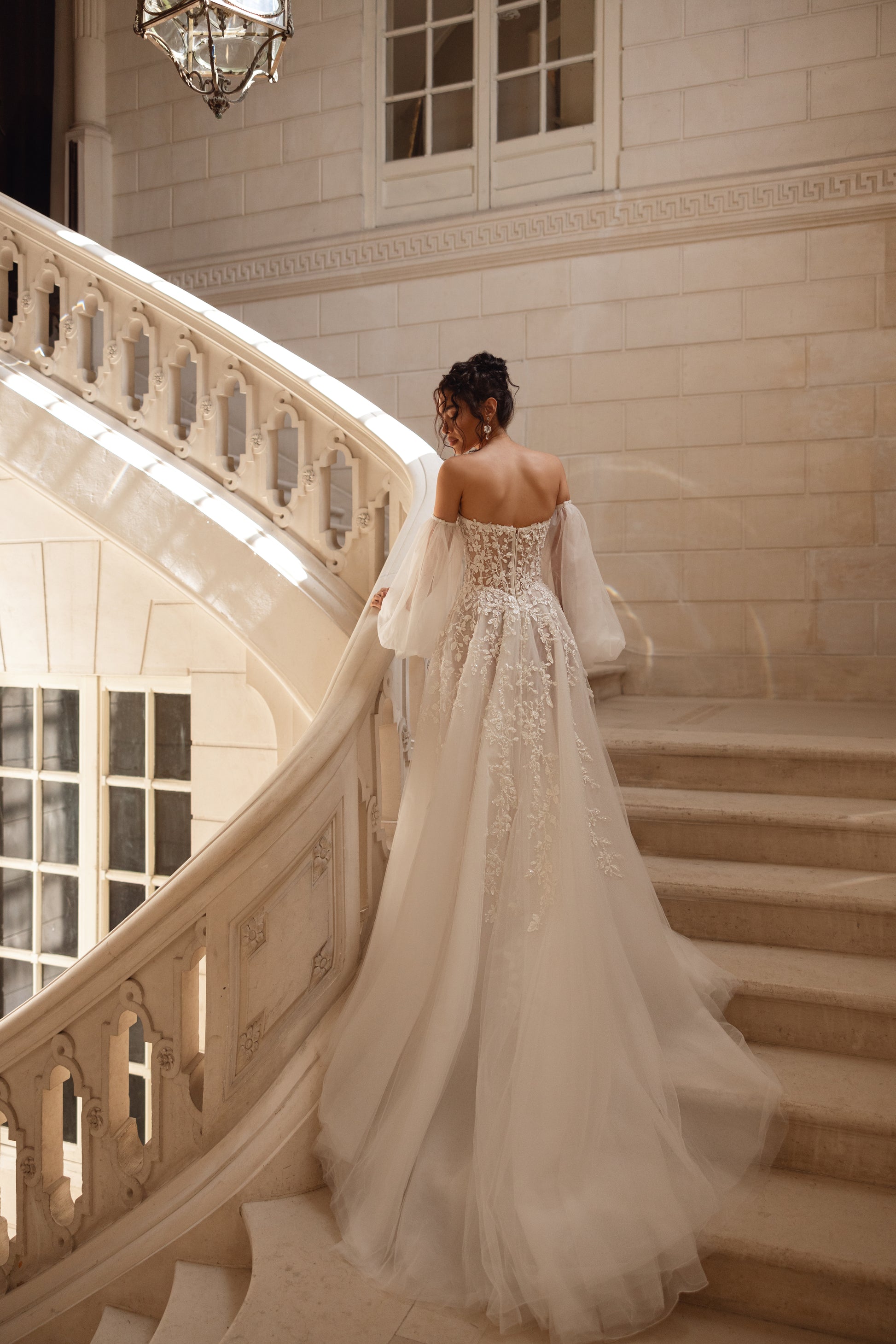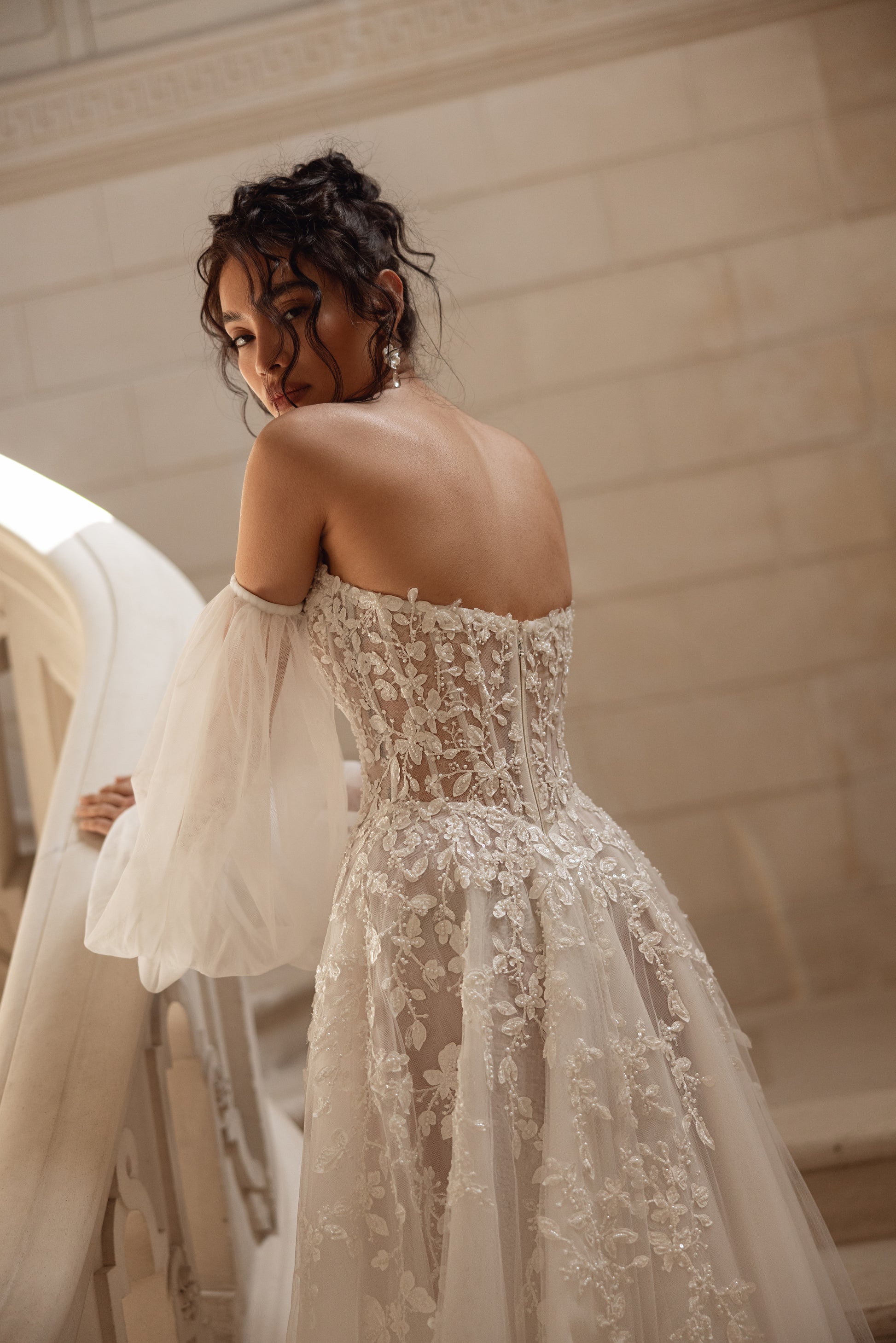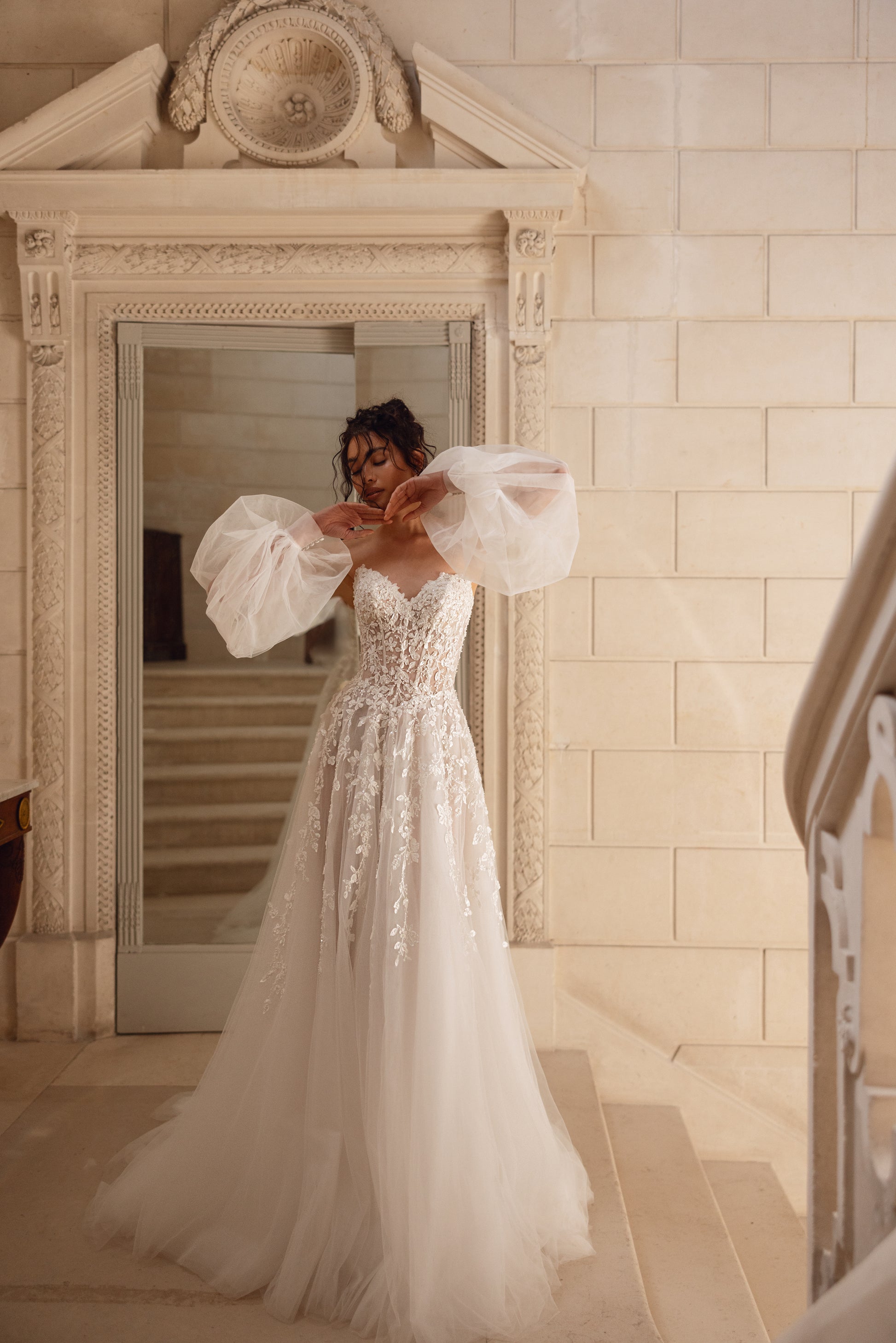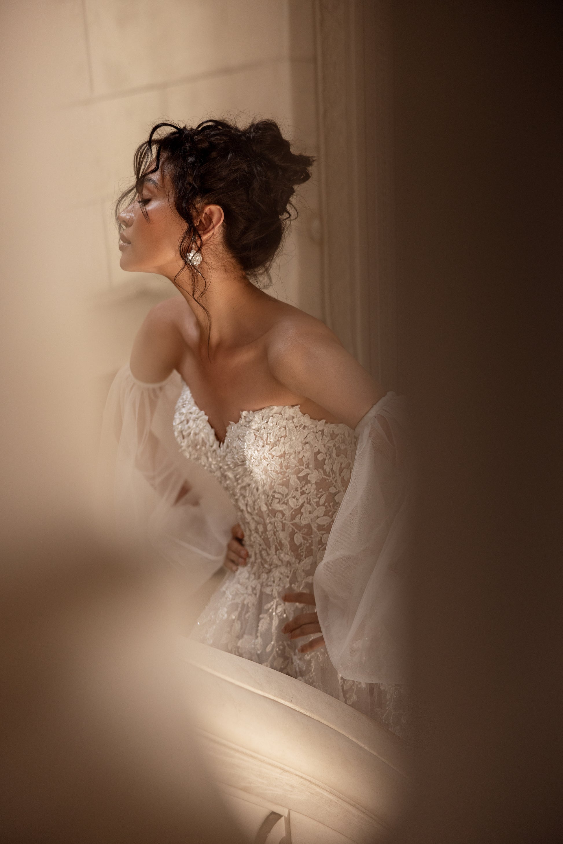 This ivory gown brings to life the fleeting beauty of seafoam — here, then gone. A-line in shape, with a gently plunging V-neckline and detachable puffy sleeves, it is adorned with intricate 3D floral lace with sequins over the bodice and waist. The layered tulle and organza fall in delicate waves, subtle and ever-shifting in their softness.