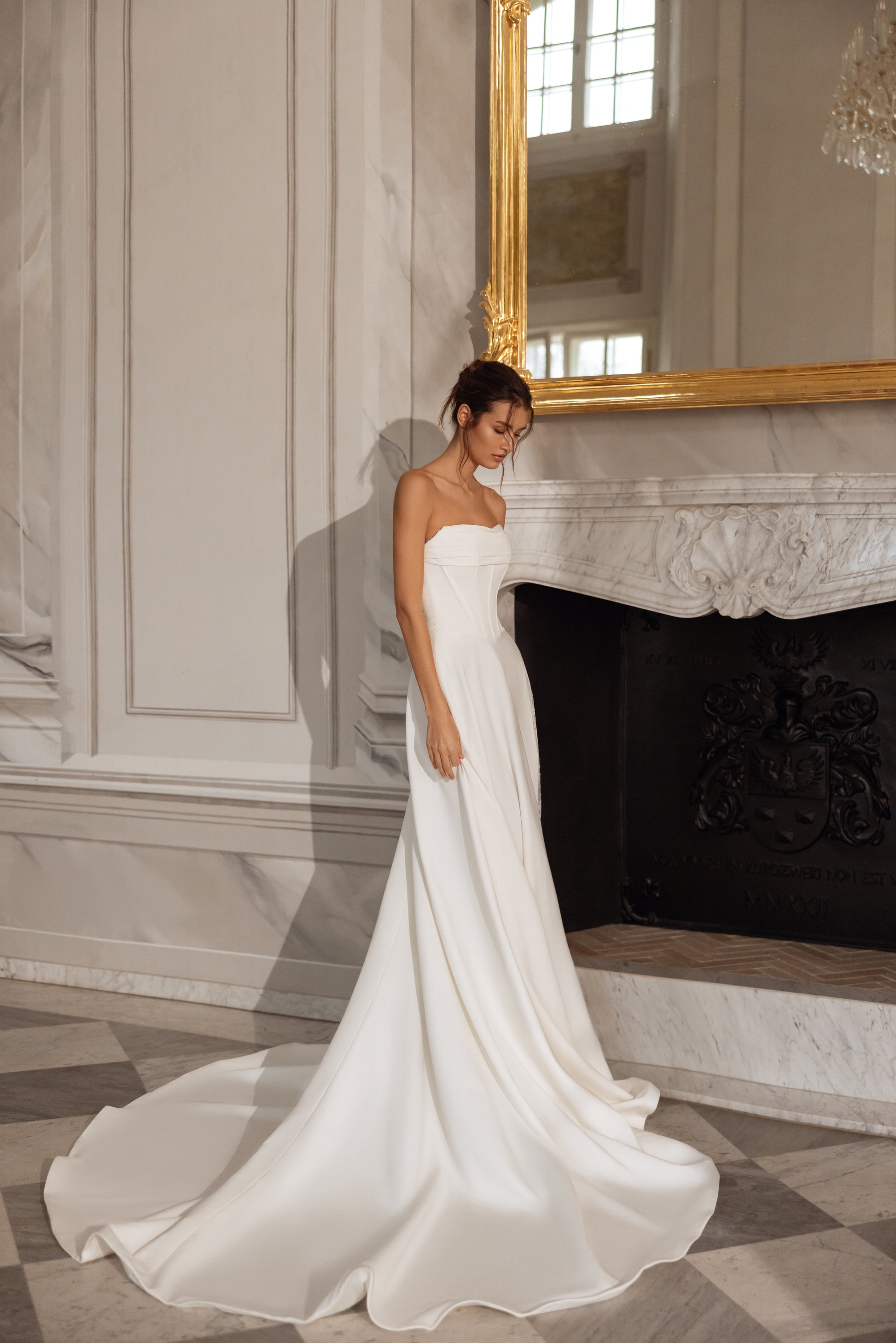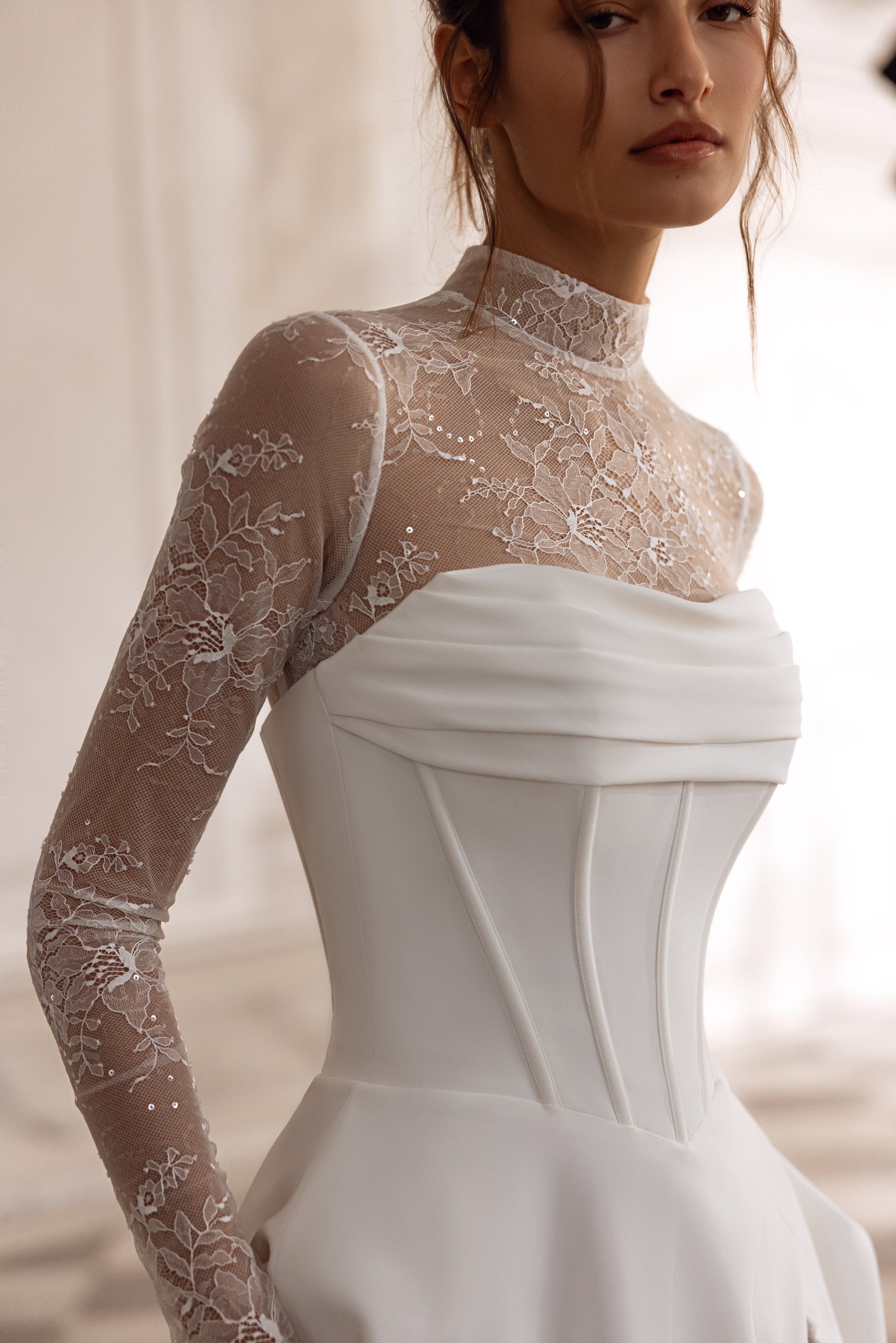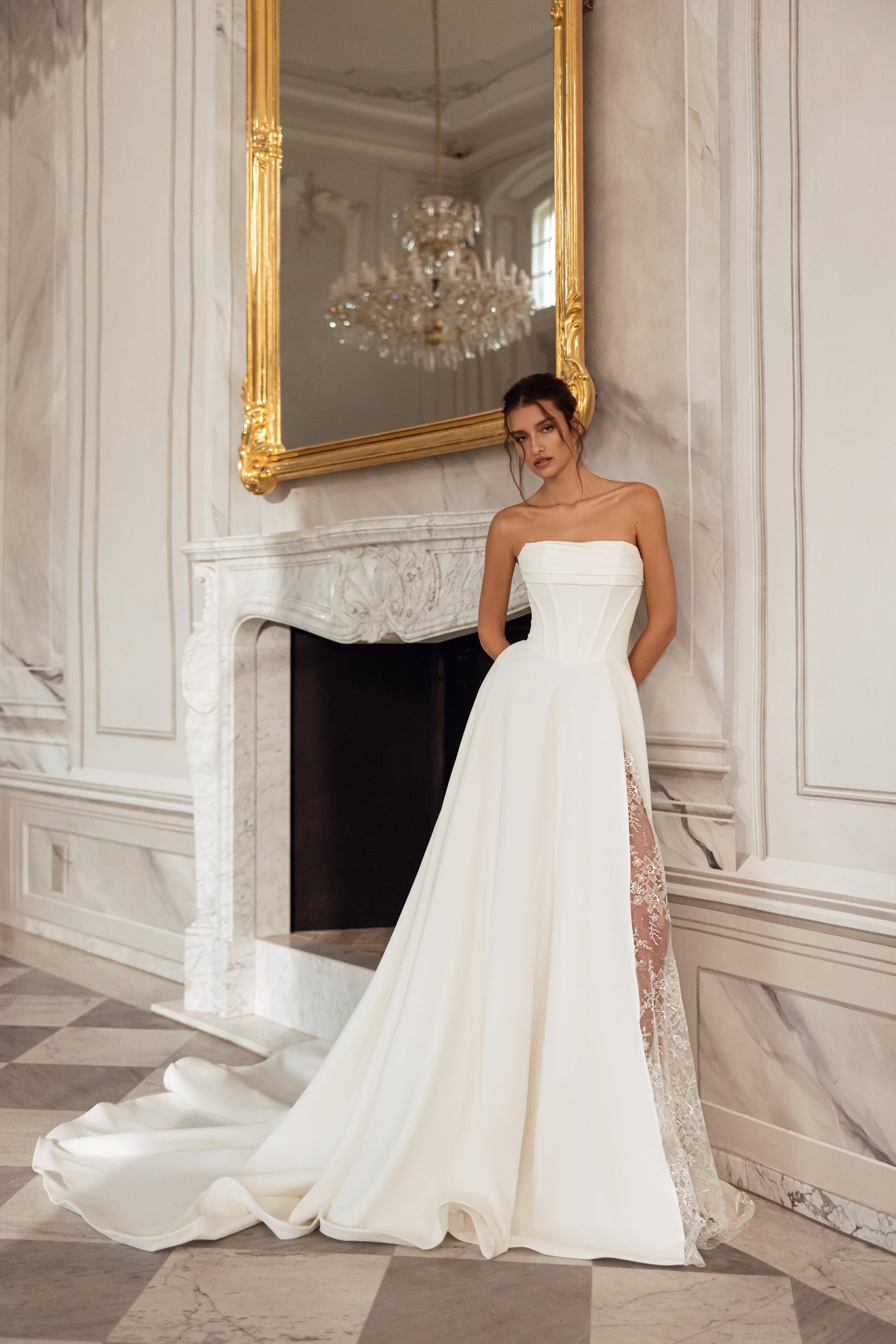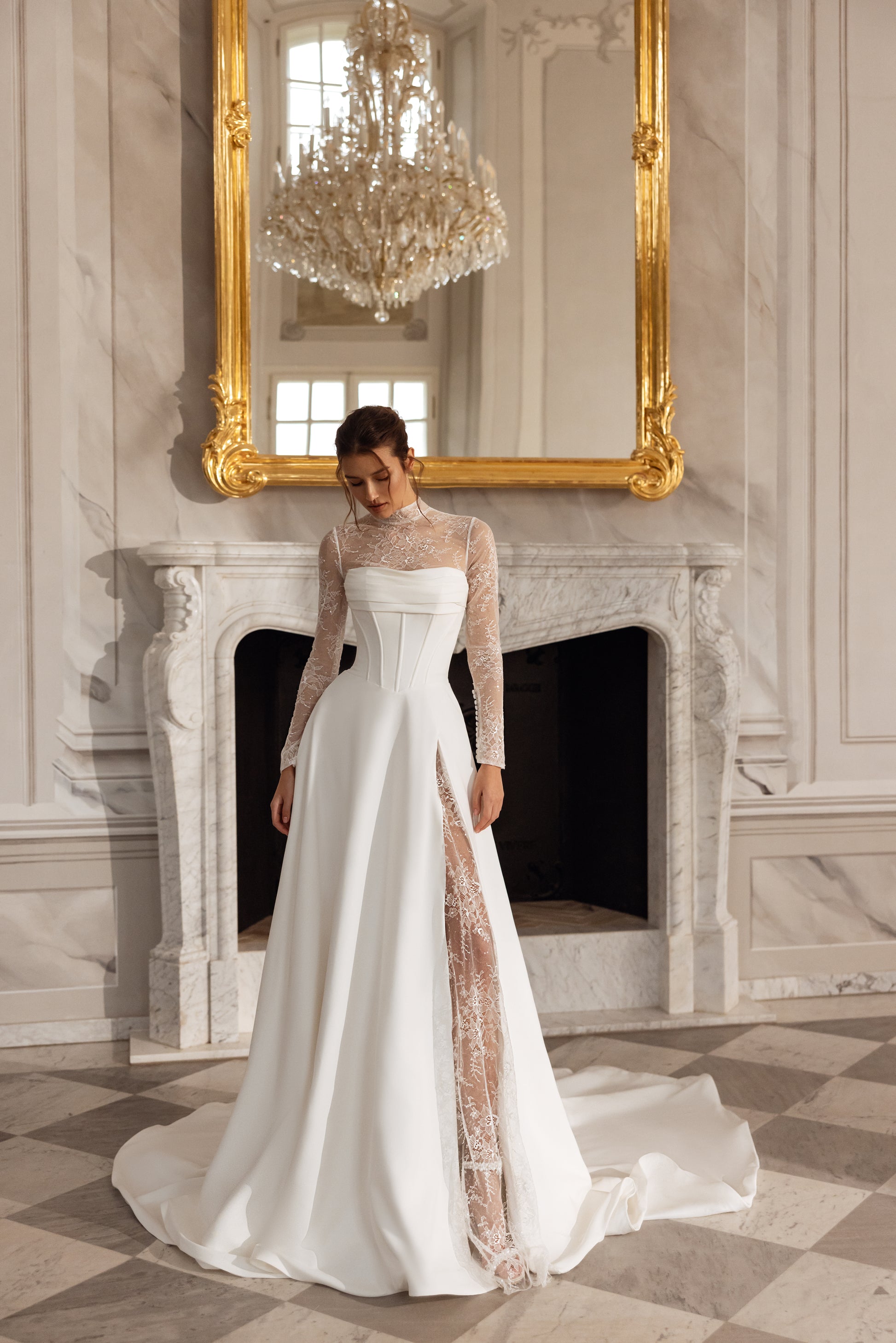 Sleek ivory crepe meets the intricate beauty of beaded Chantilly lace in this sculpted A-line gown. A dramatic slit reveals a shimmering lace underskirt, while the detachable Chantilly bolero adds a layer of romance. With a straight neckline and bold silhouette, it’s graceful, daring, and endlessly self-assured.
