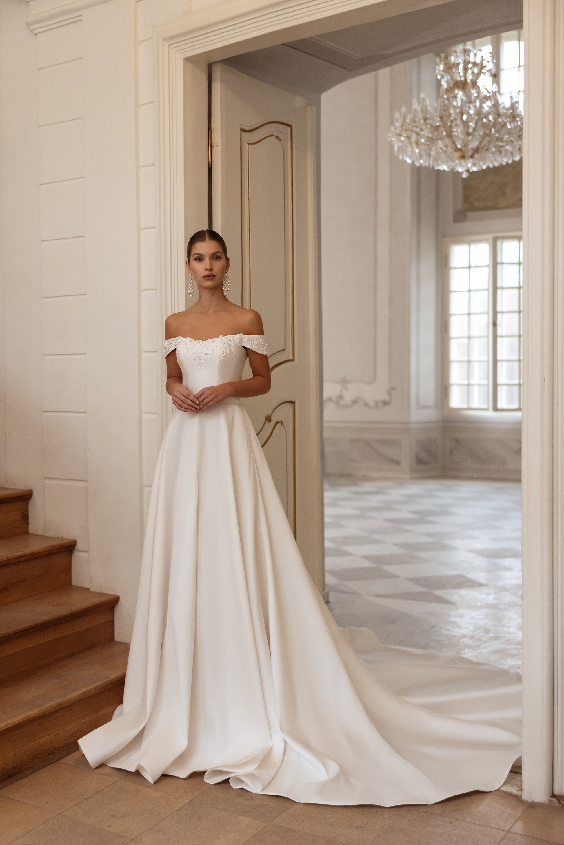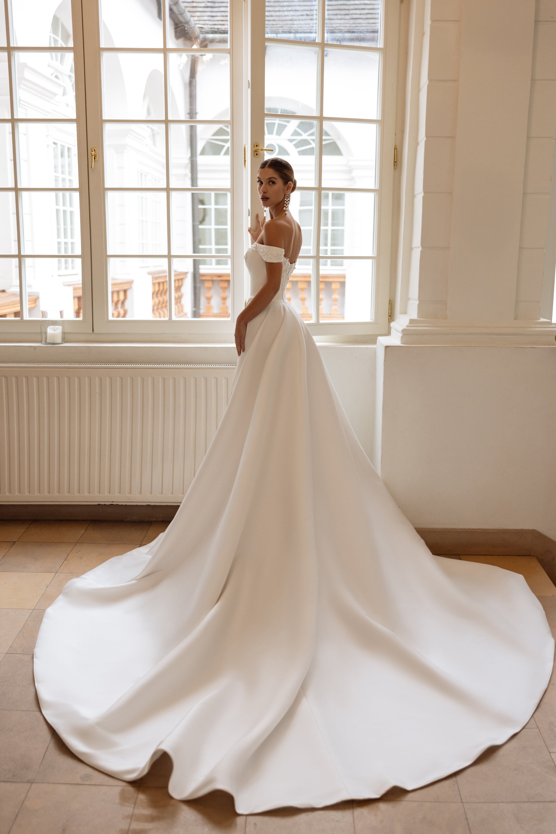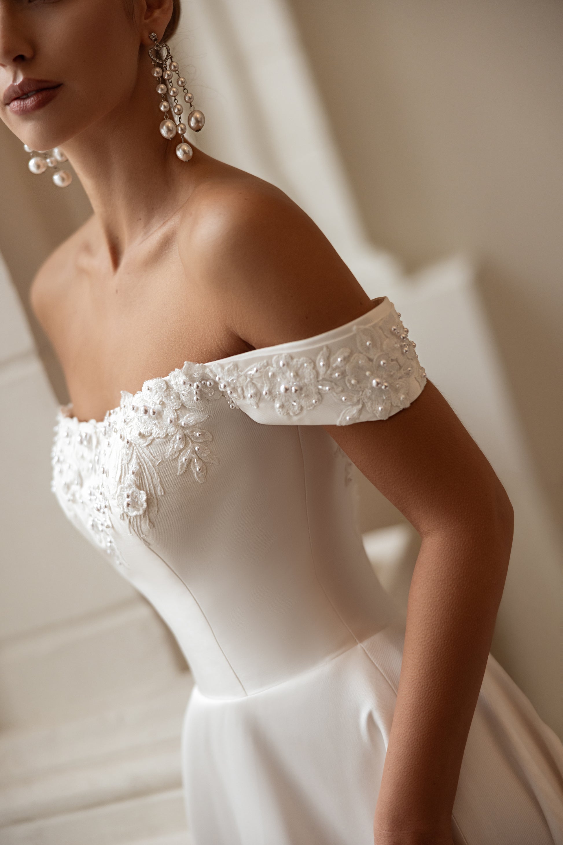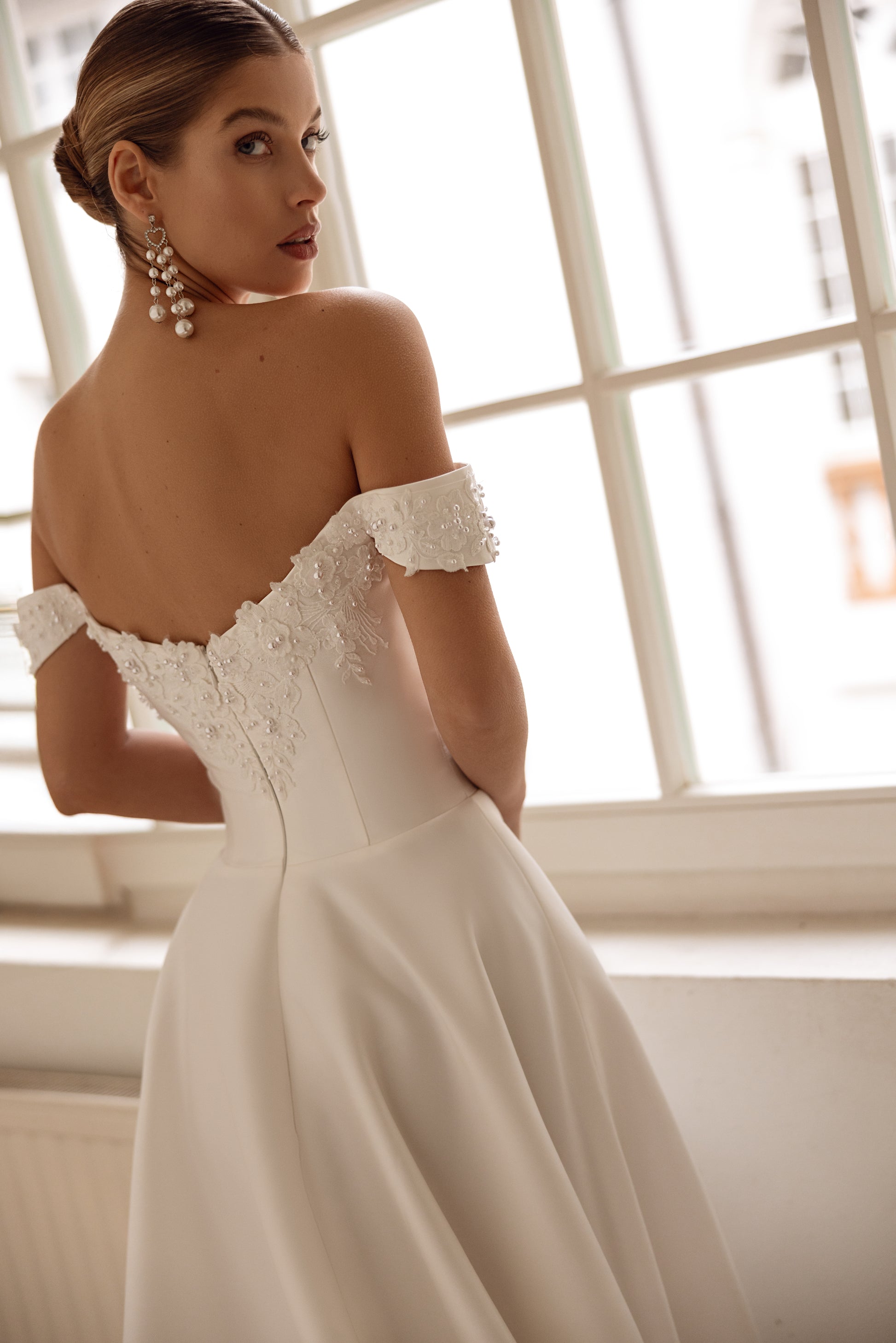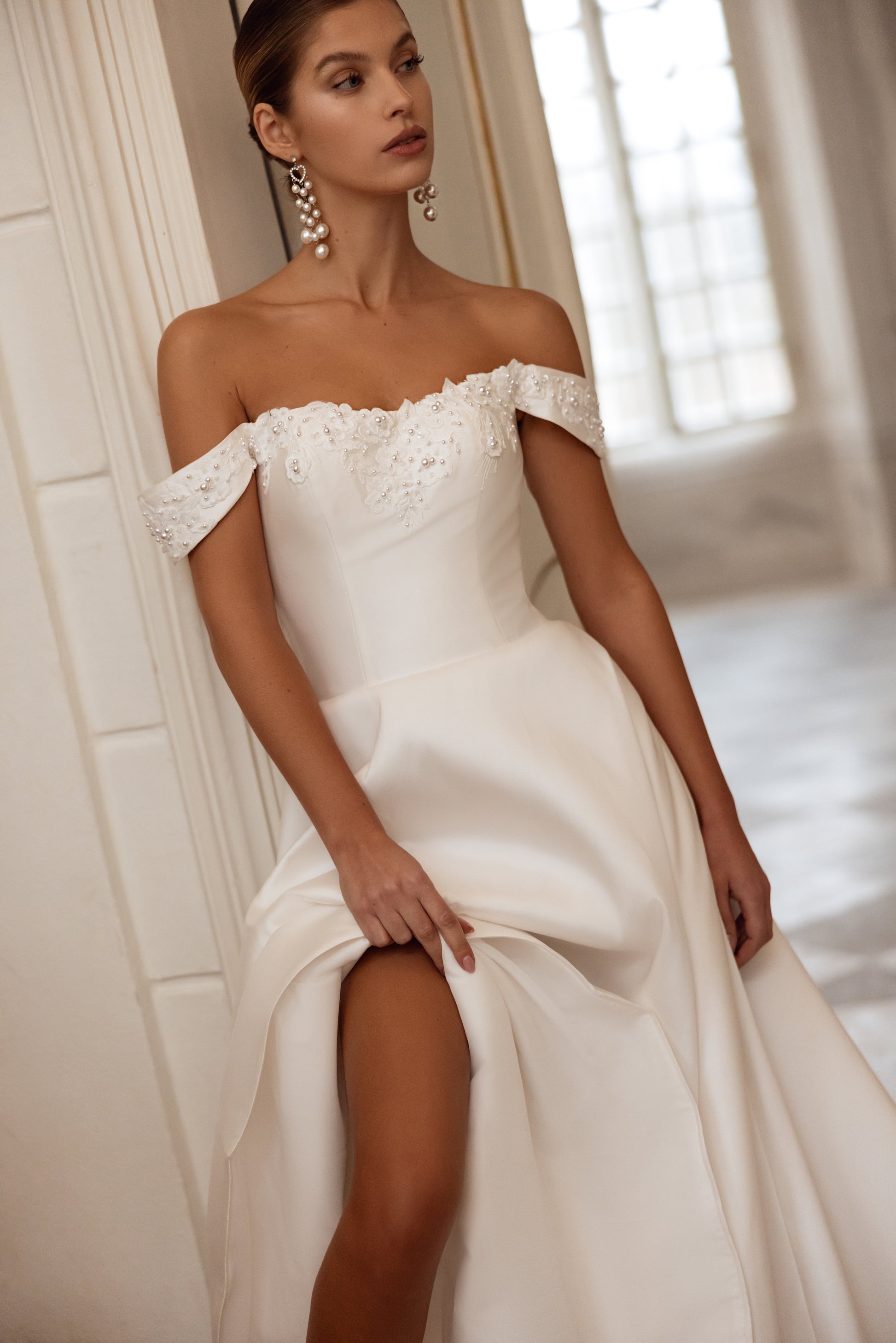 Regal yet effortless, this ivory A-line gown in mikado is a study in refined elegance. A soft sweetheart neckline and delicately draped off-shoulder sleeves are adorned by hand with beaded lace and pearls, creating a look of understated grandeur. Relaxed yet composed, it carries an air of timeless sophistication.