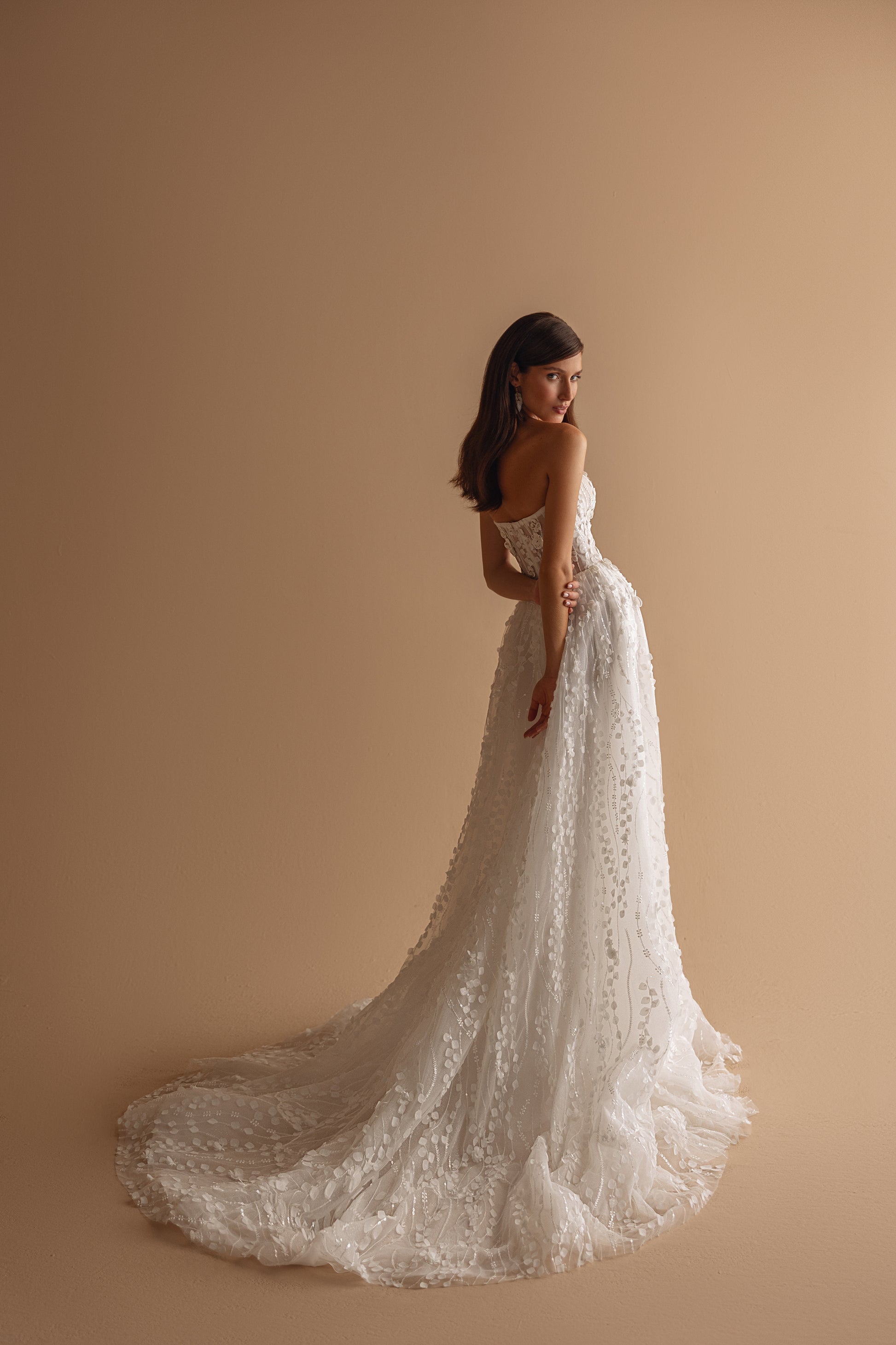 An ivory guipure gown alive with sequins and 3D floral blooms. A blossoming garden of thousands of petals, it exudes intrigue and self-awareness, offering a captivating balance of calling charm and an air of poised anticipation.