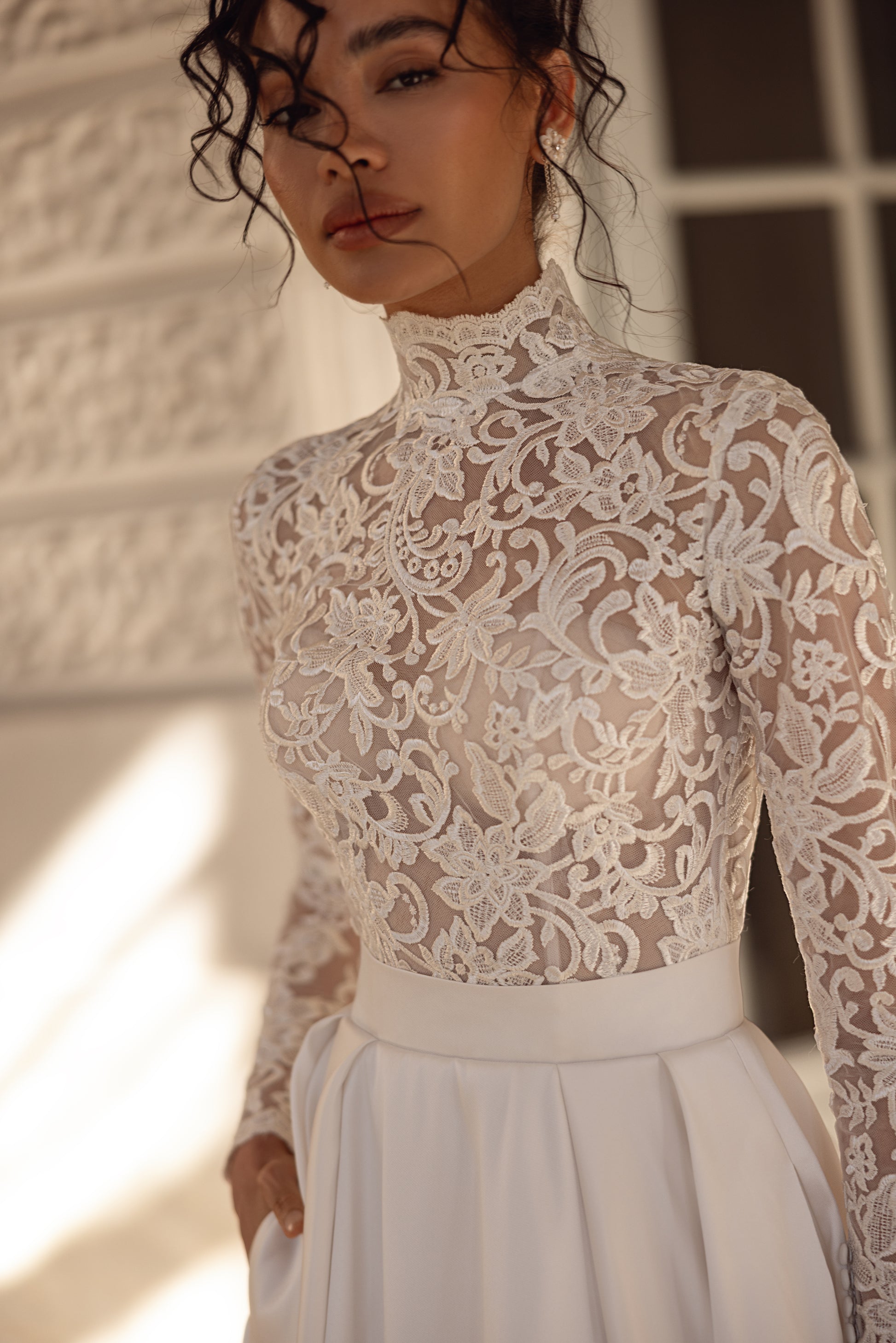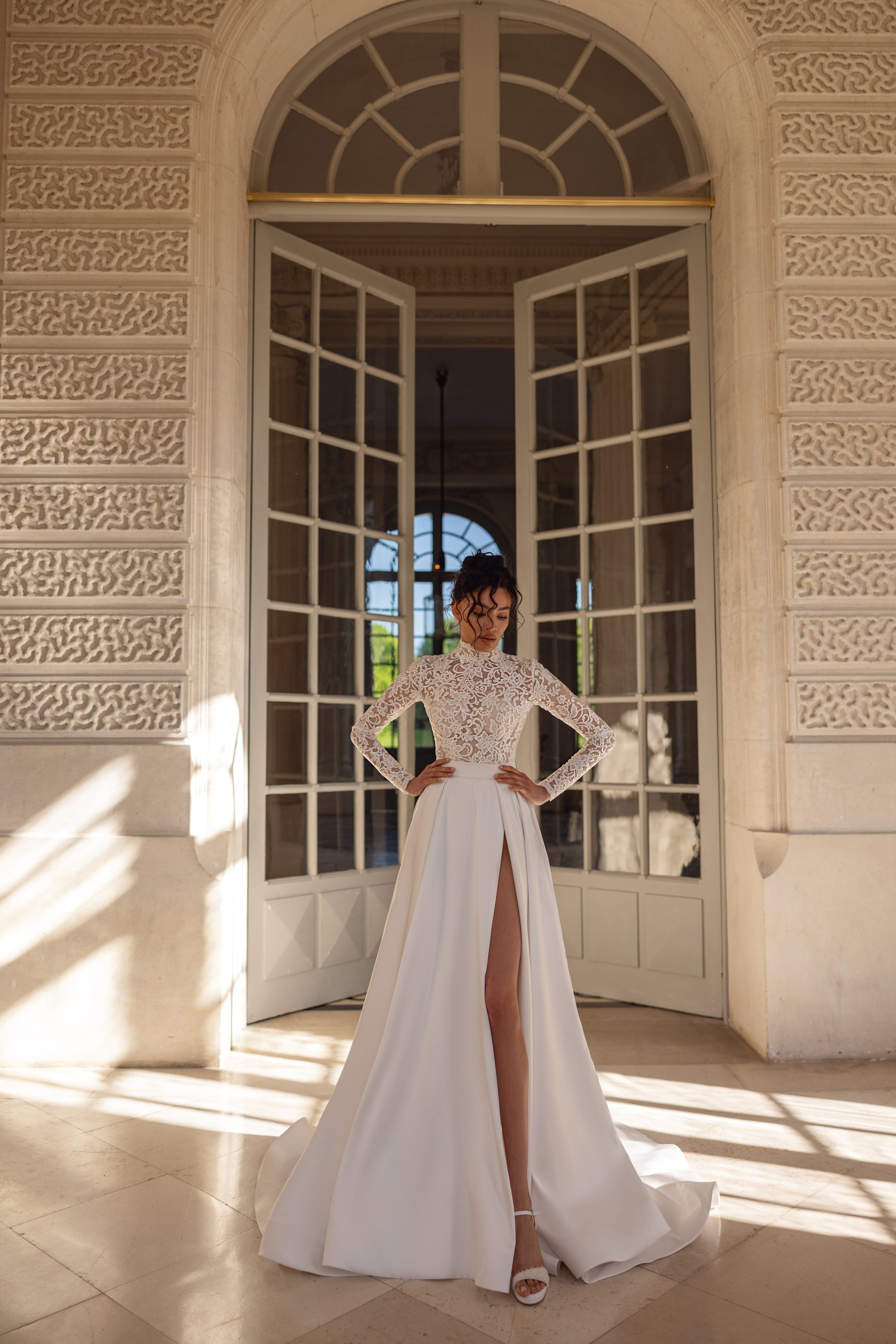 This ivory A-line dress strikes a perfect balance between structure and softness. The mikado skirt flows in precise pleats, while the guipure corset with its high neckline and long sleeves brings a refined, almost dramatic elegance. A thigh-high slit adds unexpected movement, making this look at once timeless and boldly contemporary.