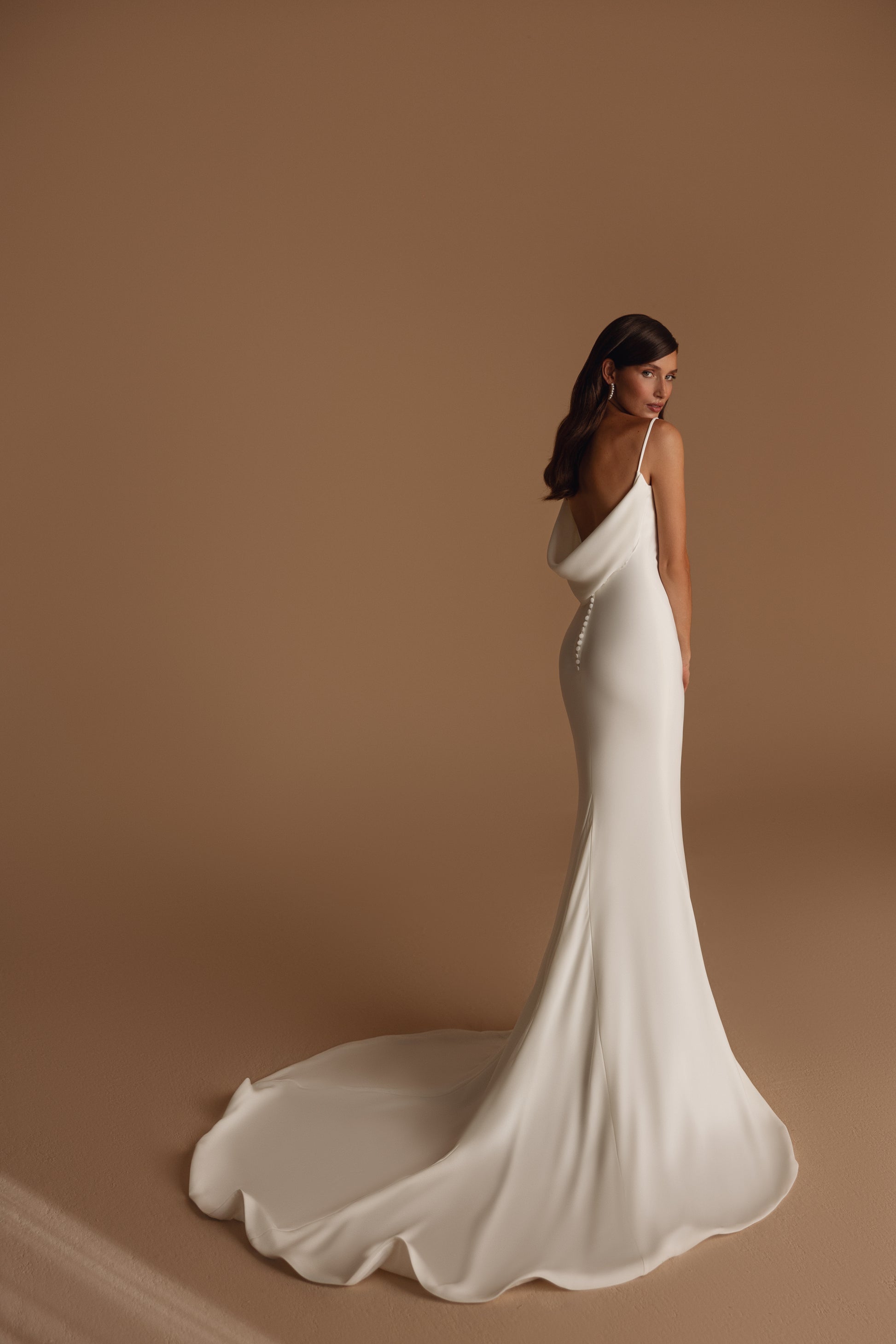 This ivory crepe gown redefines simplicity. Its clean lines are enhanced by an unexpected back detail and a row of tiny buttons trailing the lower back. With an ideal cut and fluid train, it’s both understated and undeniably elegant.