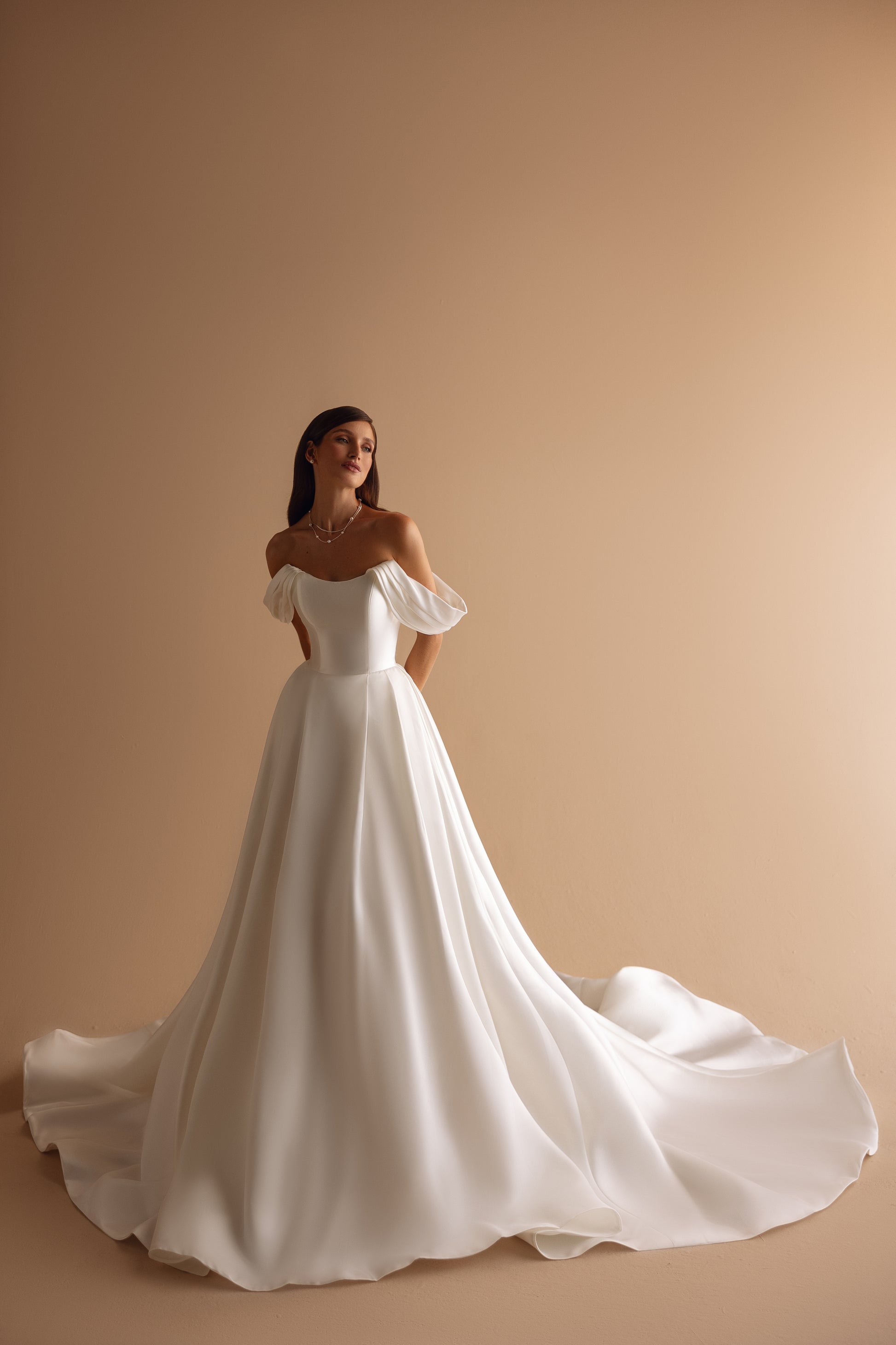 An ivory Mikado gown that blends princess charm with modern poise. Wide, off-shoulder straps frame a smooth, petal-like bodice, while delicate drapes flow gracefully from the waist, evoking the tender beauty of a flower girl’s bloom.
