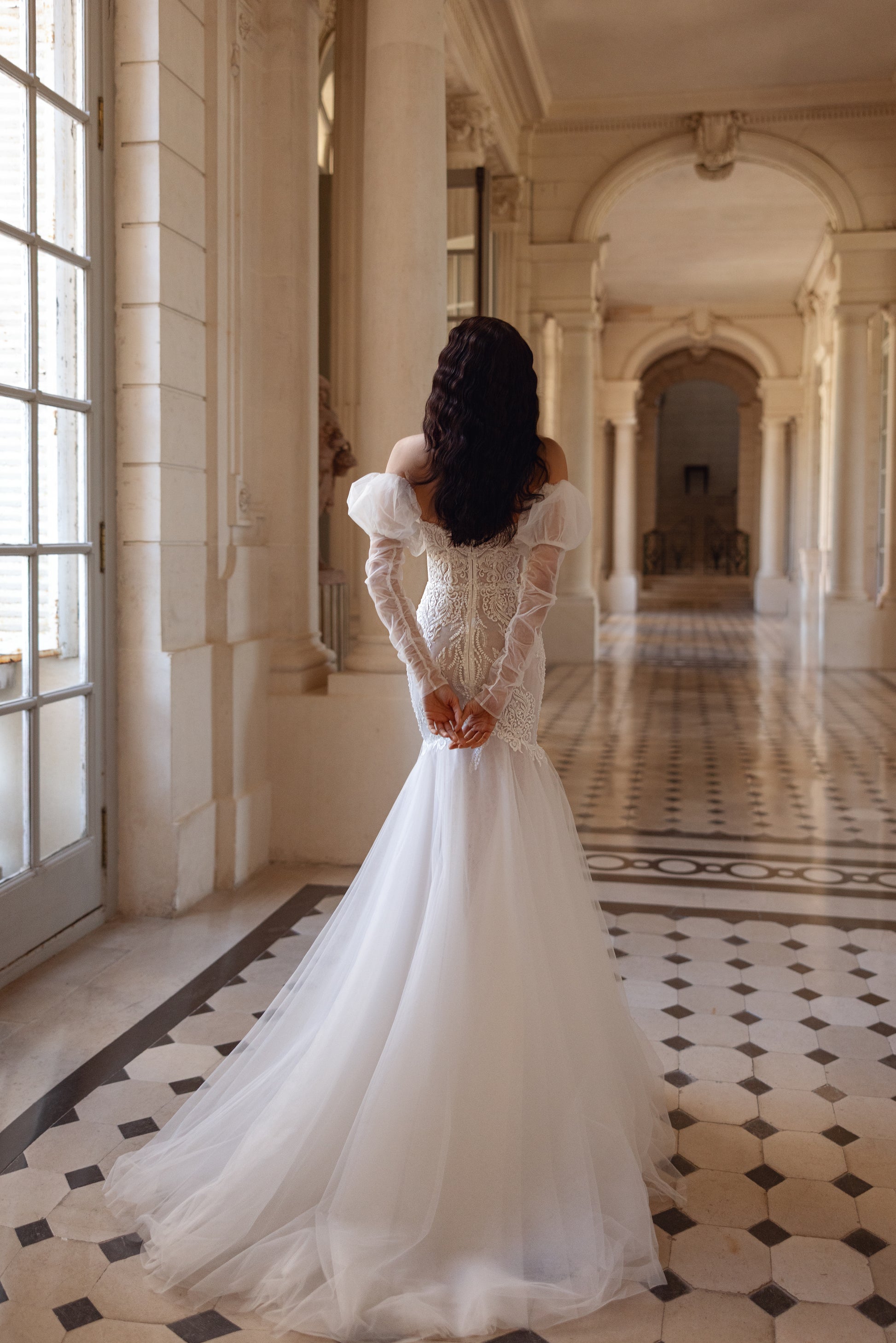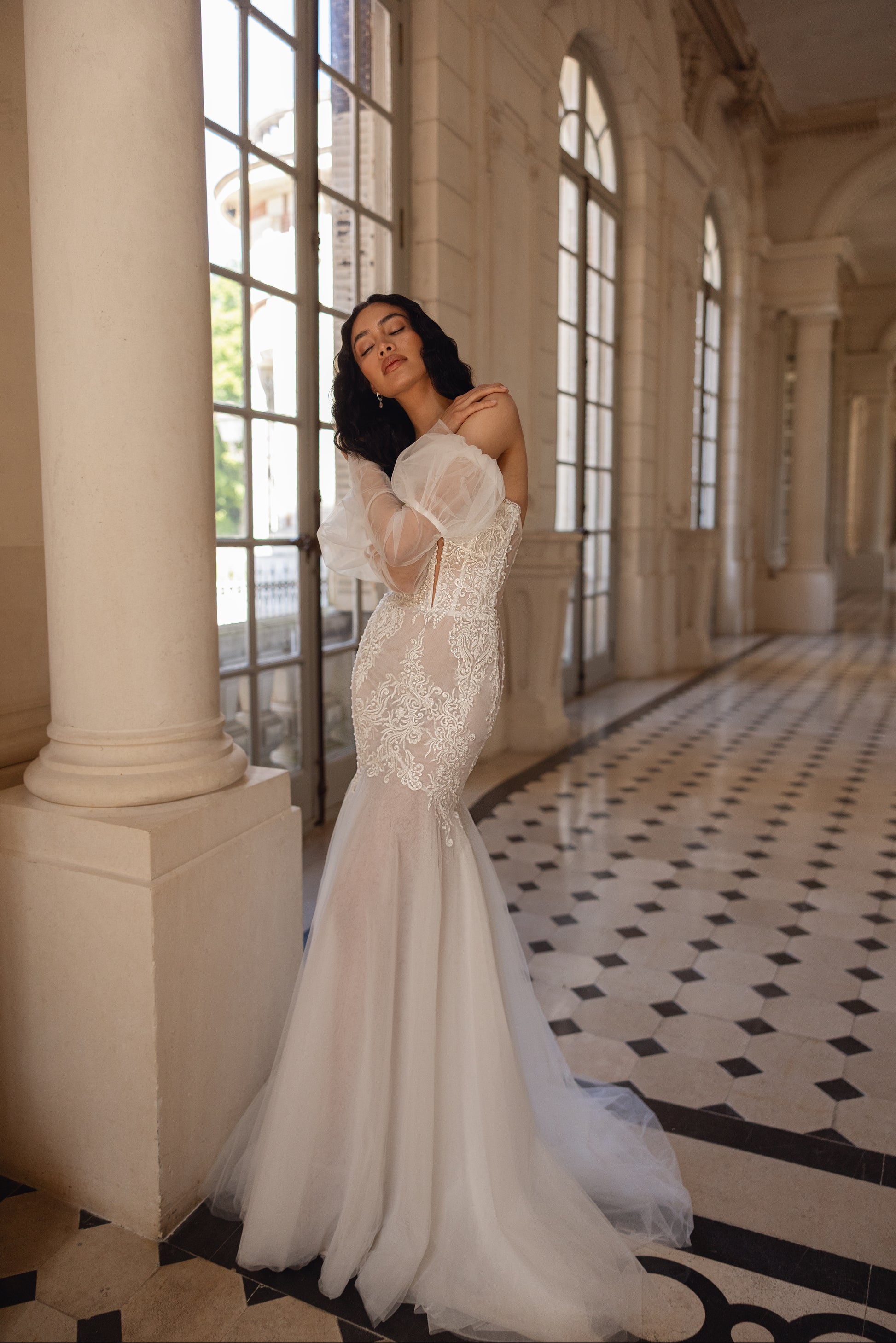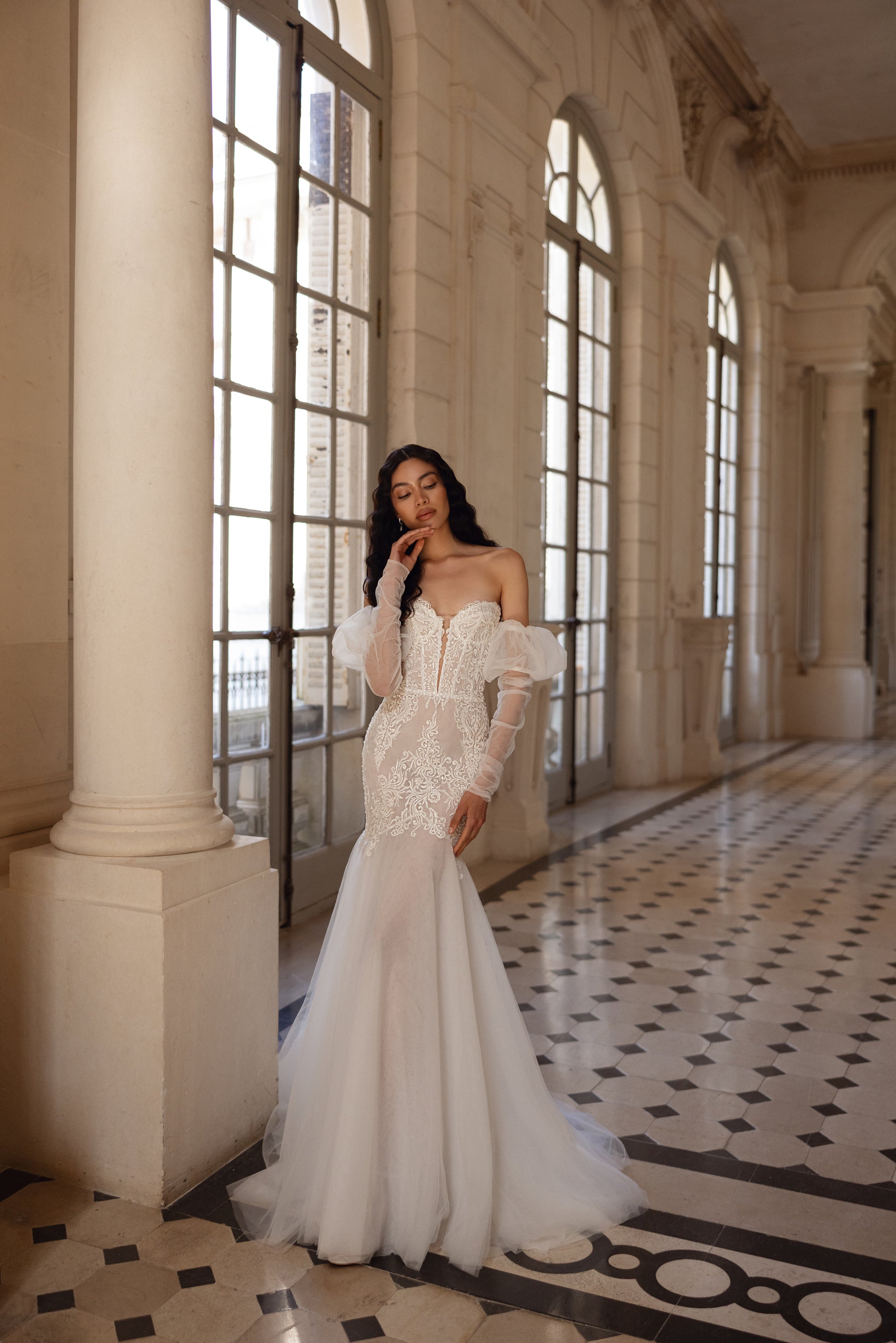 A daring mermaid silhouette meets dreamlike detailing in this ivory dress with sheer mesh sides and a deep sweetheart neckline. The figure-hugging shape is softened by romantic, removable tulle sleeves and a scattering of sequins across the lace. It’s a look that feels both seductive and surprisingly tender.