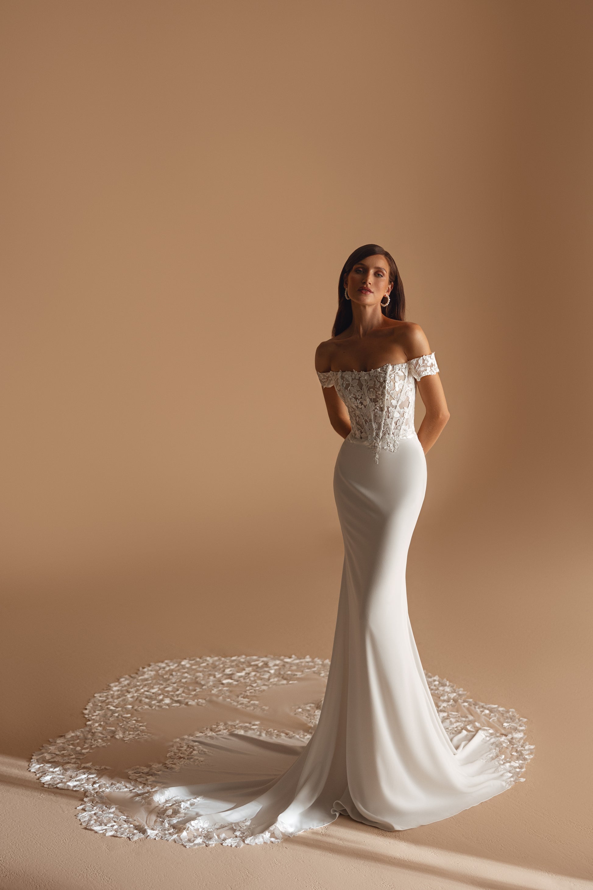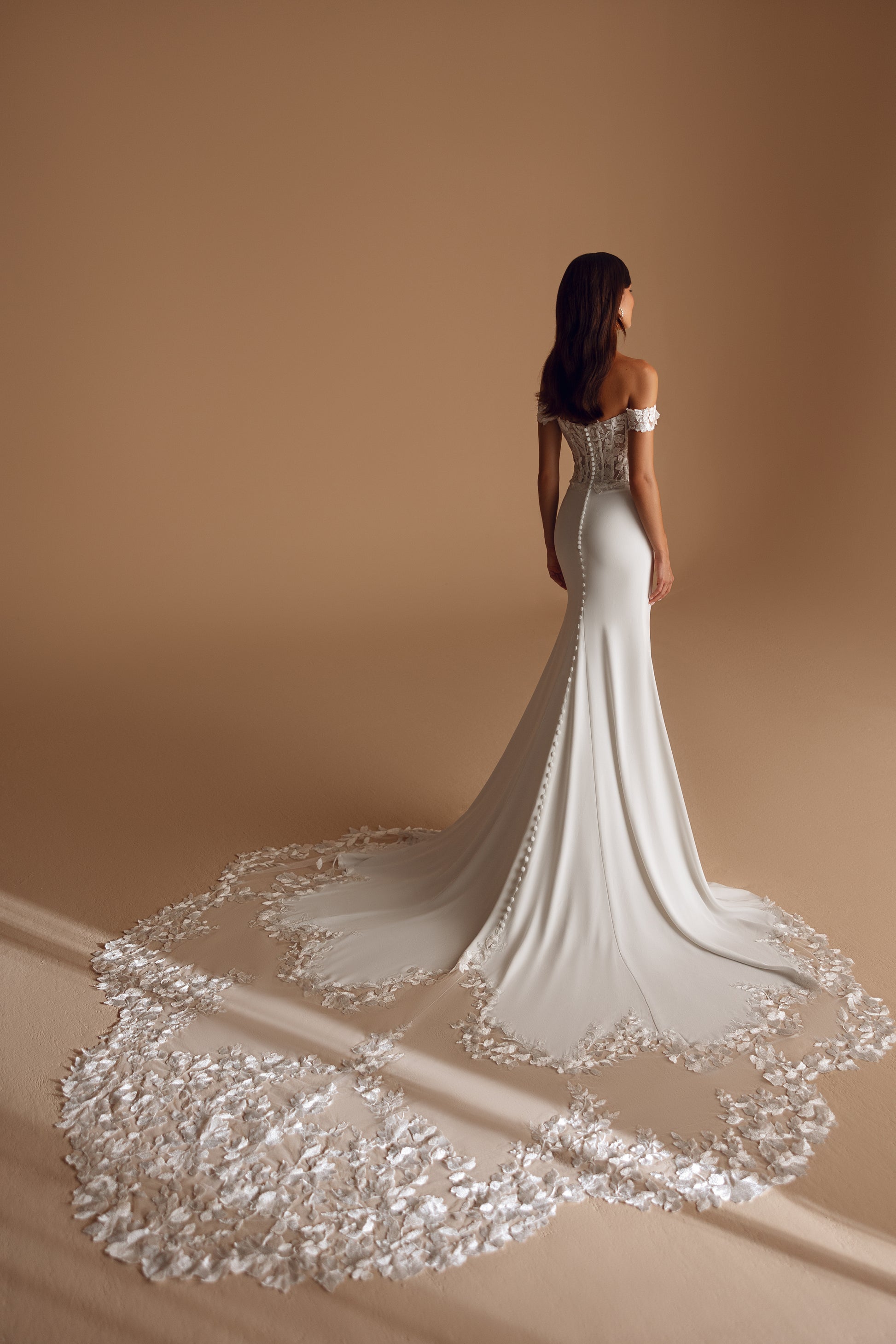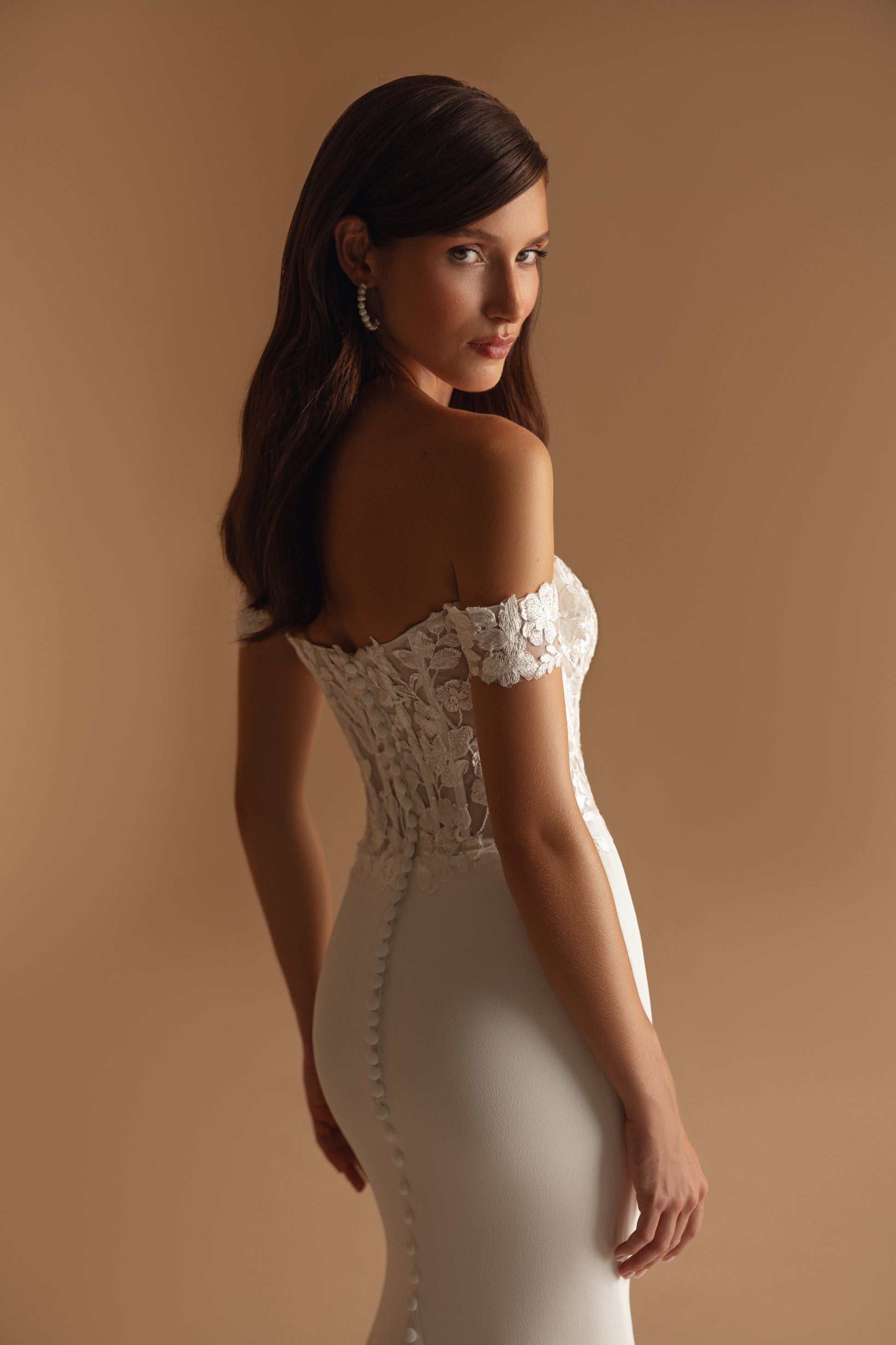 An ivory gown with guipure details and a touch of playfulness, thanks to its youthful charm. The straight, off-shoulder neckline is adorned with cascading floral embellishments. A smooth, noble silhouette is balanced by an intriguing row of buttons running the length of the dress.