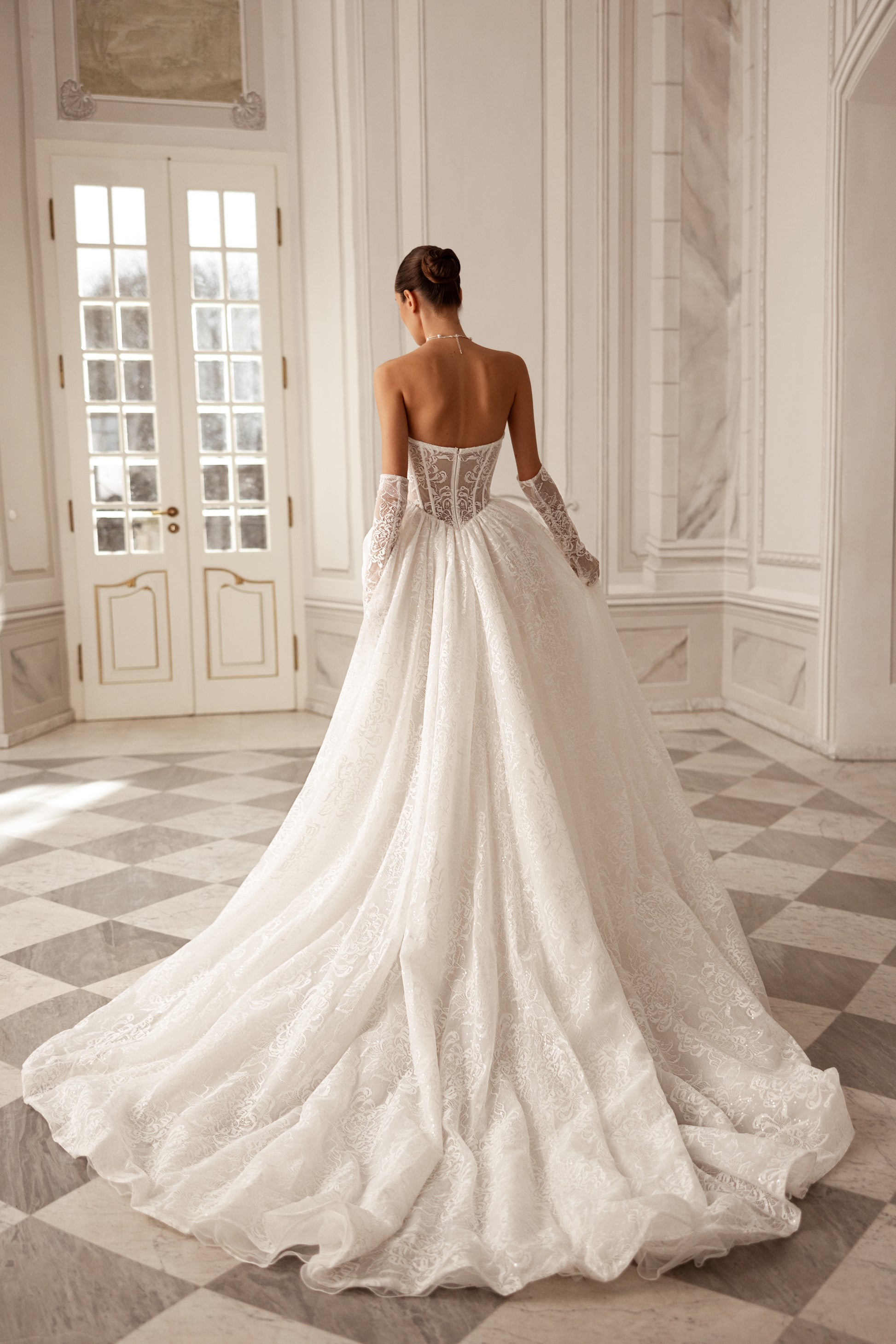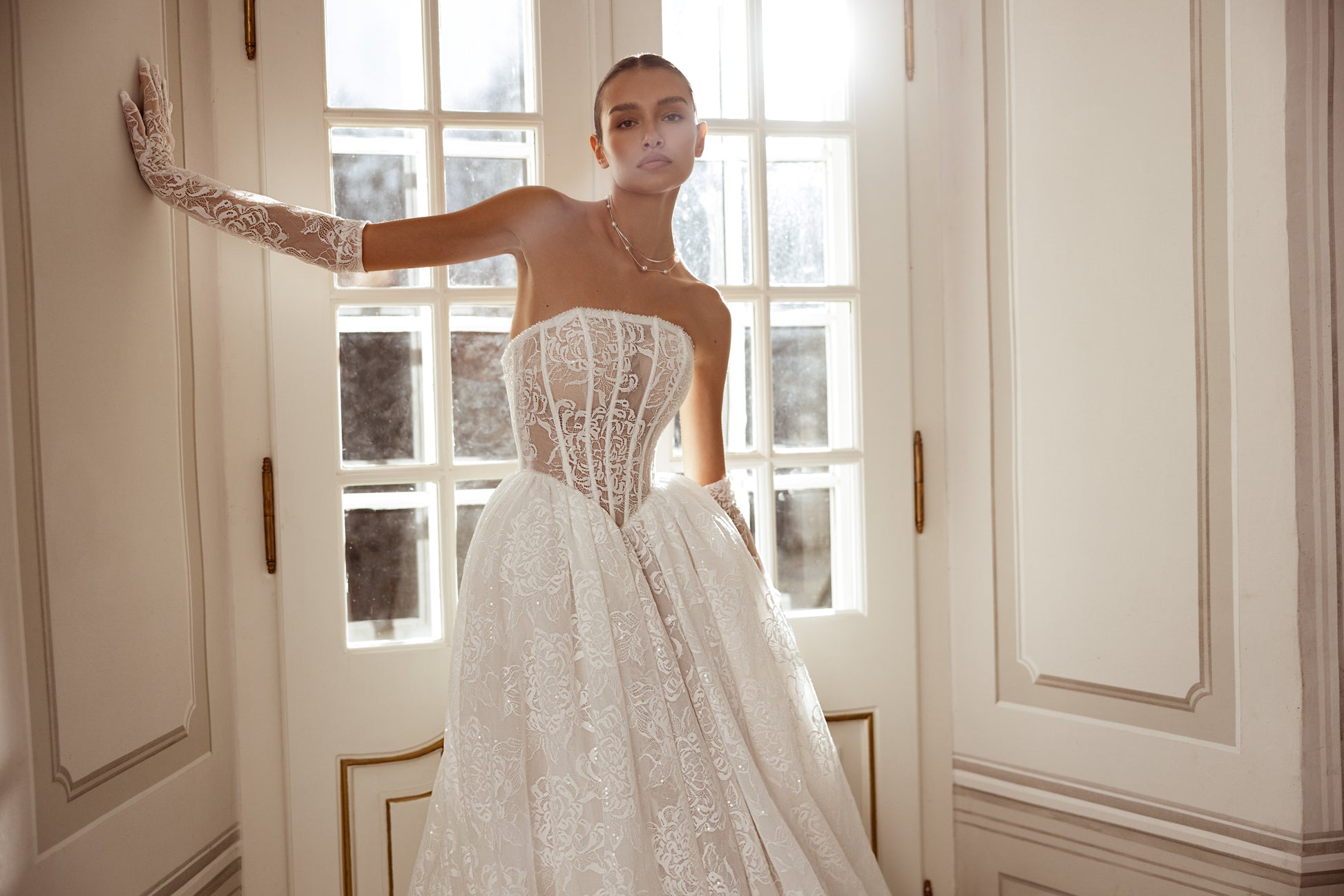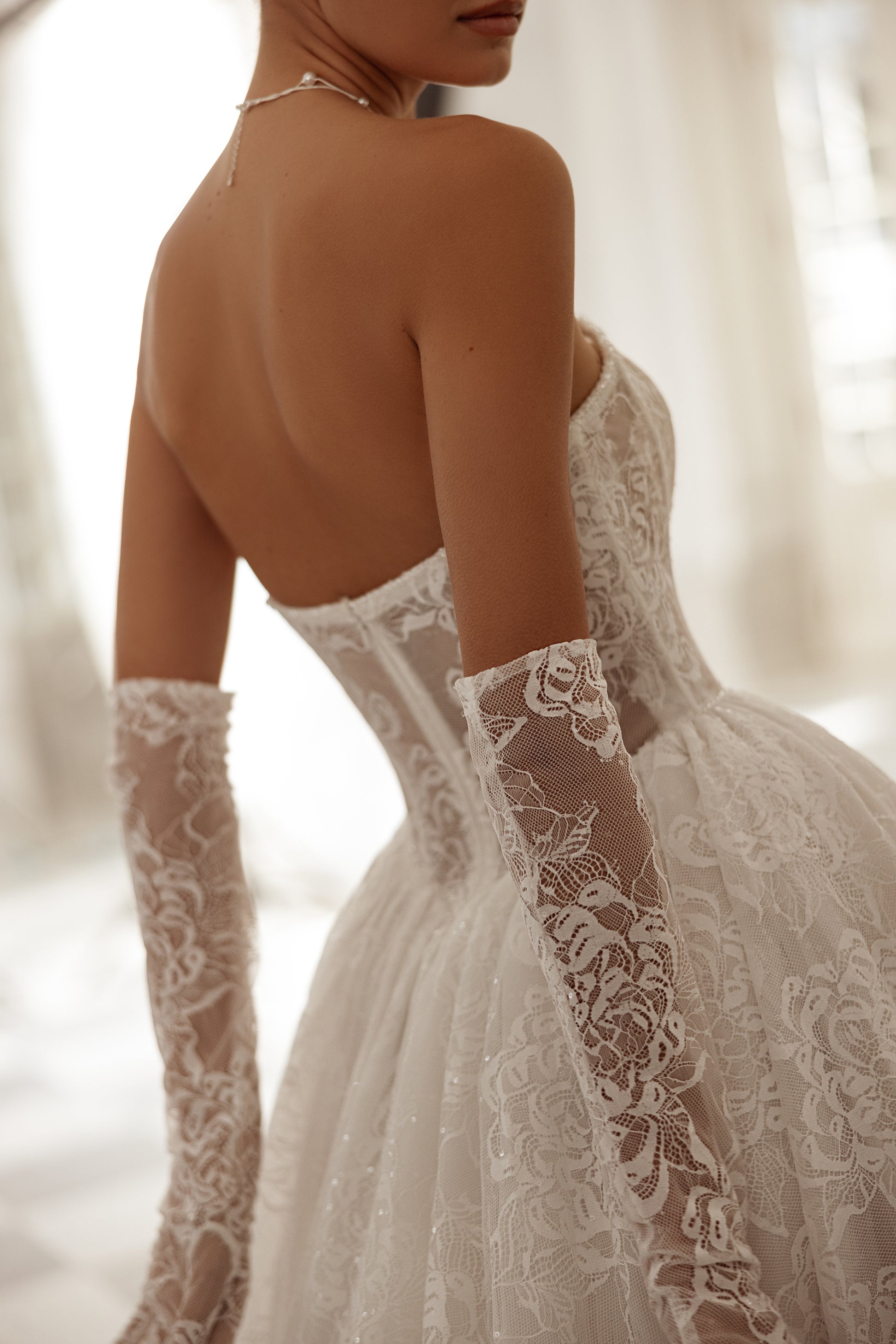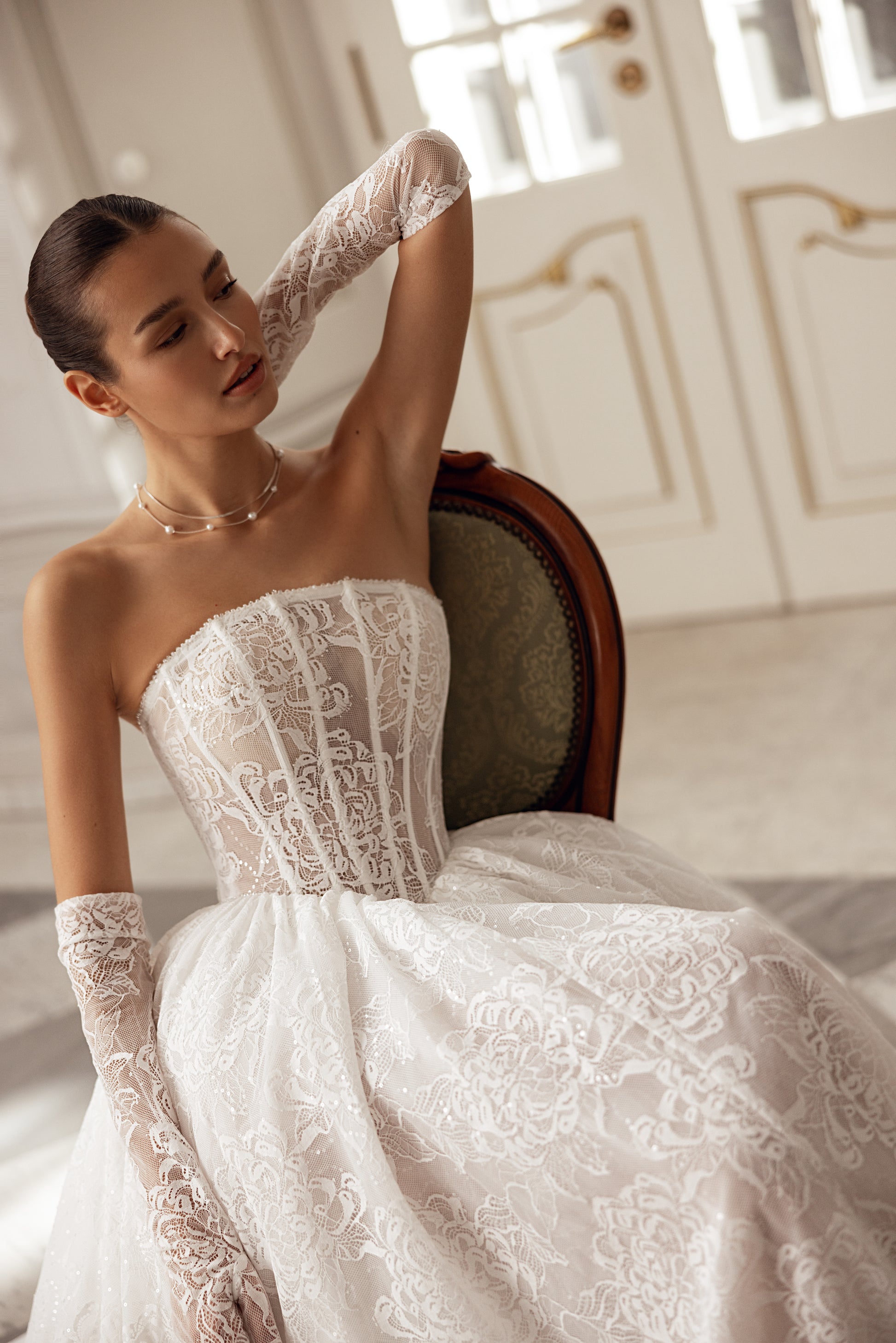 This ivory or cappuccino princess gown captivates with a unique boned corset and an arched neckline, adorned with handmade beaded details. The lush, dramatic skirt adds a sense of opulence, while detachable lace gloves complete this full-flavored feminine look with a touch of allure.