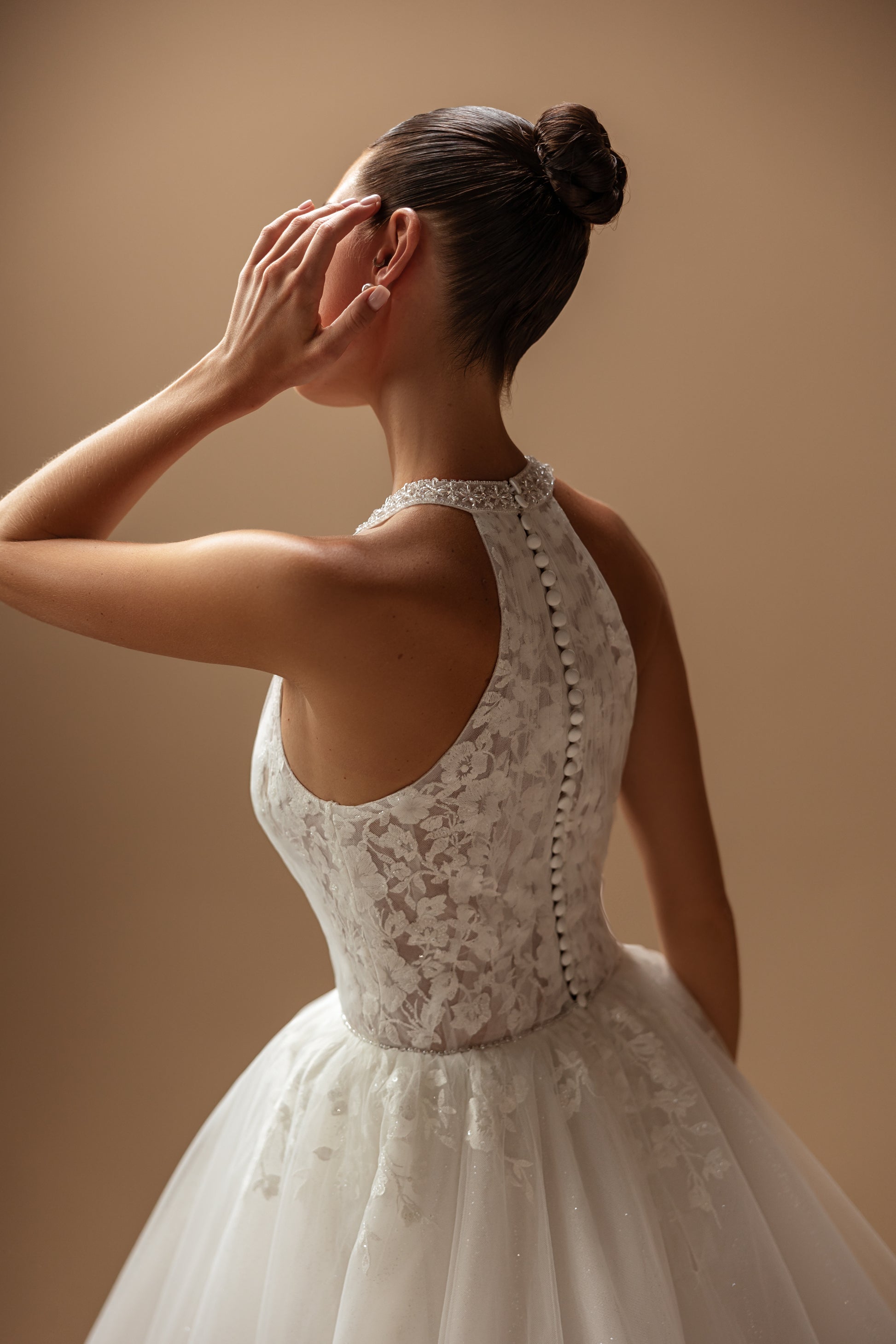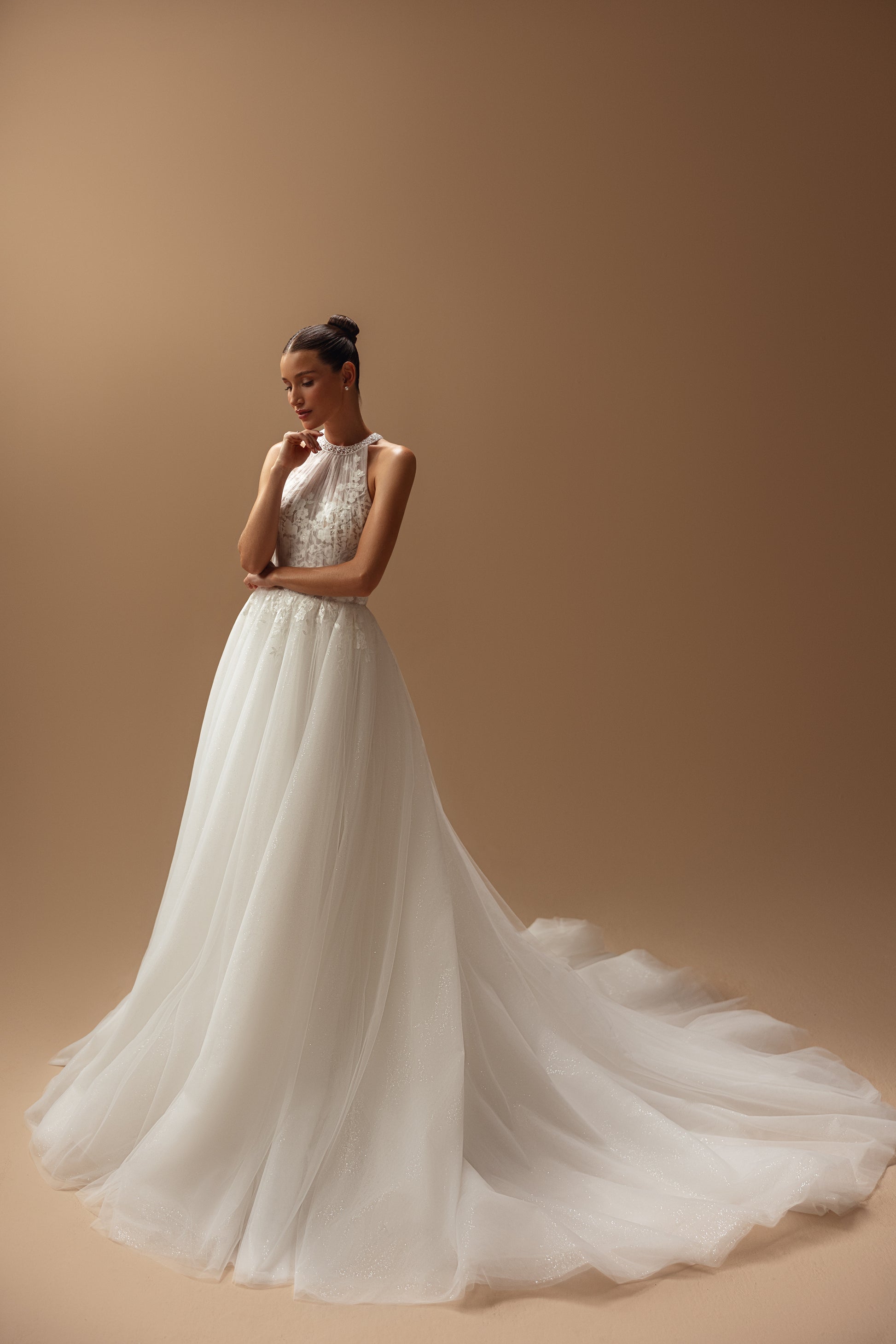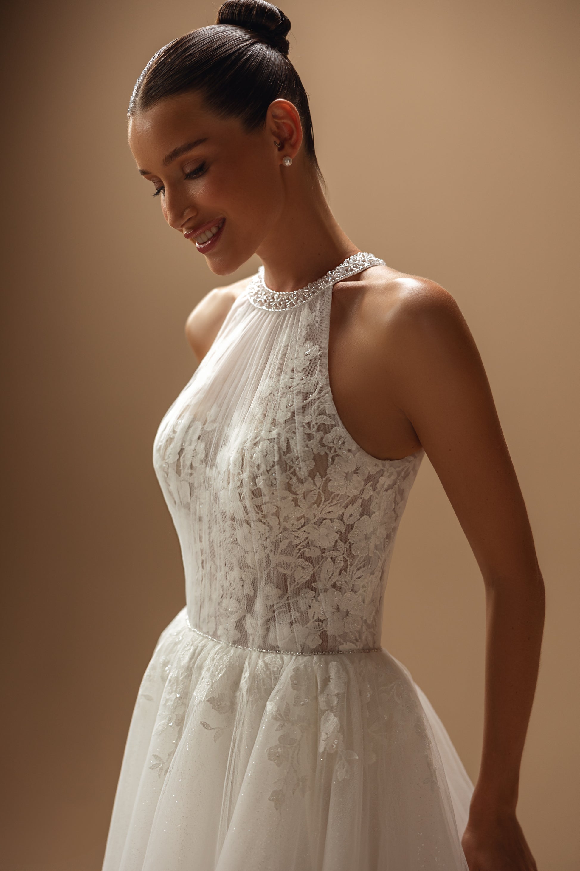 An ivory tulle gown with guipure accents and a halter neckline. Delicate draping graces the bodice, cascading into a majestic skirt and train. The halter neckline beautifully frames the shoulders and shoulder blades, while the round-the-neck design accentuates the neck with effortless charm.