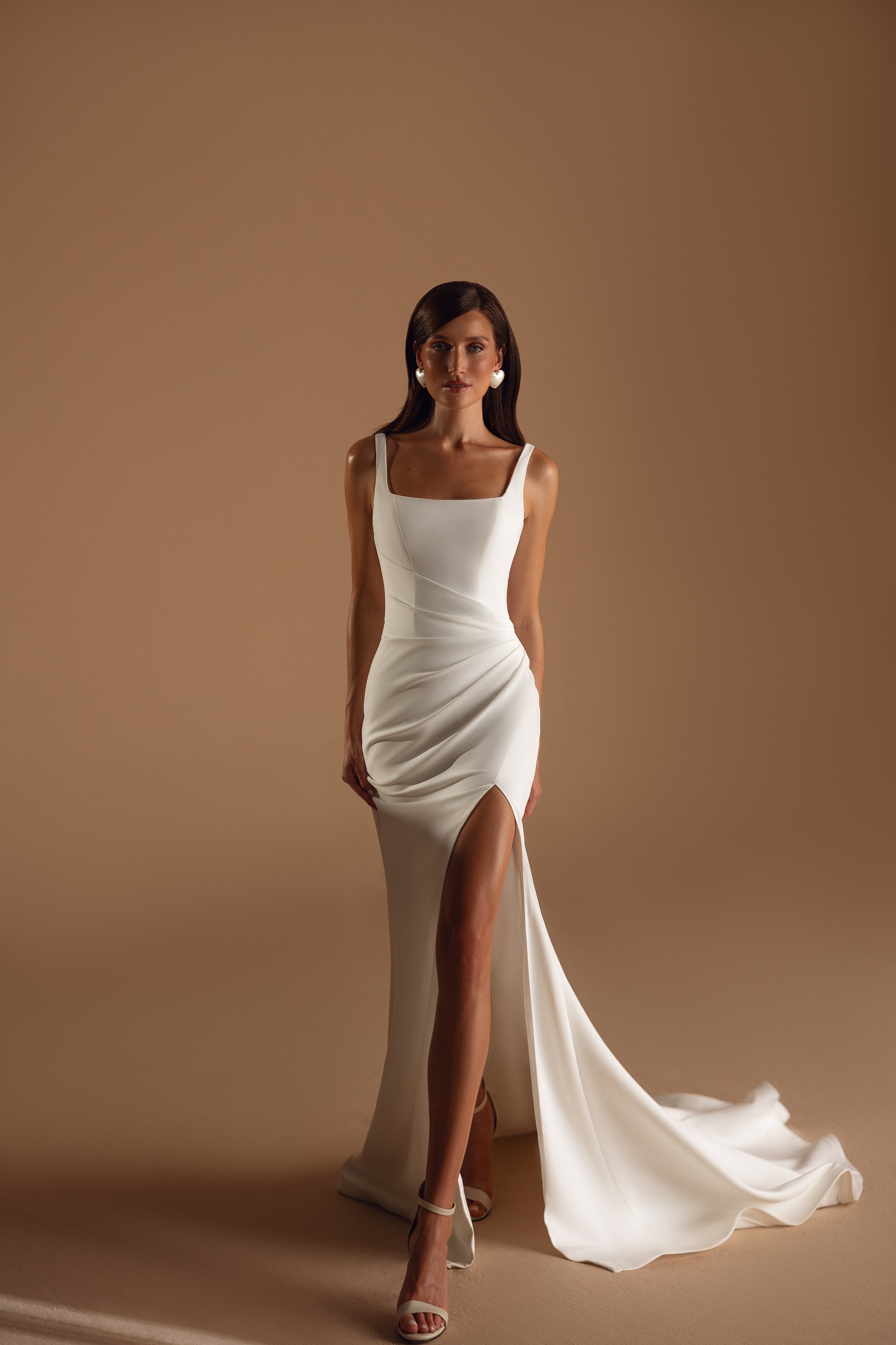 An ivory crepe gown defined by a squared neckline and flawless draping on the bodice and skirt. A fluid silhouette with a seductive slit showcases timeless elegance, alluring simplicity, and a masterfully crafted design that’s undeniably captivating.