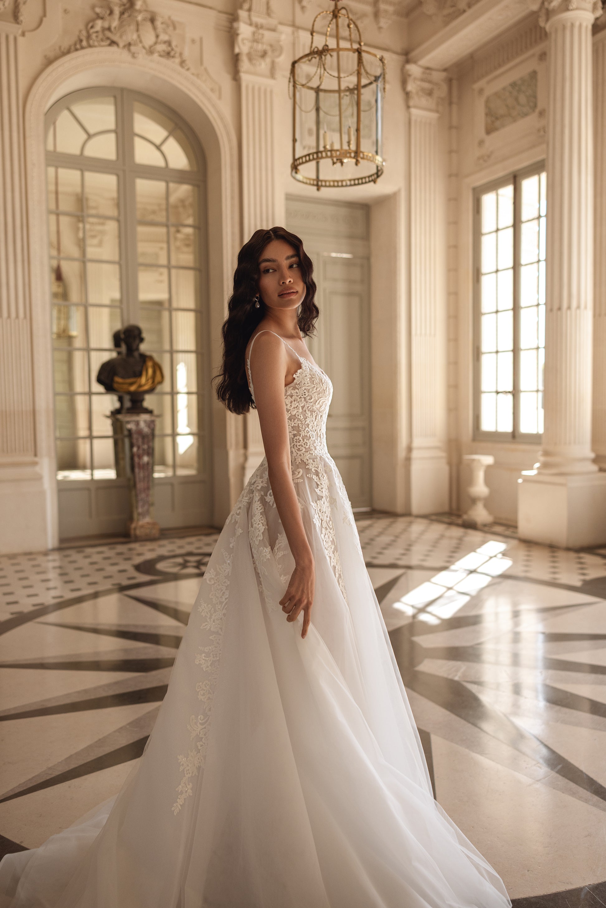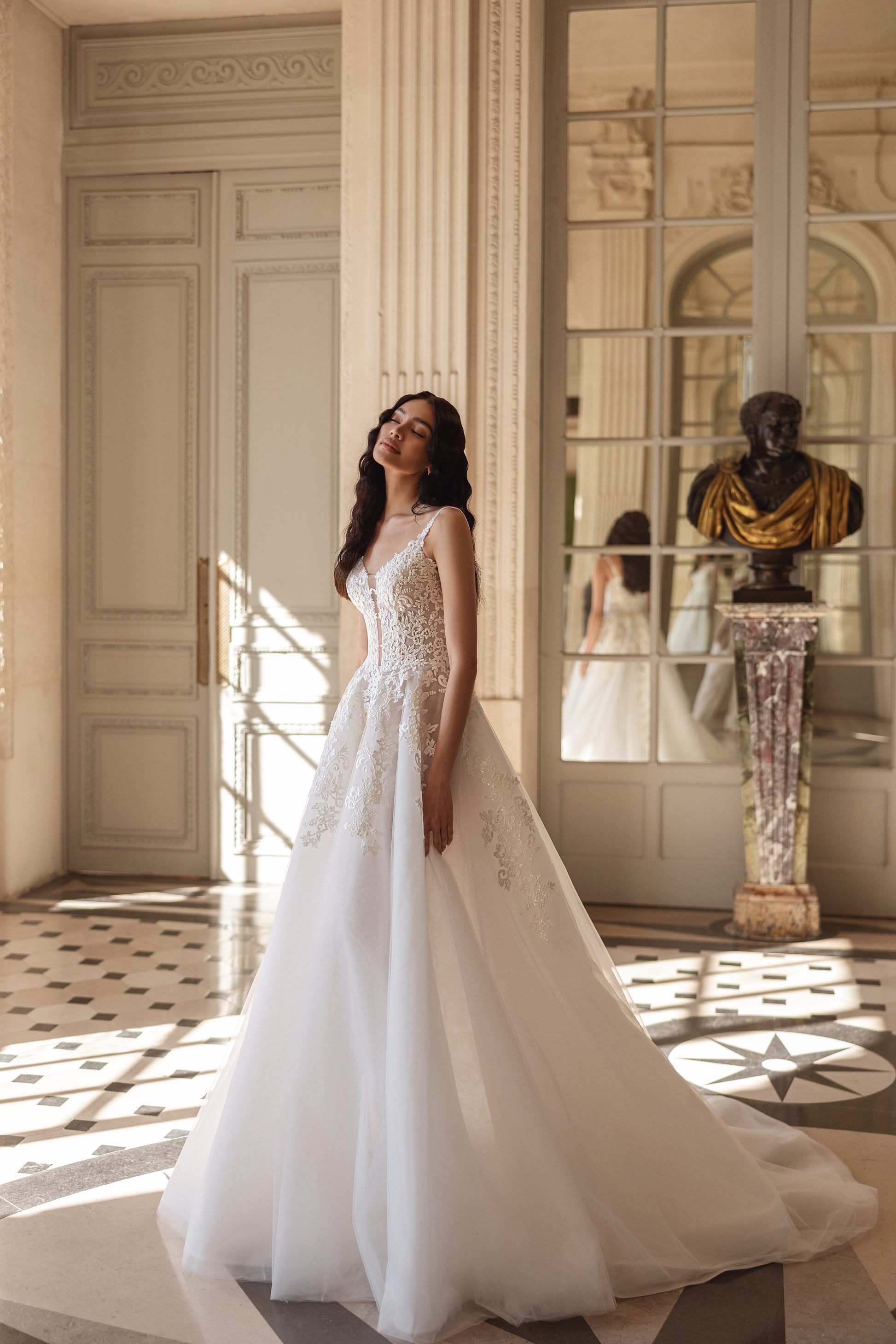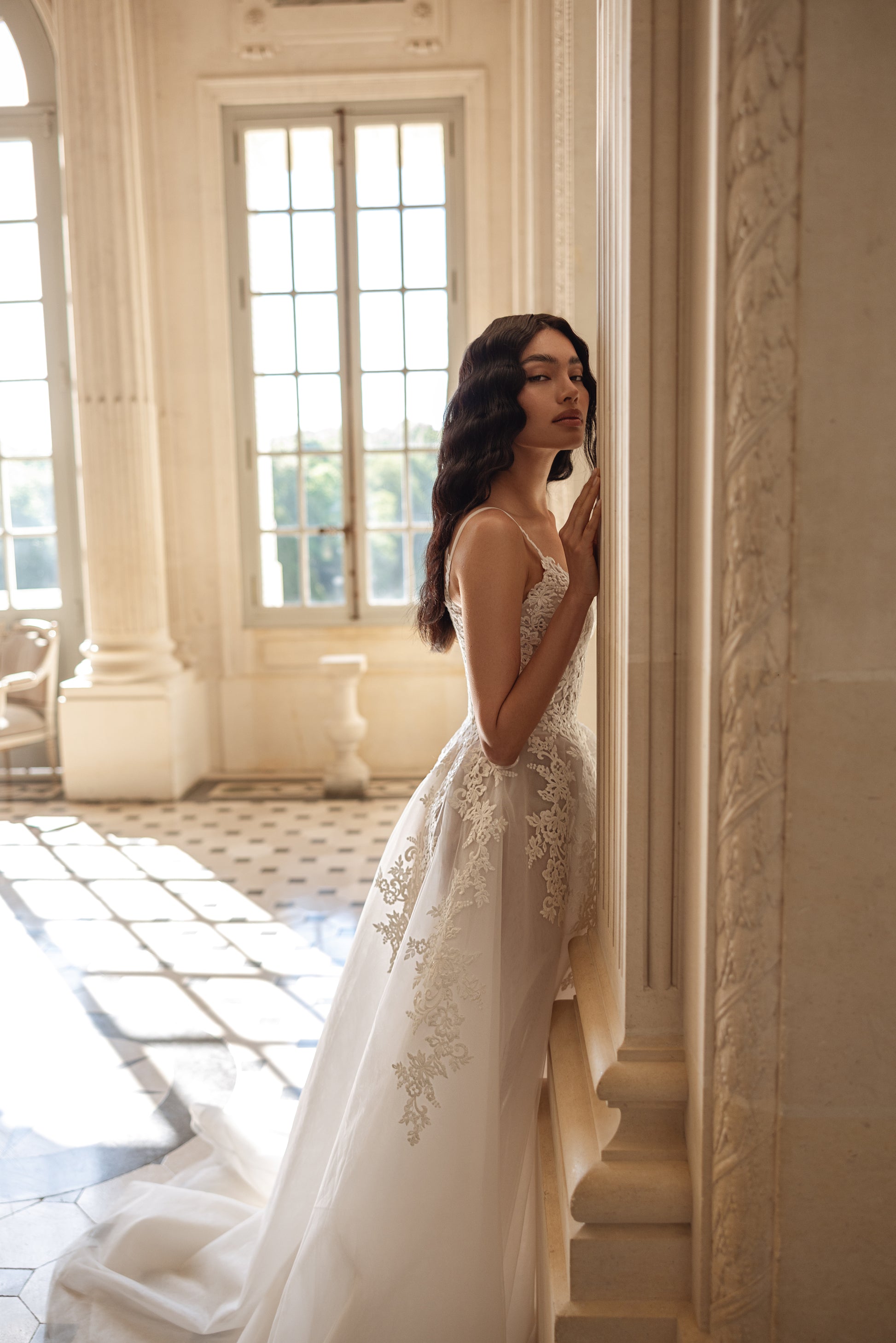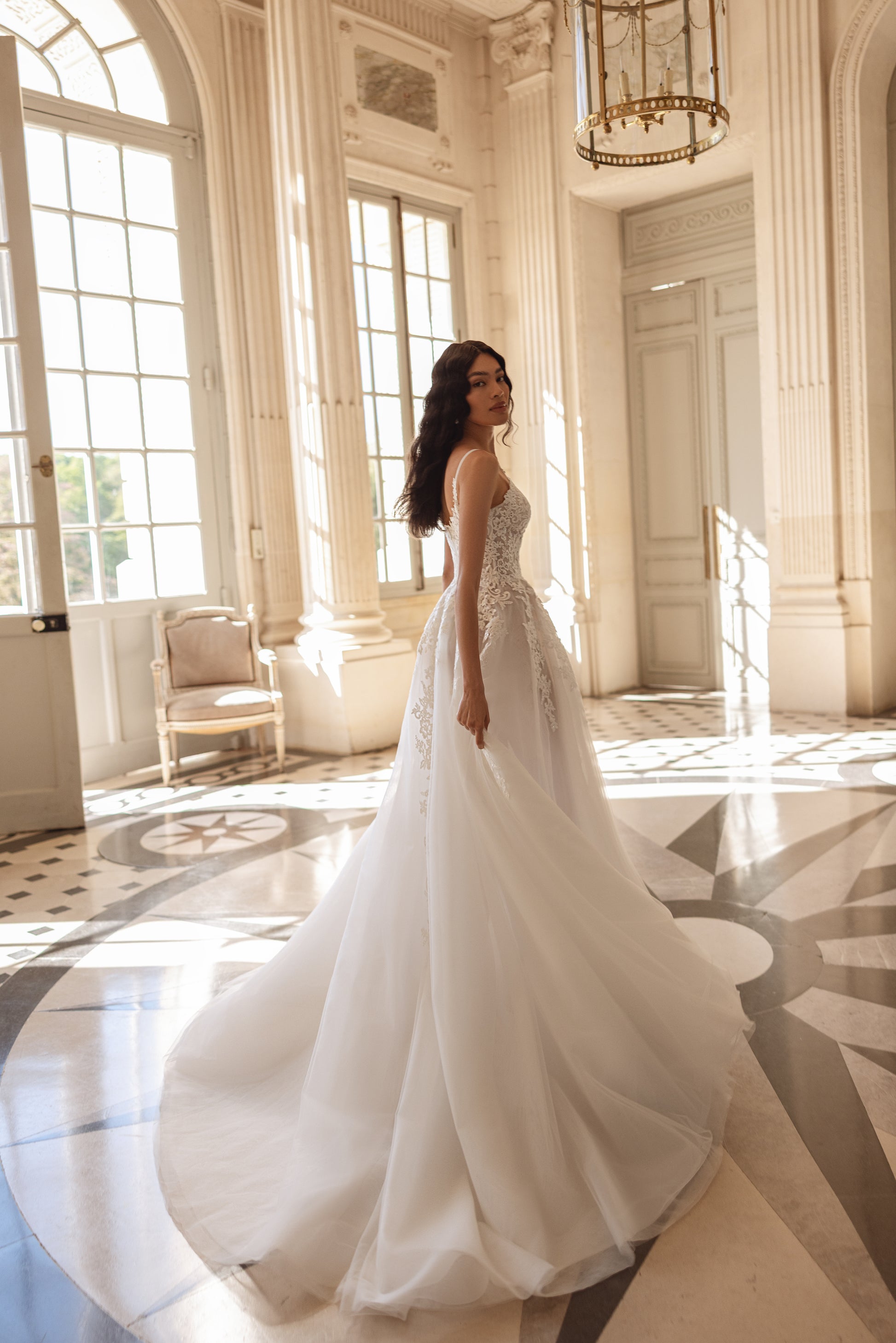 This ivory tulle dress floats like a whisper, with a mesh illusion neckline that subtly plunges to the waist. Sequined guipure lace adds texture and light, while the A-line silhouette maintains a classic, feminine shape. It’s a study in ethereal restraint — modern, elegant, and impossibly soft.