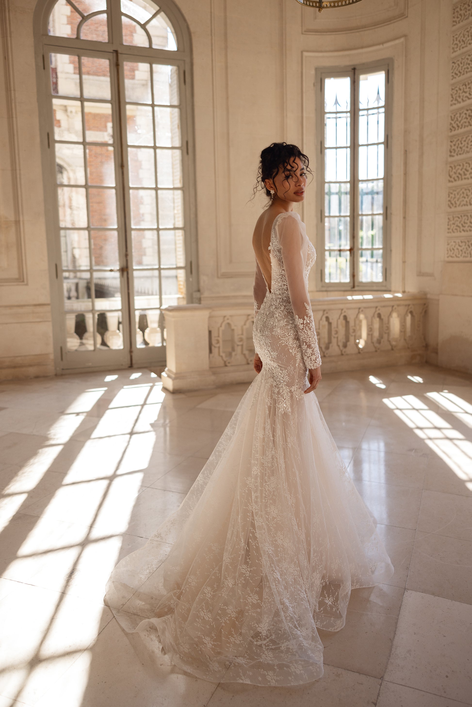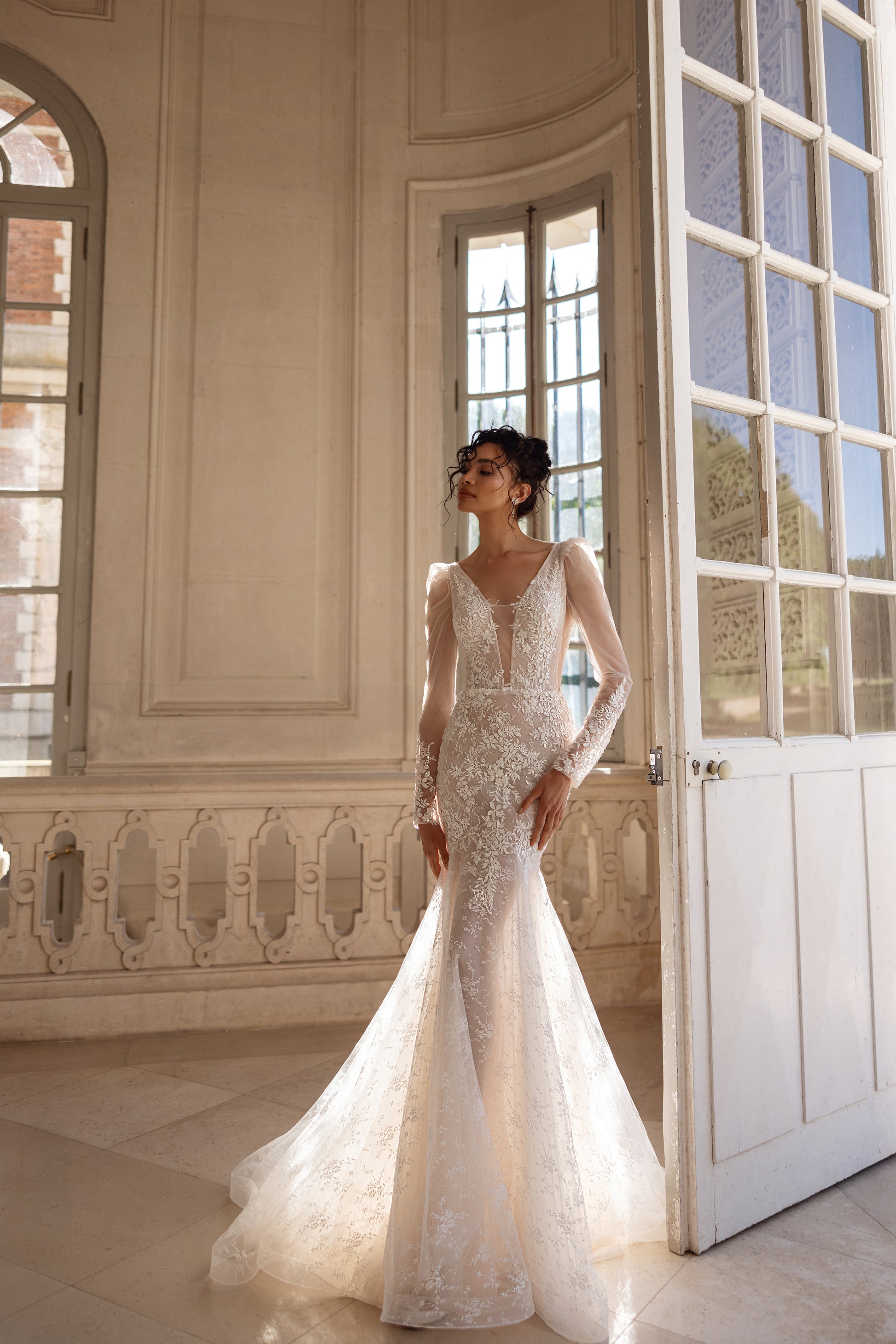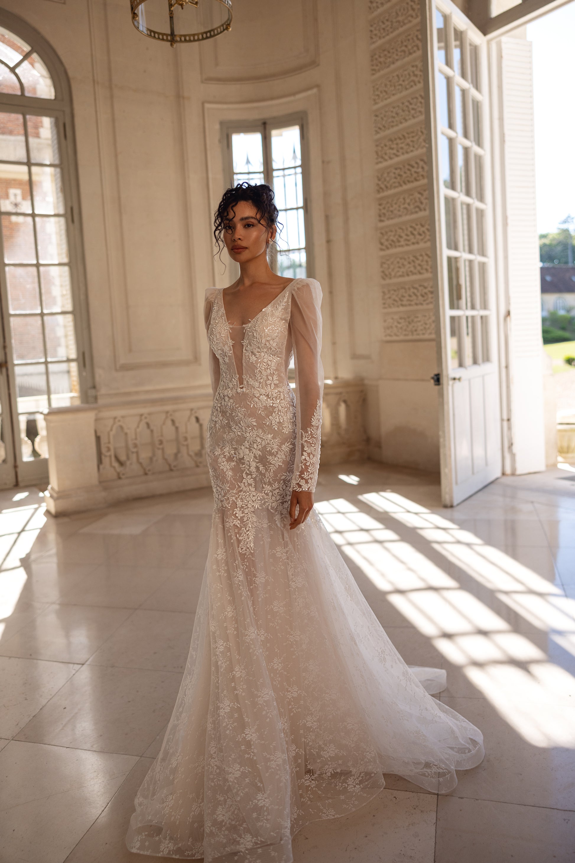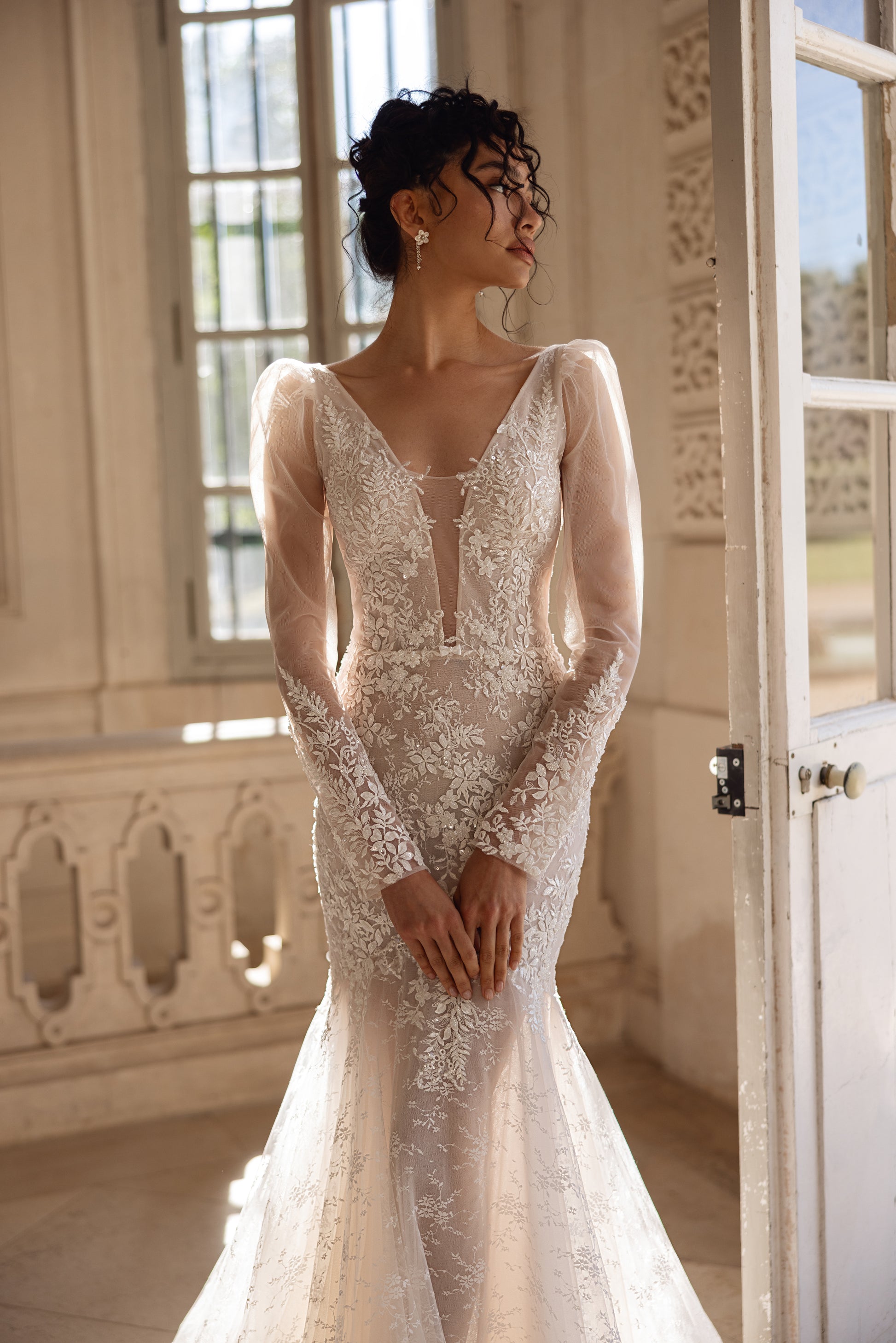 Florals come to life on this cappuccino mermaid gown. Made of 3D lace and beaded lace with sequins, it catches the light with subtle brilliance. With its flounced sleeves and illusion neckline, it feels refined yet daring. Transparent side panels and patterned mesh draw the eye with intelligent detail, while the overall shape holds romanticism in an unmistakably grown-up way.