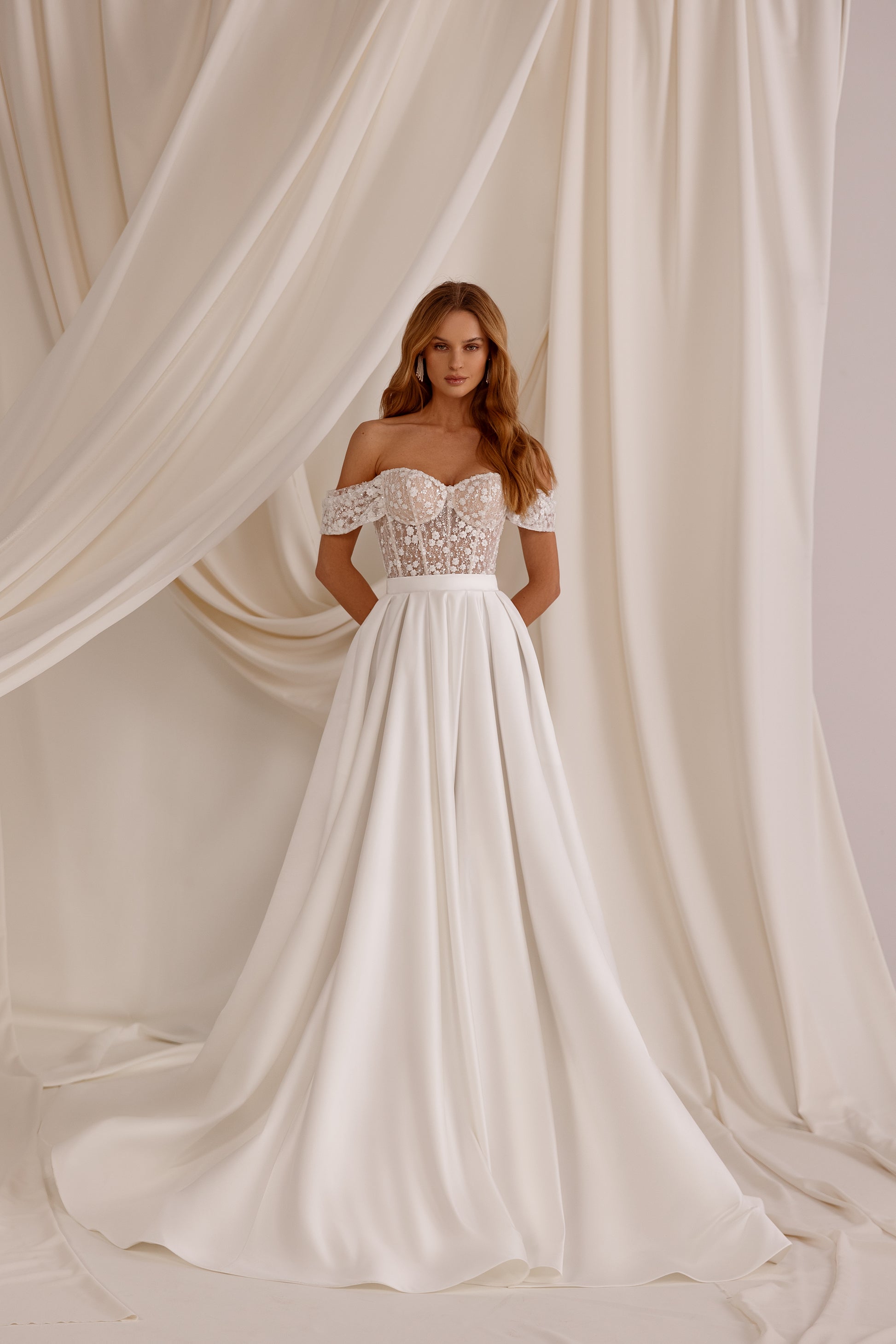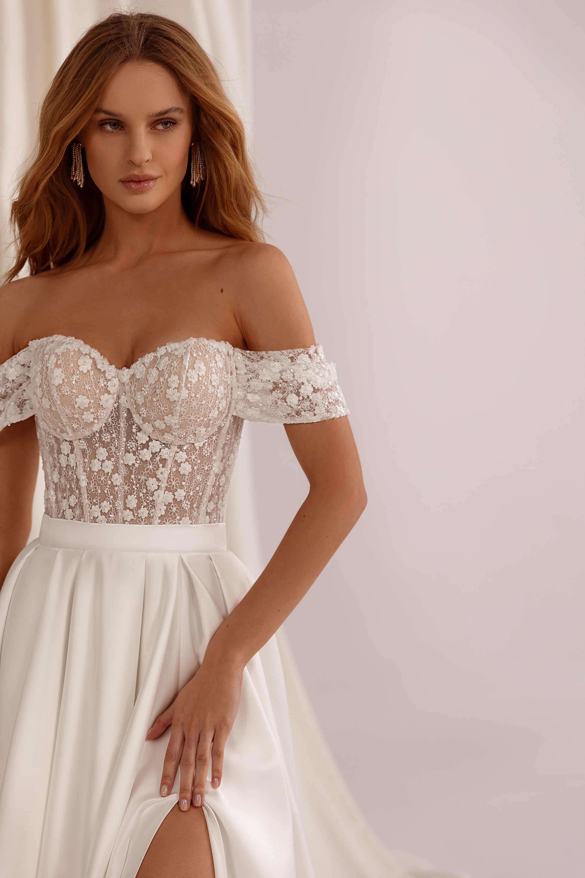 A tender celebration of springtime romance, this ivory satin gown features an off-shoulder neckline and a guipure bodice kissed with beads. Its flowing skirt and airy charm evoke a dream brought to life.