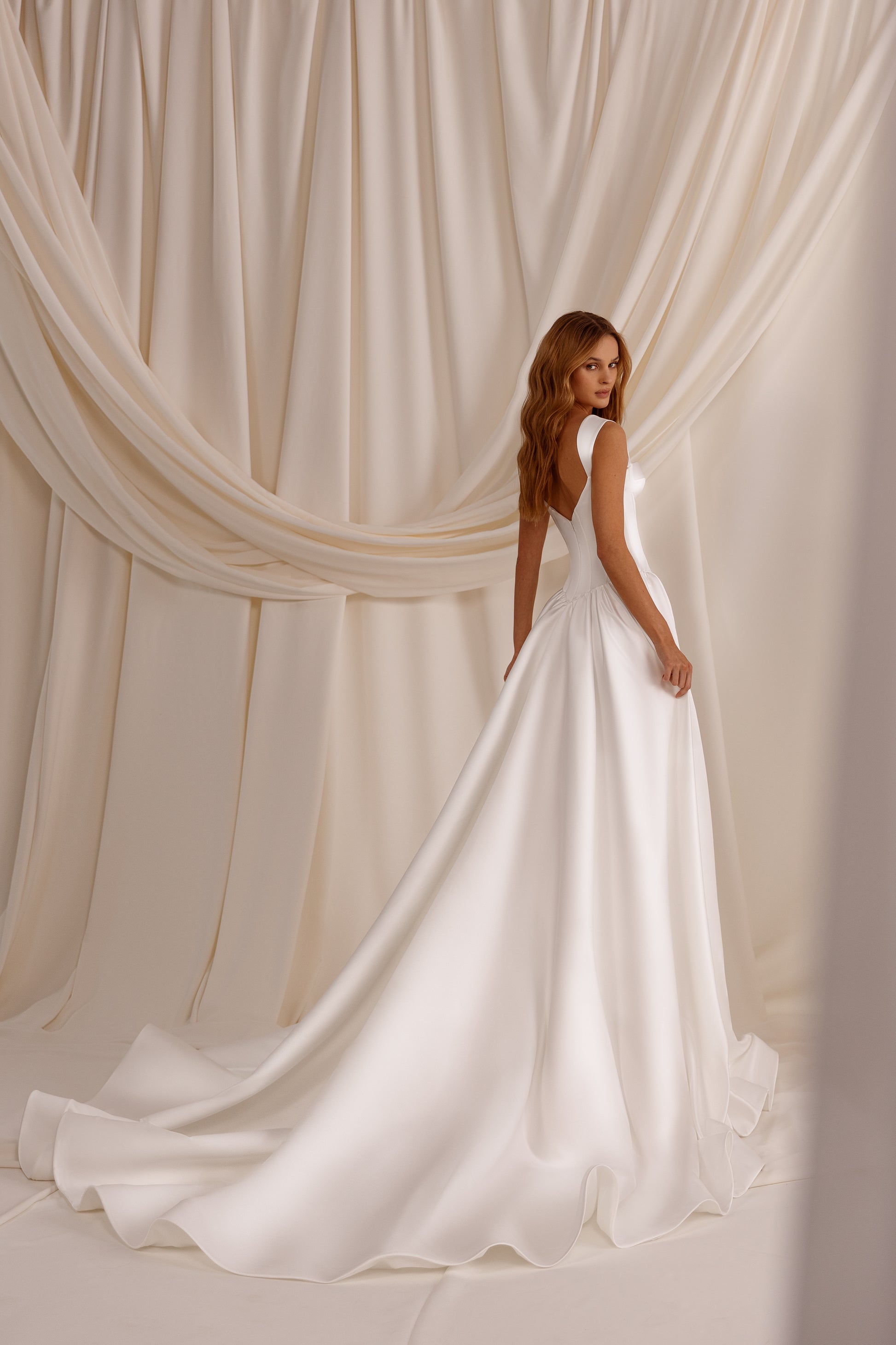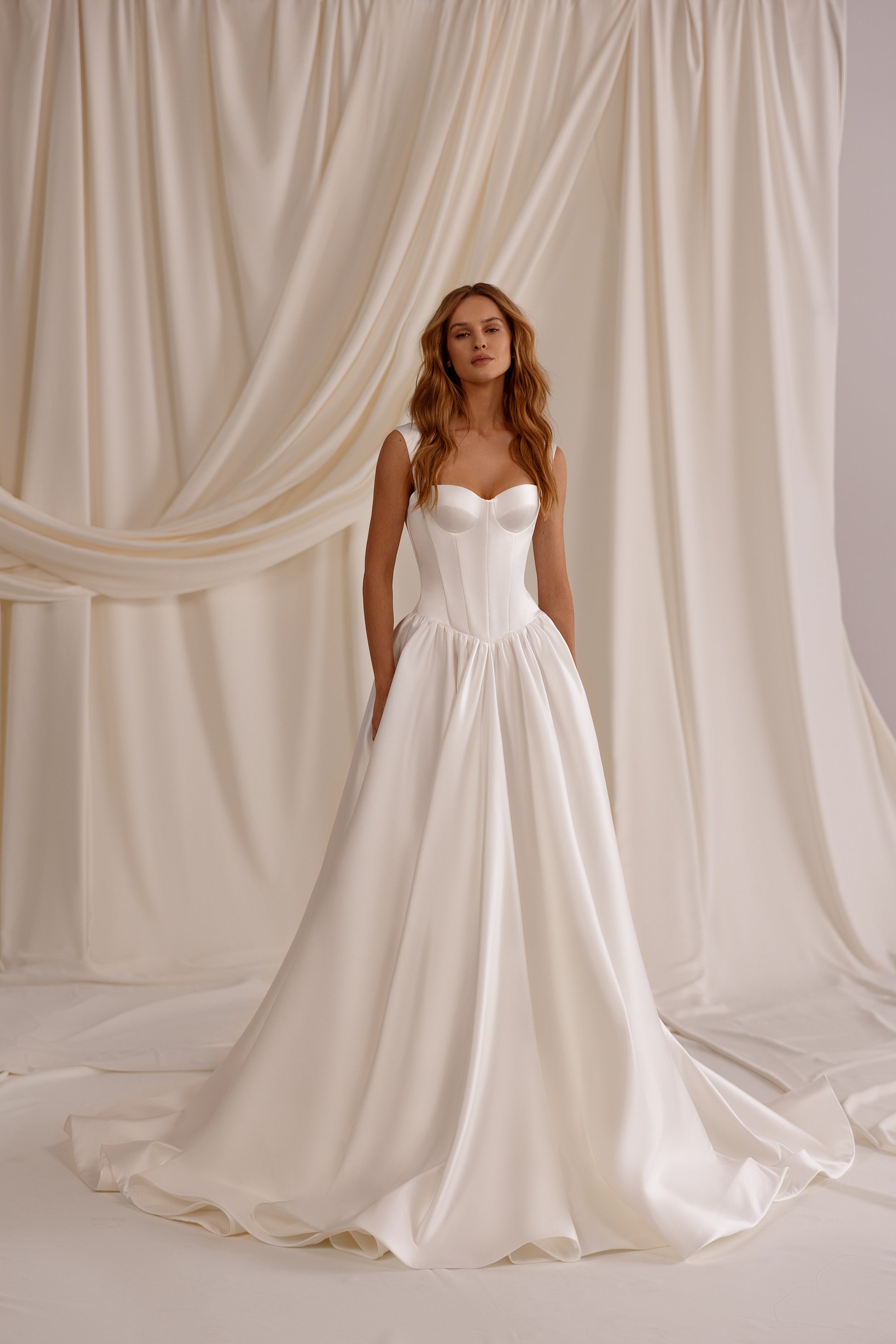 Majesty reimagined in ivory satin—this gown wows with wide, commanding straps, a sultry sweetheart neckline, and a daringly structured bodice. Fresh, romantic, and full of intrigue, it’s a call to embrace your boldest dreams.