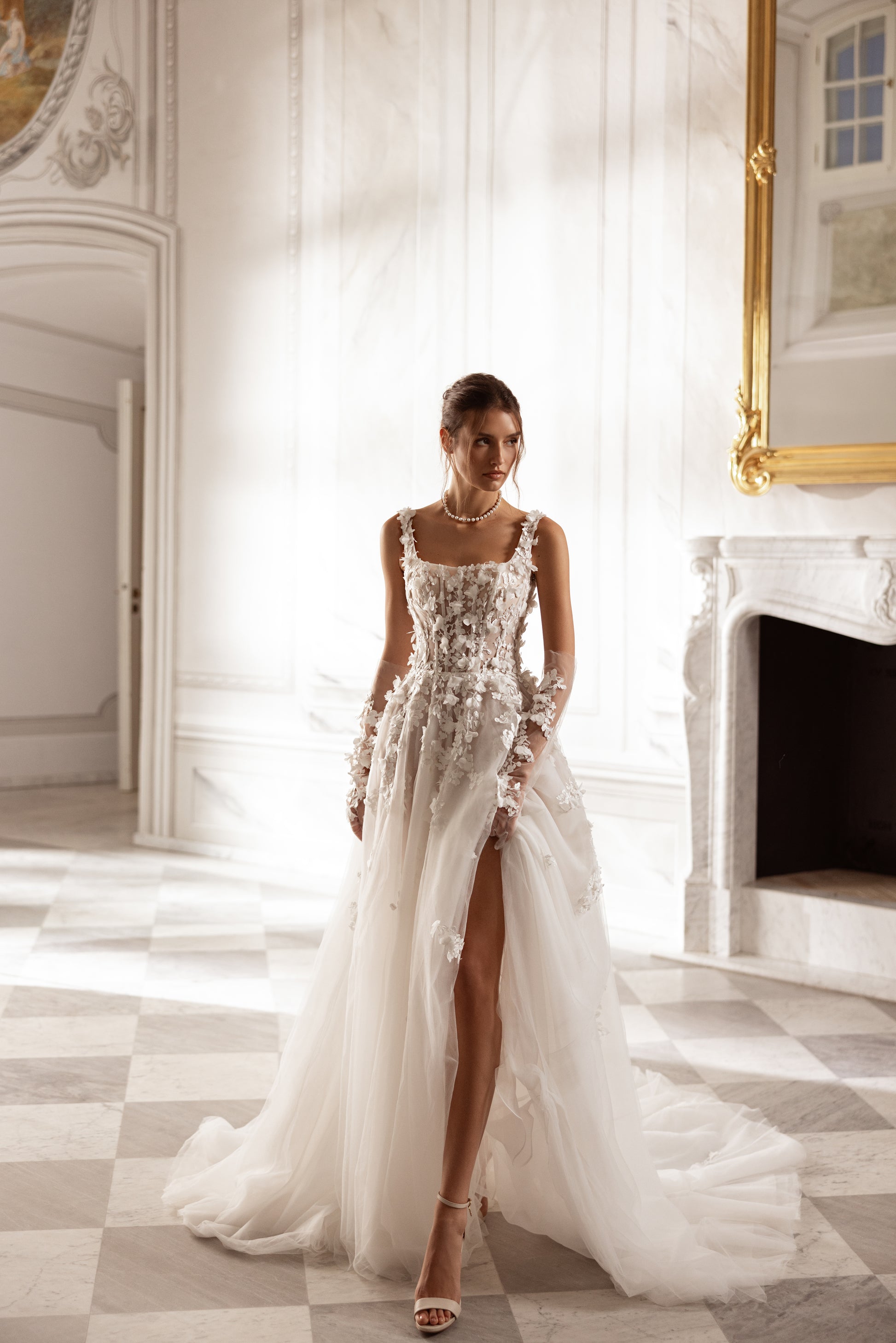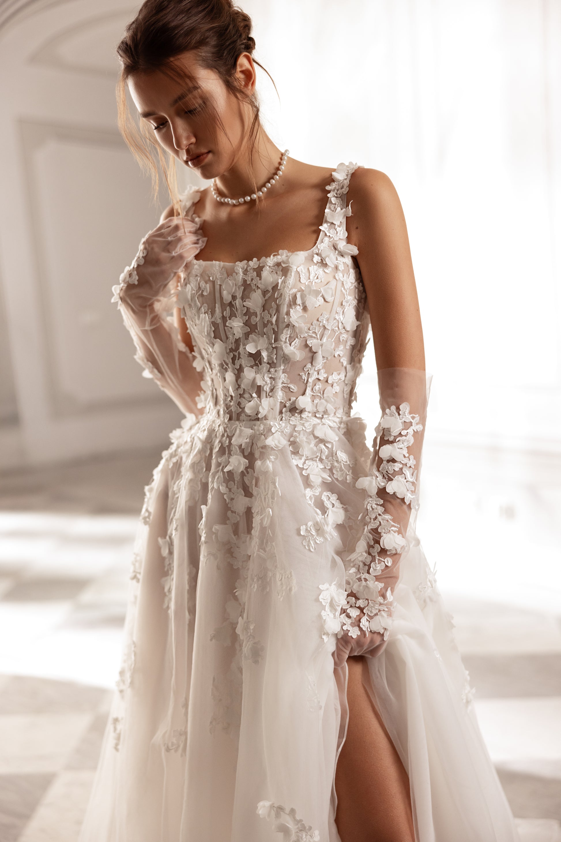 Made from ivory or cappuccino tulle with hand-decorated 3D lace flowers, this princess gown blooms with life. The square neckline and straps accentuate the shoulders and collarbones, while detachable gloves echo the floral motif. Airy and ethereal, this gown feels like a breath of fresh air, wrapped in the elegance of nature’s beauty.