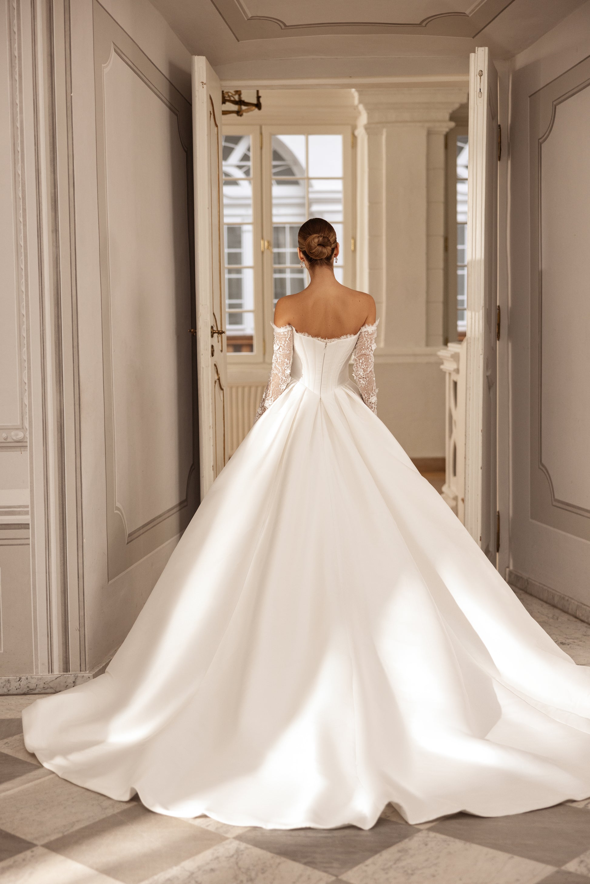 This princess gown in ivory mikado and beaded chantilly lace boasts a voluminous skirt with deep folds and a high slit, perfectly complemented by a well-boned corset and draped cups. The sweetheart neckline and off-shoulder design with transparent long sleeves adorned with flowers add a touch of sweetness to this dramatic look.