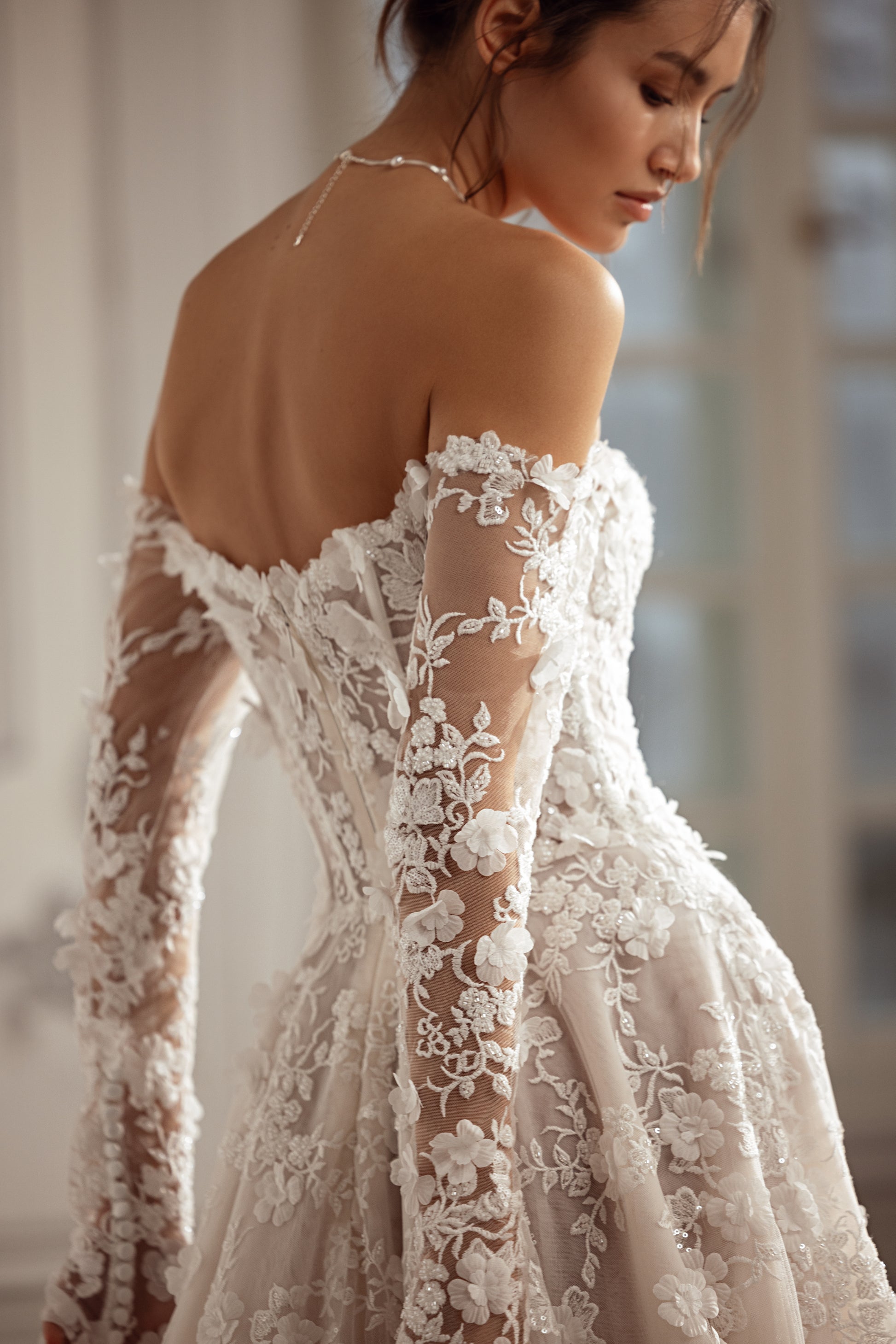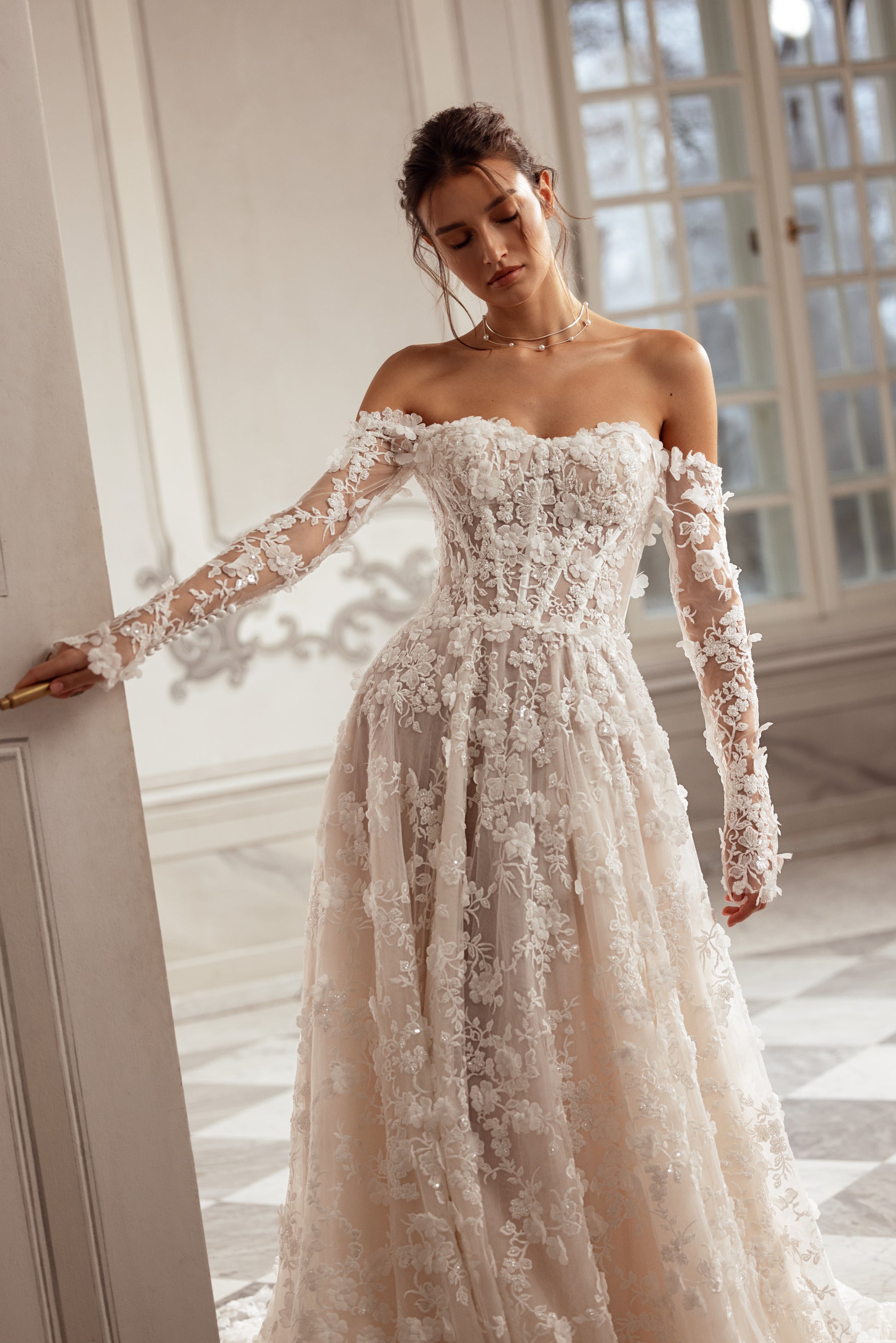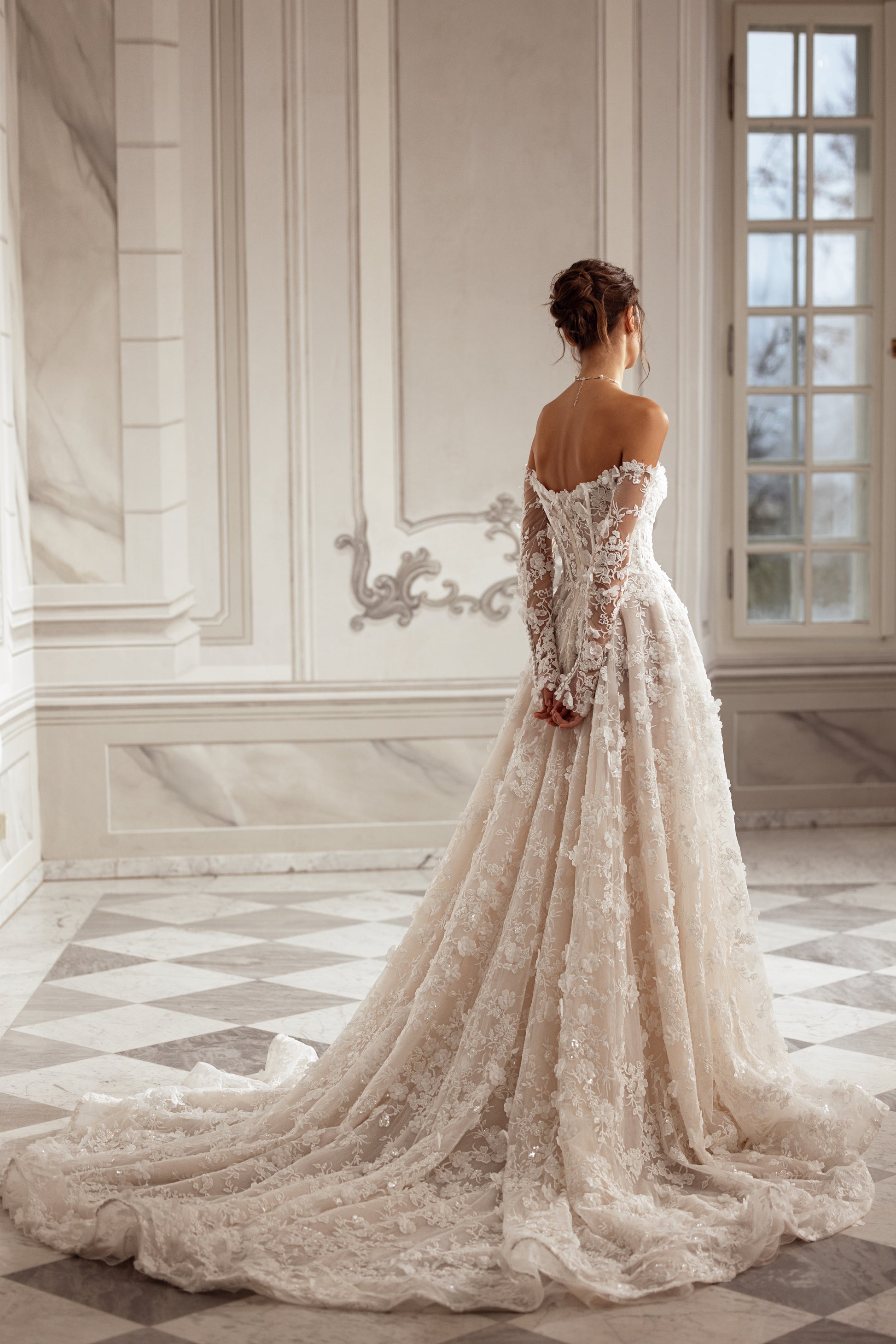 In cappuccino or ivory, this A-line gown is a masterpiece of 3D lace, with a hand-decorated corset and delicate decolletage. The sweetheart neckline, open shoulders, and long sleeves create a romantic and vibrating silhouette, offering a soft yet captivating elegance.