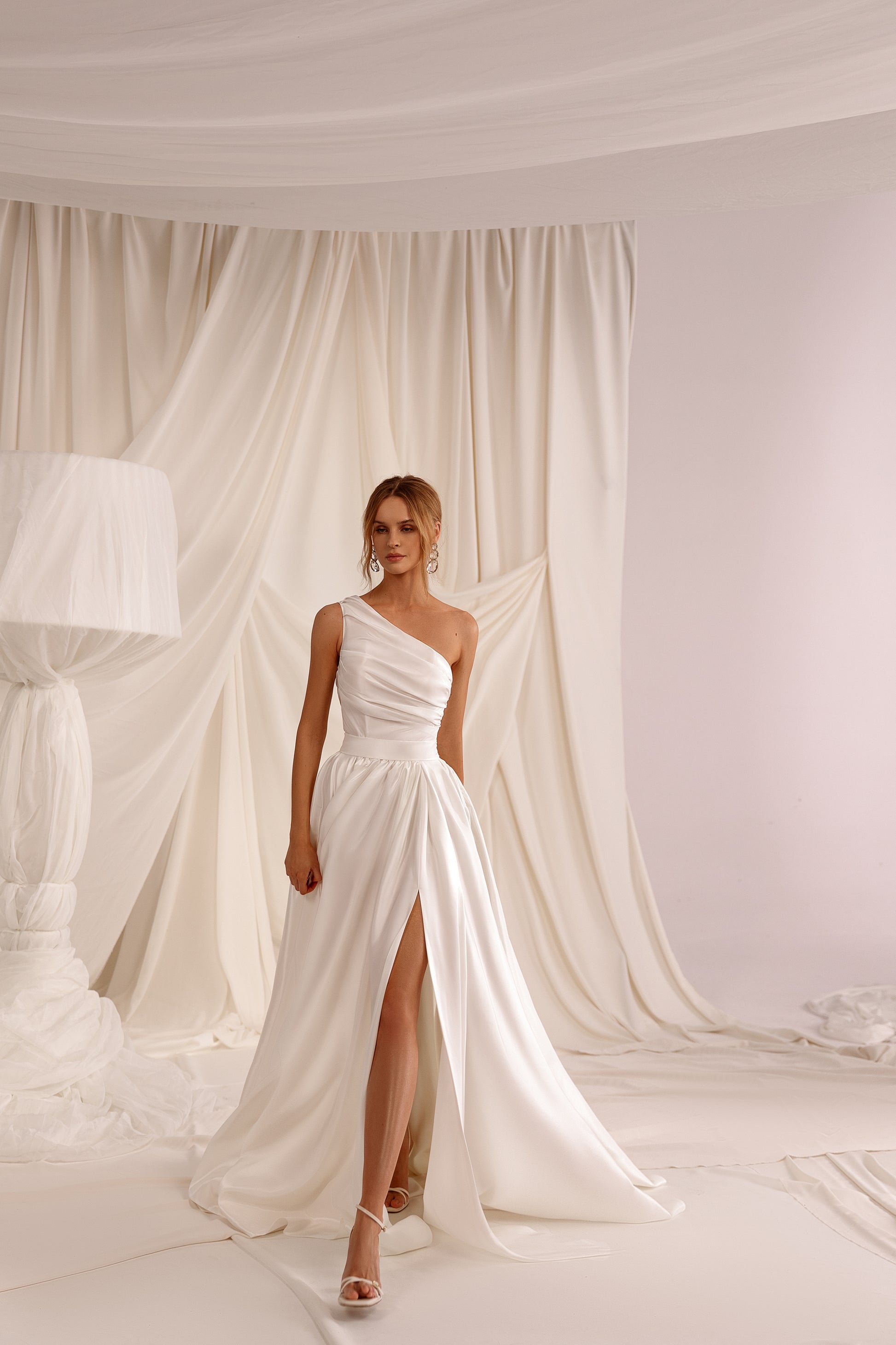 Ivory taffeta comes alive with soft draping and bold asymmetry. This gown flatters the waistline, while its delicate slit teases a glimpse of elegance. Sweet yet commanding, it feels like a goddess’s whisper carried on the wind.